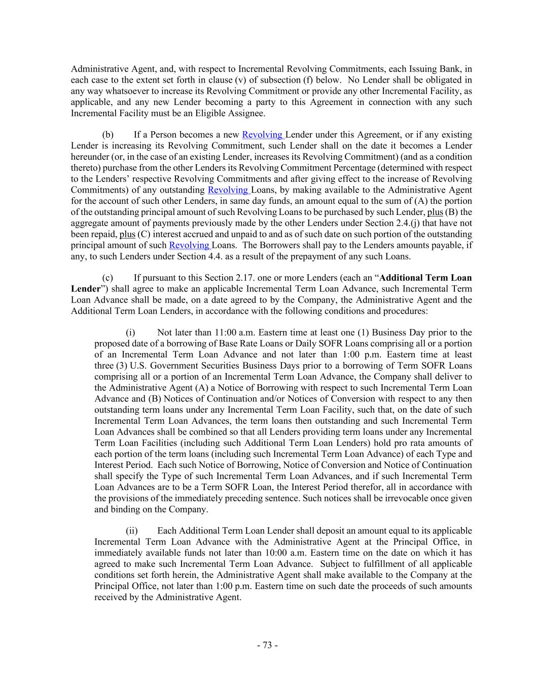 - 73 - Administrative Agent, and, with respect to Incremental Revolving Commitments, each Issuing Bank, in each case to the extent set forth in clause (v) of subsection (f) below. No Lender shall be obligated in any way whatsoever to increase its Revolving Commitment or provide any other Incremental Facility, as applicable, and any new Lender becoming a party to this Agreement in connection with any such Incremental Facility must be an Eligible Assignee. (b) If a Person becomes a new Revolving Lender under this Agreement, or if any existing Lender is increasing its Revolving Commitment, such Lender shall on the date it becomes a Lender hereunder (or, in the case of an existing Lender, increases its Revolving Commitment) (and as a condition thereto) purchase from the other Lenders its Revolving Commitment Percentage (determined with respect to the Lenders’ respective Revolving Commitments and after giving effect to the increase of Revolving Commitments) of any outstanding Revolving Loans, by making available to the Administrative Agent for the account of such other Lenders, in same day funds, an amount equal to the sum of (A) the portion of the outstanding principal amount of such Revolving Loans to be purchased by such Lender, plus (B) the aggregate amount of payments previously made by the other Lenders under Section 2.4.(j) that have not been repaid, plus (C) interest accrued and unpaid to and as of such date on such portion of the outstanding principal amount of such Revolving Loans. The Borrowers shall pay to the Lenders amounts payable, if any, to such Lenders under Section 4.4. as a result of the prepayment of any such Loans. (c) If pursuant to this Section 2.17. one or more Lenders (each an “Additional Term Loan Lender”) shall agree to make an applicable Incremental Term Loan Advance, such Incremental Term Loan Advance shall be made, on a date agreed to by the Company, the Administrative Agent and the Additional Term Loan Lenders, in accordance with the following conditions and procedures: (i) Not later than 11:00 a.m. Eastern time at least one (1) Business Day prior to the proposed date of a borrowing of Base Rate Loans or Daily SOFR Loans comprising all or a portion of an Incremental Term Loan Advance and not later than 1:00 p.m. Eastern time at least three (3) U.S. Government Securities Business Days prior to a borrowing of Term SOFR Loans comprising all or a portion of an Incremental Term Loan Advance, the Company shall deliver to the Administrative Agent (A) a Notice of Borrowing with respect to such Incremental Term Loan Advance and (B) Notices of Continuation and/or Notices of Conversion with respect to any then outstanding term loans under any Incremental Term Loan Facility, such that, on the date of such Incremental Term Loan Advances, the term loans then outstanding and such Incremental Term Loan Advances shall be combined so that all Lenders providing term loans under any Incremental Term Loan Facilities (including such Additional Term Loan Lenders) hold pro rata amounts of each portion of the term loans (including such Incremental Term Loan Advance) of each Type and Interest Period. Each such Notice of Borrowing, Notice of Conversion and Notice of Continuation shall specify the Type of such Incremental Term Loan Advances, and if such Incremental Term Loan Advances are to be a Term SOFR Loan, the Interest Period therefor, all in accordance with the provisions of the immediately preceding sentence. Such notices shall be irrevocable once given and binding on the Company. (ii) Each Additional Term Loan Lender shall deposit an amount equal to its applicable Incremental Term Loan Advance with the Administrative Agent at the Principal Office, in immediately available funds not later than 10:00 a.m. Eastern time on the date on which it has agreed to make such Incremental Term Loan Advance. Subject to fulfillment of all applicable conditions set forth herein, the Administrative Agent shall make available to the Company at the Principal Office, not later than 1:00 p.m. Eastern time on such date the proceeds of such amounts received by the Administrative Agent.