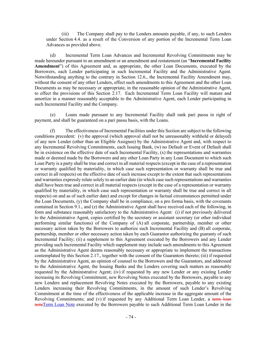 - 74 - (iii) The Company shall pay to the Lenders amounts payable, if any, to such Lenders under Section 4.4. as a result of the Conversion of any portion of the Incremental Term Loan Advances as provided above. (d) Incremental Term Loan Advances and Incremental Revolving Commitments may be made hereunder pursuant to an amendment or an amendment and restatement (an “Incremental Facility Amendment”) of this Agreement and, as appropriate, the other Loan Documents, executed by the Borrowers, each Lender participating in such Incremental Facility and the Administrative Agent. Notwithstanding anything to the contrary in Section 12.6., the Incremental Facility Amendment may, without the consent of any other Lenders, effect such amendments to this Agreement and the other Loan Documents as may be necessary or appropriate, in the reasonable opinion of the Administrative Agent, to effect the provisions of this Section 2.17. Each Incremental Term Loan Facility will mature and amortize in a manner reasonably acceptable to the Administrative Agent, each Lender participating in such Incremental Facility and the Company. (e) Loans made pursuant to any Incremental Facility shall rank pari passu in right of payment, and shall be guaranteed on a pari passu basis, with the Loans. (f) The effectiveness of Incremental Facilities under this Section are subject to the following conditions precedent: (v) the approval (which approval shall not be unreasonably withheld or delayed) of any new Lender (other than an Eligible Assignee) by the Administrative Agent and, with respect to any Incremental Revolving Commitments, each Issuing Bank, (w) no Default or Event of Default shall be in existence on the effective date of such Incremental Facility, (x) the representations and warranties made or deemed made by the Borrowers and any other Loan Party in any Loan Document to which such Loan Party is a party shall be true and correct in all material respects (except in the case of a representation or warranty qualified by materiality, in which case such representation or warranty shall be true and correct in all respects) on the effective date of such increase except to the extent that such representations and warranties expressly relate solely to an earlier date (in which case such representations and warranties shall have been true and correct in all material respects (except in the case of a representation or warranty qualified by materiality, in which case such representation or warranty shall be true and correct in all respects) on and as of such earlier date) and except for changes in factual circumstances permitted under the Loan Documents, (y) the Company shall be in compliance, on a pro forma basis, with the covenants contained in Section 9.1., and (z) the Administrative Agent shall have received each of the following, in form and substance reasonably satisfactory to the Administrative Agent: (i) if not previously delivered to the Administrative Agent, copies certified by the secretary or assistant secretary (or other individual performing similar functions) of the Company of (A) all corporate, partnership, member or other necessary action taken by the Borrowers to authorize such Incremental Facility and (B) all corporate, partnership, member or other necessary action taken by each Guarantor authorizing the guaranty of such Incremental Facility; (ii) a supplement to this Agreement executed by the Borrowers and any Lender providing such Incremental Facility which supplement may include such amendments to this Agreement as the Administrative Agent deems reasonably necessary or appropriate to implement the transactions contemplated by this Section 2.17., together with the consent of the Guarantors thereto; (iii) if requested by the Administrative Agent, an opinion of counsel to the Borrowers and the Guarantors, and addressed to the Administrative Agent, the Issuing Banks and the Lenders covering such matters as reasonably requested by the Administrative Agent; (iv) if requested by any new Lender or any existing Lender increasing its Revolving Commitment, new Revolving Notes executed by the Borrowers, payable to any new Lenders and replacement Revolving Notes executed by the Borrowers, payable to any existing Lenders increasing their Revolving Commitments, in the amount of such Lender’s Revolving Commitment at the time of the effectiveness of the applicable increase in the aggregate amount of the Revolving Commitments; and (v) if requested by any Additional Term Loan Lender, a term loan noteTerm Loan Note executed by the Borrowers payable to such Additional Term Loan Lender in the