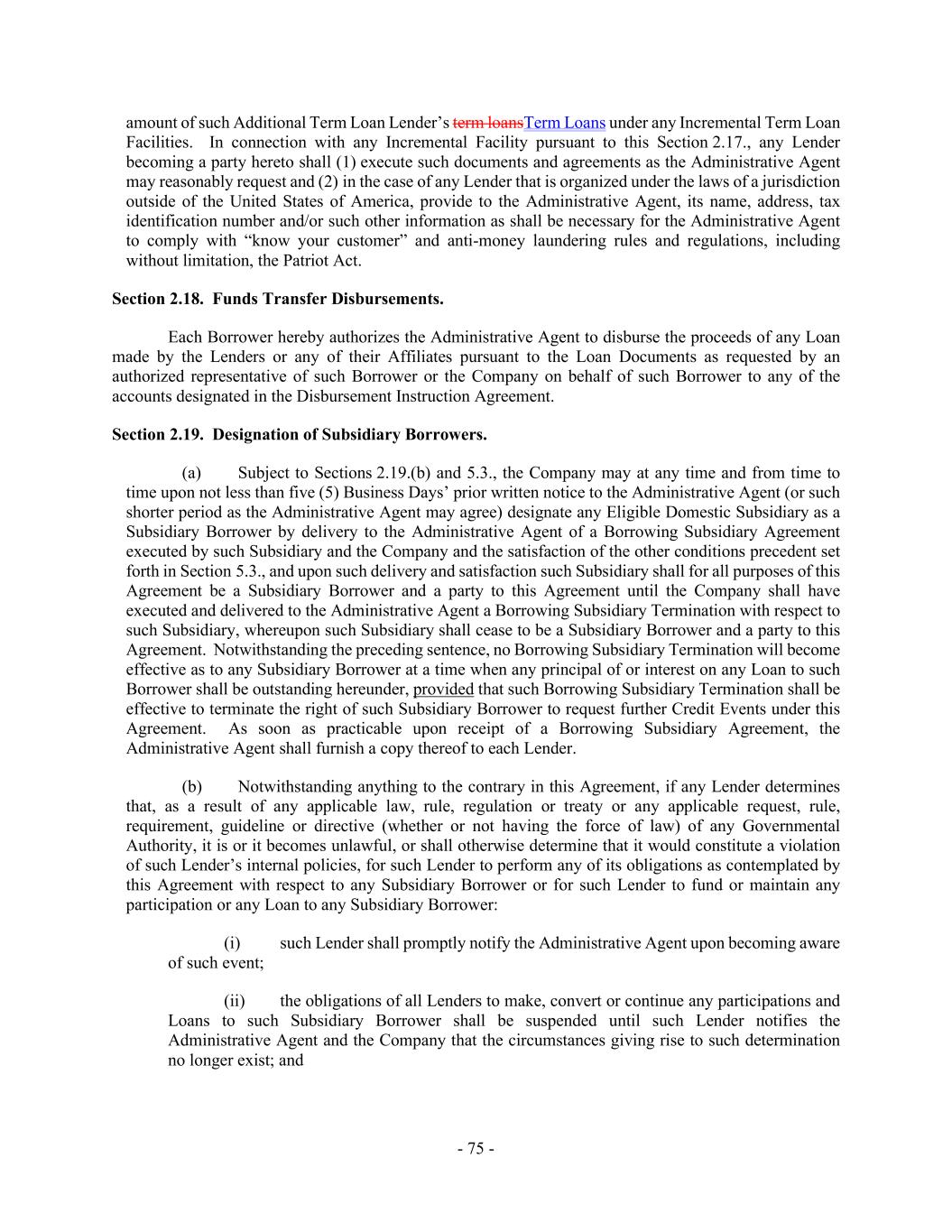 - 75 - amount of such Additional Term Loan Lender’s term loansTerm Loans under any Incremental Term Loan Facilities. In connection with any Incremental Facility pursuant to this Section 2.17., any Lender becoming a party hereto shall (1) execute such documents and agreements as the Administrative Agent may reasonably request and (2) in the case of any Lender that is organized under the laws of a jurisdiction outside of the United States of America, provide to the Administrative Agent, its name, address, tax identification number and/or such other information as shall be necessary for the Administrative Agent to comply with “know your customer” and anti-money laundering rules and regulations, including without limitation, the Patriot Act. Section 2.18. Funds Transfer Disbursements. Each Borrower hereby authorizes the Administrative Agent to disburse the proceeds of any Loan made by the Lenders or any of their Affiliates pursuant to the Loan Documents as requested by an authorized representative of such Borrower or the Company on behalf of such Borrower to any of the accounts designated in the Disbursement Instruction Agreement. Section 2.19. Designation of Subsidiary Borrowers. (a) Subject to Sections 2.19.(b) and 5.3., the Company may at any time and from time to time upon not less than five (5) Business Days’ prior written notice to the Administrative Agent (or such shorter period as the Administrative Agent may agree) designate any Eligible Domestic Subsidiary as a Subsidiary Borrower by delivery to the Administrative Agent of a Borrowing Subsidiary Agreement executed by such Subsidiary and the Company and the satisfaction of the other conditions precedent set forth in Section 5.3., and upon such delivery and satisfaction such Subsidiary shall for all purposes of this Agreement be a Subsidiary Borrower and a party to this Agreement until the Company shall have executed and delivered to the Administrative Agent a Borrowing Subsidiary Termination with respect to such Subsidiary, whereupon such Subsidiary shall cease to be a Subsidiary Borrower and a party to this Agreement. Notwithstanding the preceding sentence, no Borrowing Subsidiary Termination will become effective as to any Subsidiary Borrower at a time when any principal of or interest on any Loan to such Borrower shall be outstanding hereunder, provided that such Borrowing Subsidiary Termination shall be effective to terminate the right of such Subsidiary Borrower to request further Credit Events under this Agreement. As soon as practicable upon receipt of a Borrowing Subsidiary Agreement, the Administrative Agent shall furnish a copy thereof to each Lender. (b) Notwithstanding anything to the contrary in this Agreement, if any Lender determines that, as a result of any applicable law, rule, regulation or treaty or any applicable request, rule, requirement, guideline or directive (whether or not having the force of law) of any Governmental Authority, it is or it becomes unlawful, or shall otherwise determine that it would constitute a violation of such Lender’s internal policies, for such Lender to perform any of its obligations as contemplated by this Agreement with respect to any Subsidiary Borrower or for such Lender to fund or maintain any participation or any Loan to any Subsidiary Borrower: (i) such Lender shall promptly notify the Administrative Agent upon becoming aware of such event; (ii) the obligations of all Lenders to make, convert or continue any participations and Loans to such Subsidiary Borrower shall be suspended until such Lender notifies the Administrative Agent and the Company that the circumstances giving rise to such determination no longer exist; and