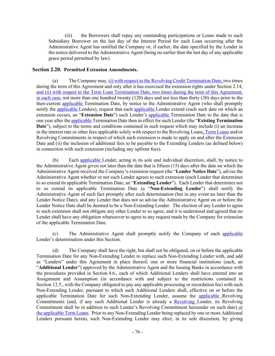 - 76 - (iii) the Borrowers shall repay any outstanding participations or Loans made to such Subsidiary Borrower on the last day of the Interest Period for each Loan occurring after the Administrative Agent has notified the Company or, if earlier, the date specified by the Lender in the notice delivered to the Administrative Agent (being no earlier than the last day of any applicable grace period permitted by law). Section 2.20. Permitted Extension Amendments. (a) The Company may, (i) with respect to the Revolving Credit Termination Date, two times during the term of this Agreement and only after it has exercised the extension rights under Section 2.14. and (ii) with respect to the Term Loan Termination Date, two times during the term of this Agreement, in each case, not more than one hundred twenty (120) days and not less than thirty (30) days prior to the then-current applicable Termination Date, by notice to the Administrative Agent (who shall promptly notify the applicable Lenders), request that each applicable Lender extend (each such date on which an extension occurs, an “Extension Date”) such Lender’s applicable Termination Date to the date that is one year after the applicable Termination Date then in effect for such Lender (the “Existing Termination Date”), subject to the terms and conditions contained in such request which may include (i) an increase in the interest rate or other fees applicable solely with respect to the Revolving Loans, Term Loans and/or Revolving Commitments in respect of which such extension is made to apply on and after the Extension Date and (ii) the inclusion of additional fees to be payable to the Extending Lenders (as defined below) in connection with such extension (including any upfront fees). (b) Each applicable Lender, acting in its sole and individual discretion, shall, by notice to the Administrative Agent given not later than the date that is fifteen (15) days after the date on which the Administrative Agent received the Company’s extension request (the “Lender Notice Date”), advise the Administrative Agent whether or not such Lender agrees to such extension (each Lender that determines to so extend its applicable Termination Date, an “Extending Lender”). Each Lender that determines not to so extend its applicable Termination Date (a “Non-Extending Lender”) shall notify the Administrative Agent of such fact promptly after such determination (but in any event no later than the Lender Notice Date), and any Lender that does not so advise the Administrative Agent on or before the Lender Notice Date shall be deemed to be a Non-Extending Lender. The election of any Lender to agree to such extension shall not obligate any other Lender to so agree, and it is understood and agreed that no Lender shall have any obligation whatsoever to agree to any request made by the Company for extension of the applicable Termination Date. (c) The Administrative Agent shall promptly notify the Company of each applicable Lender’s determination under this Section. (d) The Company shall have the right, but shall not be obligated, on or before the applicable Termination Date for any Non-Extending Lender to replace such Non-Extending Lender with, and add as “Lenders” under this Agreement in place thereof, one or more financial institutions (each, an “Additional Lender”) approved by the Administrative Agent and the Issuing Banks in accordance with the procedures provided in Section 4.6., each of which Additional Lenders shall have entered into an Assignment and Assumption (in accordance with and subject to the restrictions contained in Section 12.5., with the Company obligated to pay any applicable processing or recordation fee) with such Non-Extending Lender, pursuant to which such Additional Lenders shall, effective on or before the applicable Termination Date for such Non-Extending Lender, assume the applicable Revolving Commitments (and, if any such Additional Lender is already a Revolving Lender, its Revolving Commitment shall be in addition to such Lender’s Revolving Commitment hereunder on such date) or the applicable Term Loans. Prior to any Non-Extending Lender being replaced by one or more Additional Lenders pursuant hereto, such Non-Extending Lender may elect, in its sole discretion, by giving