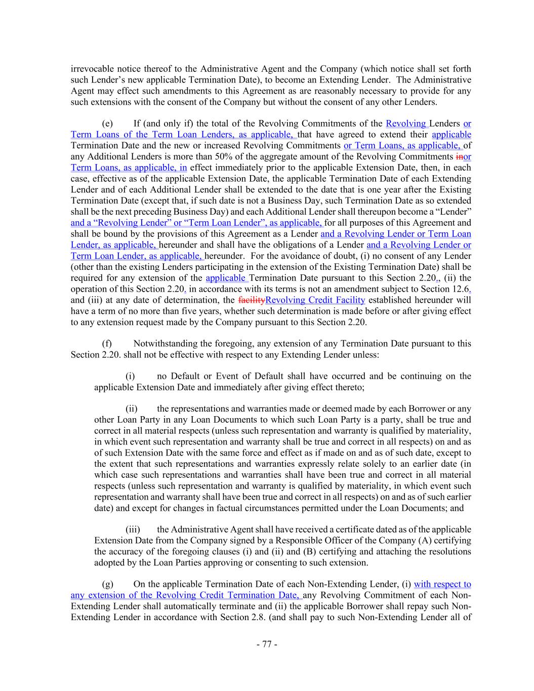 - 77 - irrevocable notice thereof to the Administrative Agent and the Company (which notice shall set forth such Lender’s new applicable Termination Date), to become an Extending Lender. The Administrative Agent may effect such amendments to this Agreement as are reasonably necessary to provide for any such extensions with the consent of the Company but without the consent of any other Lenders. (e) If (and only if) the total of the Revolving Commitments of the Revolving Lenders or Term Loans of the Term Loan Lenders, as applicable, that have agreed to extend their applicable Termination Date and the new or increased Revolving Commitments or Term Loans, as applicable, of any Additional Lenders is more than 50% of the aggregate amount of the Revolving Commitments inor Term Loans, as applicable, in effect immediately prior to the applicable Extension Date, then, in each case, effective as of the applicable Extension Date, the applicable Termination Date of each Extending Lender and of each Additional Lender shall be extended to the date that is one year after the Existing Termination Date (except that, if such date is not a Business Day, such Termination Date as so extended shall be the next preceding Business Day) and each Additional Lender shall thereupon become a “Lender” and a “Revolving Lender” or “Term Loan Lender”, as applicable, for all purposes of this Agreement and shall be bound by the provisions of this Agreement as a Lender and a Revolving Lender or Term Loan Lender, as applicable, hereunder and shall have the obligations of a Lender and a Revolving Lender or Term Loan Lender, as applicable, hereunder. For the avoidance of doubt, (i) no consent of any Lender (other than the existing Lenders participating in the extension of the Existing Termination Date) shall be required for any extension of the applicable Termination Date pursuant to this Section 2.20., (ii) the operation of this Section 2.20. in accordance with its terms is not an amendment subject to Section 12.6. and (iii) at any date of determination, the facilityRevolving Credit Facility established hereunder will have a term of no more than five years, whether such determination is made before or after giving effect to any extension request made by the Company pursuant to this Section 2.20. (f) Notwithstanding the foregoing, any extension of any Termination Date pursuant to this Section 2.20. shall not be effective with respect to any Extending Lender unless: (i) no Default or Event of Default shall have occurred and be continuing on the applicable Extension Date and immediately after giving effect thereto; (ii) the representations and warranties made or deemed made by each Borrower or any other Loan Party in any Loan Documents to which such Loan Party is a party, shall be true and correct in all material respects (unless such representation and warranty is qualified by materiality, in which event such representation and warranty shall be true and correct in all respects) on and as of such Extension Date with the same force and effect as if made on and as of such date, except to the extent that such representations and warranties expressly relate solely to an earlier date (in which case such representations and warranties shall have been true and correct in all material respects (unless such representation and warranty is qualified by materiality, in which event such representation and warranty shall have been true and correct in all respects) on and as of such earlier date) and except for changes in factual circumstances permitted under the Loan Documents; and (iii) the Administrative Agent shall have received a certificate dated as of the applicable Extension Date from the Company signed by a Responsible Officer of the Company (A) certifying the accuracy of the foregoing clauses (i) and (ii) and (B) certifying and attaching the resolutions adopted by the Loan Parties approving or consenting to such extension. (g) On the applicable Termination Date of each Non-Extending Lender, (i) with respect to any extension of the Revolving Credit Termination Date, any Revolving Commitment of each Non- Extending Lender shall automatically terminate and (ii) the applicable Borrower shall repay such Non- Extending Lender in accordance with Section 2.8. (and shall pay to such Non-Extending Lender all of