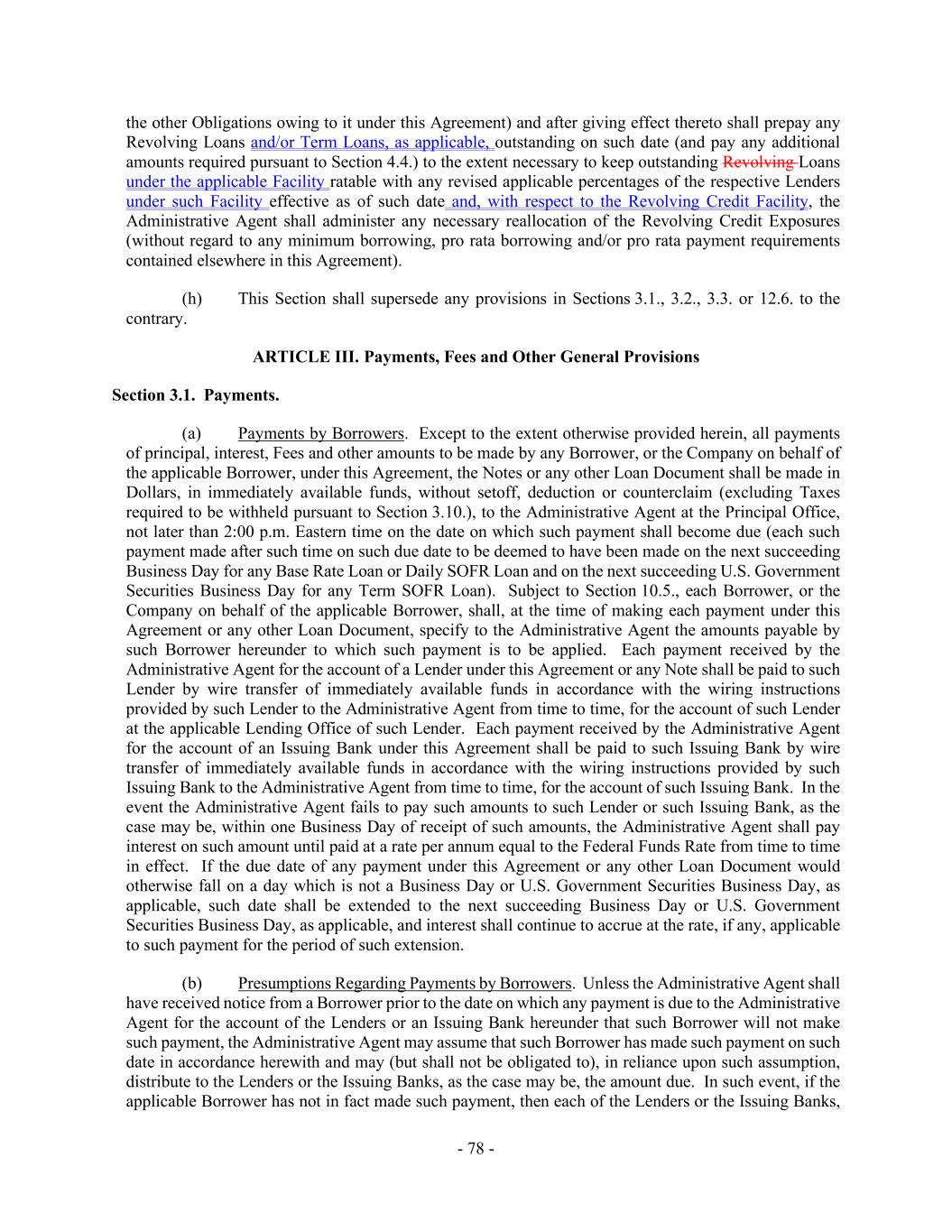 - 78 - the other Obligations owing to it under this Agreement) and after giving effect thereto shall prepay any Revolving Loans and/or Term Loans, as applicable, outstanding on such date (and pay any additional amounts required pursuant to Section 4.4.) to the extent necessary to keep outstanding Revolving Loans under the applicable Facility ratable with any revised applicable percentages of the respective Lenders under such Facility effective as of such date and, with respect to the Revolving Credit Facility, the Administrative Agent shall administer any necessary reallocation of the Revolving Credit Exposures (without regard to any minimum borrowing, pro rata borrowing and/or pro rata payment requirements contained elsewhere in this Agreement). (h) This Section shall supersede any provisions in Sections 3.1., 3.2., 3.3. or 12.6. to the contrary. ARTICLE III. Payments, Fees and Other General Provisions Section 3.1. Payments. (a) Payments by Borrowers. Except to the extent otherwise provided herein, all payments of principal, interest, Fees and other amounts to be made by any Borrower, or the Company on behalf of the applicable Borrower, under this Agreement, the Notes or any other Loan Document shall be made in Dollars, in immediately available funds, without setoff, deduction or counterclaim (excluding Taxes required to be withheld pursuant to Section 3.10.), to the Administrative Agent at the Principal Office, not later than 2:00 p.m. Eastern time on the date on which such payment shall become due (each such payment made after such time on such due date to be deemed to have been made on the next succeeding Business Day for any Base Rate Loan or Daily SOFR Loan and on the next succeeding U.S. Government Securities Business Day for any Term SOFR Loan). Subject to Section 10.5., each Borrower, or the Company on behalf of the applicable Borrower, shall, at the time of making each payment under this Agreement or any other Loan Document, specify to the Administrative Agent the amounts payable by such Borrower hereunder to which such payment is to be applied. Each payment received by the Administrative Agent for the account of a Lender under this Agreement or any Note shall be paid to such Lender by wire transfer of immediately available funds in accordance with the wiring instructions provided by such Lender to the Administrative Agent from time to time, for the account of such Lender at the applicable Lending Office of such Lender. Each payment received by the Administrative Agent for the account of an Issuing Bank under this Agreement shall be paid to such Issuing Bank by wire transfer of immediately available funds in accordance with the wiring instructions provided by such Issuing Bank to the Administrative Agent from time to time, for the account of such Issuing Bank. In the event the Administrative Agent fails to pay such amounts to such Lender or such Issuing Bank, as the case may be, within one Business Day of receipt of such amounts, the Administrative Agent shall pay interest on such amount until paid at a rate per annum equal to the Federal Funds Rate from time to time in effect. If the due date of any payment under this Agreement or any other Loan Document would otherwise fall on a day which is not a Business Day or U.S. Government Securities Business Day, as applicable, such date shall be extended to the next succeeding Business Day or U.S. Government Securities Business Day, as applicable, and interest shall continue to accrue at the rate, if any, applicable to such payment for the period of such extension. (b) Presumptions Regarding Payments by Borrowers. Unless the Administrative Agent shall have received notice from a Borrower prior to the date on which any payment is due to the Administrative Agent for the account of the Lenders or an Issuing Bank hereunder that such Borrower will not make such payment, the Administrative Agent may assume that such Borrower has made such payment on such date in accordance herewith and may (but shall not be obligated to), in reliance upon such assumption, distribute to the Lenders or the Issuing Banks, as the case may be, the amount due. In such event, if the applicable Borrower has not in fact made such payment, then each of the Lenders or the Issuing Banks,
