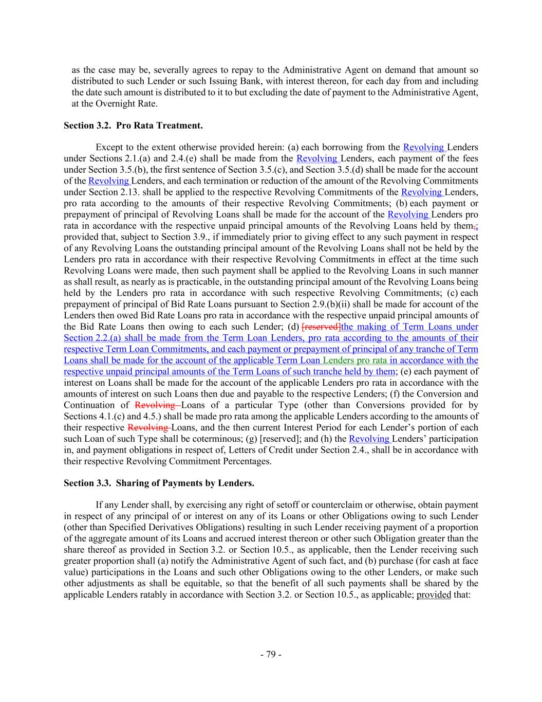 - 79 - as the case may be, severally agrees to repay to the Administrative Agent on demand that amount so distributed to such Lender or such Issuing Bank, with interest thereon, for each day from and including the date such amount is distributed to it to but excluding the date of payment to the Administrative Agent, at the Overnight Rate. Section 3.2. Pro Rata Treatment. Except to the extent otherwise provided herein: (a) each borrowing from the Revolving Lenders under Sections 2.1.(a) and 2.4.(e) shall be made from the Revolving Lenders, each payment of the fees under Section 3.5.(b), the first sentence of Section 3.5.(c), and Section 3.5.(d) shall be made for the account of the Revolving Lenders, and each termination or reduction of the amount of the Revolving Commitments under Section 2.13. shall be applied to the respective Revolving Commitments of the Revolving Lenders, pro rata according to the amounts of their respective Revolving Commitments; (b) each payment or prepayment of principal of Revolving Loans shall be made for the account of the Revolving Lenders pro rata in accordance with the respective unpaid principal amounts of the Revolving Loans held by them,; provided that, subject to Section 3.9., if immediately prior to giving effect to any such payment in respect of any Revolving Loans the outstanding principal amount of the Revolving Loans shall not be held by the Lenders pro rata in accordance with their respective Revolving Commitments in effect at the time such Revolving Loans were made, then such payment shall be applied to the Revolving Loans in such manner as shall result, as nearly as is practicable, in the outstanding principal amount of the Revolving Loans being held by the Lenders pro rata in accordance with such respective Revolving Commitments; (c) each prepayment of principal of Bid Rate Loans pursuant to Section 2.9.(b)(ii) shall be made for account of the Lenders then owed Bid Rate Loans pro rata in accordance with the respective unpaid principal amounts of the Bid Rate Loans then owing to each such Lender; (d) [reserved]the making of Term Loans under Section 2.2.(a) shall be made from the Term Loan Lenders, pro rata according to the amounts of their respective Term Loan Commitments, and each payment or prepayment of principal of any tranche of Term Loans shall be made for the account of the applicable Term Loan Lenders pro rata in accordance with the respective unpaid principal amounts of the Term Loans of such tranche held by them; (e) each payment of interest on Loans shall be made for the account of the applicable Lenders pro rata in accordance with the amounts of interest on such Loans then due and payable to the respective Lenders; (f) the Conversion and Continuation of Revolving Loans of a particular Type (other than Conversions provided for by Sections 4.1.(c) and 4.5.) shall be made pro rata among the applicable Lenders according to the amounts of their respective Revolving Loans, and the then current Interest Period for each Lender’s portion of each such Loan of such Type shall be coterminous; (g) [reserved]; and (h) the Revolving Lenders’ participation in, and payment obligations in respect of, Letters of Credit under Section 2.4., shall be in accordance with their respective Revolving Commitment Percentages. Section 3.3. Sharing of Payments by Lenders. If any Lender shall, by exercising any right of setoff or counterclaim or otherwise, obtain payment in respect of any principal of or interest on any of its Loans or other Obligations owing to such Lender (other than Specified Derivatives Obligations) resulting in such Lender receiving payment of a proportion of the aggregate amount of its Loans and accrued interest thereon or other such Obligation greater than the share thereof as provided in Section 3.2. or Section 10.5., as applicable, then the Lender receiving such greater proportion shall (a) notify the Administrative Agent of such fact, and (b) purchase (for cash at face value) participations in the Loans and such other Obligations owing to the other Lenders, or make such other adjustments as shall be equitable, so that the benefit of all such payments shall be shared by the applicable Lenders ratably in accordance with Section 3.2. or Section 10.5., as applicable; provided that: