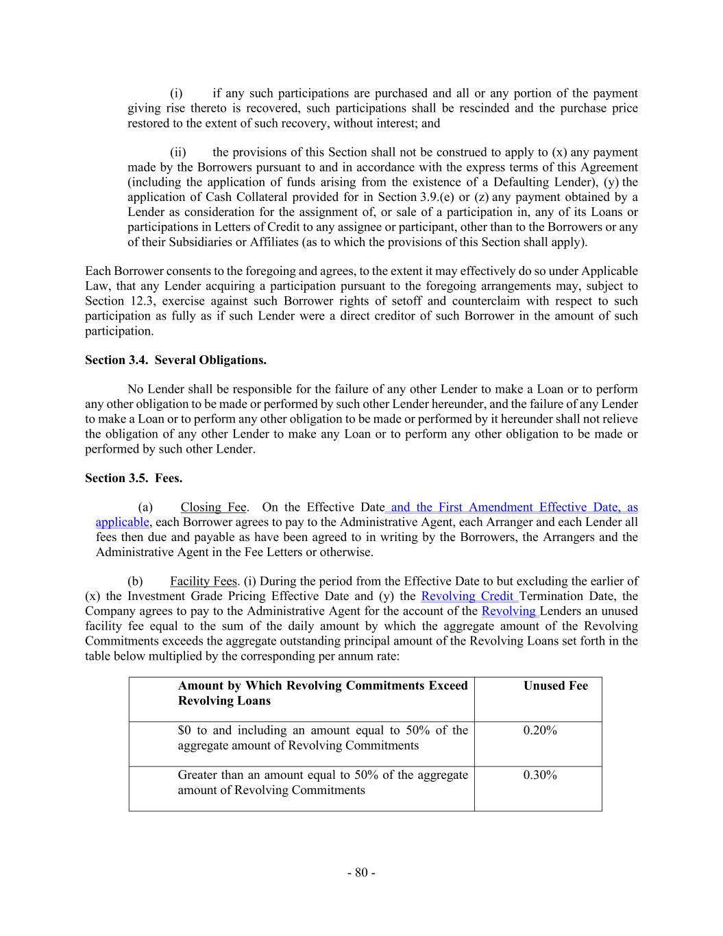 - 80 - (i) if any such participations are purchased and all or any portion of the payment giving rise thereto is recovered, such participations shall be rescinded and the purchase price restored to the extent of such recovery, without interest; and (ii) the provisions of this Section shall not be construed to apply to (x) any payment made by the Borrowers pursuant to and in accordance with the express terms of this Agreement (including the application of funds arising from the existence of a Defaulting Lender), (y) the application of Cash Collateral provided for in Section 3.9.(e) or (z) any payment obtained by a Lender as consideration for the assignment of, or sale of a participation in, any of its Loans or participations in Letters of Credit to any assignee or participant, other than to the Borrowers or any of their Subsidiaries or Affiliates (as to which the provisions of this Section shall apply). Each Borrower consents to the foregoing and agrees, to the extent it may effectively do so under Applicable Law, that any Lender acquiring a participation pursuant to the foregoing arrangements may, subject to Section 12.3, exercise against such Borrower rights of setoff and counterclaim with respect to such participation as fully as if such Lender were a direct creditor of such Borrower in the amount of such participation. Section 3.4. Several Obligations. No Lender shall be responsible for the failure of any other Lender to make a Loan or to perform any other obligation to be made or performed by such other Lender hereunder, and the failure of any Lender to make a Loan or to perform any other obligation to be made or performed by it hereunder shall not relieve the obligation of any other Lender to make any Loan or to perform any other obligation to be made or performed by such other Lender. Section 3.5. Fees. (a) Closing Fee. On the Effective Date and the First Amendment Effective Date, as applicable, each Borrower agrees to pay to the Administrative Agent, each Arranger and each Lender all fees then due and payable as have been agreed to in writing by the Borrowers, the Arrangers and the Administrative Agent in the Fee Letters or otherwise. (b) Facility Fees. (i) During the period from the Effective Date to but excluding the earlier of (x) the Investment Grade Pricing Effective Date and (y) the Revolving Credit Termination Date, the Company agrees to pay to the Administrative Agent for the account of the Revolving Lenders an unused facility fee equal to the sum of the daily amount by which the aggregate amount of the Revolving Commitments exceeds the aggregate outstanding principal amount of the Revolving Loans set forth in the table below multiplied by the corresponding per annum rate: Amount by Which Revolving Commitments Exceed Revolving Loans Unused Fee $0 to and including an amount equal to 50% of the aggregate amount of Revolving Commitments 0.20% Greater than an amount equal to 50% of the aggregate amount of Revolving Commitments 0.30%