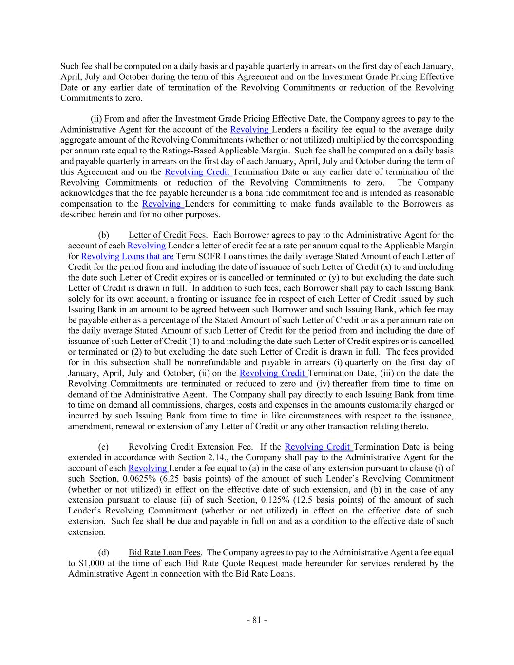 - 81 - Such fee shall be computed on a daily basis and payable quarterly in arrears on the first day of each January, April, July and October during the term of this Agreement and on the Investment Grade Pricing Effective Date or any earlier date of termination of the Revolving Commitments or reduction of the Revolving Commitments to zero. (ii) From and after the Investment Grade Pricing Effective Date, the Company agrees to pay to the Administrative Agent for the account of the Revolving Lenders a facility fee equal to the average daily aggregate amount of the Revolving Commitments (whether or not utilized) multiplied by the corresponding per annum rate equal to the Ratings-Based Applicable Margin. Such fee shall be computed on a daily basis and payable quarterly in arrears on the first day of each January, April, July and October during the term of this Agreement and on the Revolving Credit Termination Date or any earlier date of termination of the Revolving Commitments or reduction of the Revolving Commitments to zero. The Company acknowledges that the fee payable hereunder is a bona fide commitment fee and is intended as reasonable compensation to the Revolving Lenders for committing to make funds available to the Borrowers as described herein and for no other purposes. (b) Letter of Credit Fees. Each Borrower agrees to pay to the Administrative Agent for the account of each Revolving Lender a letter of credit fee at a rate per annum equal to the Applicable Margin for Revolving Loans that are Term SOFR Loans times the daily average Stated Amount of each Letter of Credit for the period from and including the date of issuance of such Letter of Credit (x) to and including the date such Letter of Credit expires or is cancelled or terminated or (y) to but excluding the date such Letter of Credit is drawn in full. In addition to such fees, each Borrower shall pay to each Issuing Bank solely for its own account, a fronting or issuance fee in respect of each Letter of Credit issued by such Issuing Bank in an amount to be agreed between such Borrower and such Issuing Bank, which fee may be payable either as a percentage of the Stated Amount of such Letter of Credit or as a per annum rate on the daily average Stated Amount of such Letter of Credit for the period from and including the date of issuance of such Letter of Credit (1) to and including the date such Letter of Credit expires or is cancelled or terminated or (2) to but excluding the date such Letter of Credit is drawn in full. The fees provided for in this subsection shall be nonrefundable and payable in arrears (i) quarterly on the first day of January, April, July and October, (ii) on the Revolving Credit Termination Date, (iii) on the date the Revolving Commitments are terminated or reduced to zero and (iv) thereafter from time to time on demand of the Administrative Agent. The Company shall pay directly to each Issuing Bank from time to time on demand all commissions, charges, costs and expenses in the amounts customarily charged or incurred by such Issuing Bank from time to time in like circumstances with respect to the issuance, amendment, renewal or extension of any Letter of Credit or any other transaction relating thereto. (c) Revolving Credit Extension Fee. If the Revolving Credit Termination Date is being extended in accordance with Section 2.14., the Company shall pay to the Administrative Agent for the account of each Revolving Lender a fee equal to (a) in the case of any extension pursuant to clause (i) of such Section, 0.0625% (6.25 basis points) of the amount of such Lender’s Revolving Commitment (whether or not utilized) in effect on the effective date of such extension, and (b) in the case of any extension pursuant to clause (ii) of such Section, 0.125% (12.5 basis points) of the amount of such Lender’s Revolving Commitment (whether or not utilized) in effect on the effective date of such extension. Such fee shall be due and payable in full on and as a condition to the effective date of such extension. (d) Bid Rate Loan Fees. The Company agrees to pay to the Administrative Agent a fee equal to $1,000 at the time of each Bid Rate Quote Request made hereunder for services rendered by the Administrative Agent in connection with the Bid Rate Loans.