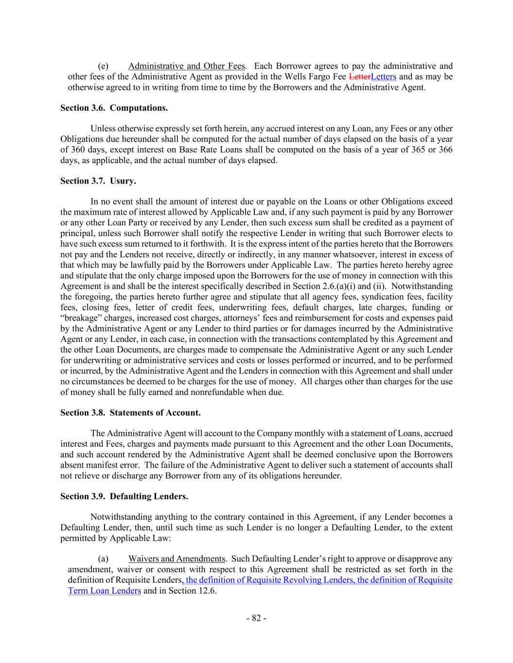 - 82 - (e) Administrative and Other Fees. Each Borrower agrees to pay the administrative and other fees of the Administrative Agent as provided in the Wells Fargo Fee LetterLetters and as may be otherwise agreed to in writing from time to time by the Borrowers and the Administrative Agent. Section 3.6. Computations. Unless otherwise expressly set forth herein, any accrued interest on any Loan, any Fees or any other Obligations due hereunder shall be computed for the actual number of days elapsed on the basis of a year of 360 days, except interest on Base Rate Loans shall be computed on the basis of a year of 365 or 366 days, as applicable, and the actual number of days elapsed. Section 3.7. Usury. In no event shall the amount of interest due or payable on the Loans or other Obligations exceed the maximum rate of interest allowed by Applicable Law and, if any such payment is paid by any Borrower or any other Loan Party or received by any Lender, then such excess sum shall be credited as a payment of principal, unless such Borrower shall notify the respective Lender in writing that such Borrower elects to have such excess sum returned to it forthwith. It is the express intent of the parties hereto that the Borrowers not pay and the Lenders not receive, directly or indirectly, in any manner whatsoever, interest in excess of that which may be lawfully paid by the Borrowers under Applicable Law. The parties hereto hereby agree and stipulate that the only charge imposed upon the Borrowers for the use of money in connection with this Agreement is and shall be the interest specifically described in Section 2.6.(a)(i) and (ii). Notwithstanding the foregoing, the parties hereto further agree and stipulate that all agency fees, syndication fees, facility fees, closing fees, letter of credit fees, underwriting fees, default charges, late charges, funding or “breakage” charges, increased cost charges, attorneys’ fees and reimbursement for costs and expenses paid by the Administrative Agent or any Lender to third parties or for damages incurred by the Administrative Agent or any Lender, in each case, in connection with the transactions contemplated by this Agreement and the other Loan Documents, are charges made to compensate the Administrative Agent or any such Lender for underwriting or administrative services and costs or losses performed or incurred, and to be performed or incurred, by the Administrative Agent and the Lenders in connection with this Agreement and shall under no circumstances be deemed to be charges for the use of money. All charges other than charges for the use of money shall be fully earned and nonrefundable when due. Section 3.8. Statements of Account. The Administrative Agent will account to the Company monthly with a statement of Loans, accrued interest and Fees, charges and payments made pursuant to this Agreement and the other Loan Documents, and such account rendered by the Administrative Agent shall be deemed conclusive upon the Borrowers absent manifest error. The failure of the Administrative Agent to deliver such a statement of accounts shall not relieve or discharge any Borrower from any of its obligations hereunder. Section 3.9. Defaulting Lenders. Notwithstanding anything to the contrary contained in this Agreement, if any Lender becomes a Defaulting Lender, then, until such time as such Lender is no longer a Defaulting Lender, to the extent permitted by Applicable Law: (a) Waivers and Amendments. Such Defaulting Lender’s right to approve or disapprove any amendment, waiver or consent with respect to this Agreement shall be restricted as set forth in the definition of Requisite Lenders, the definition of Requisite Revolving Lenders, the definition of Requisite Term Loan Lenders and in Section 12.6.