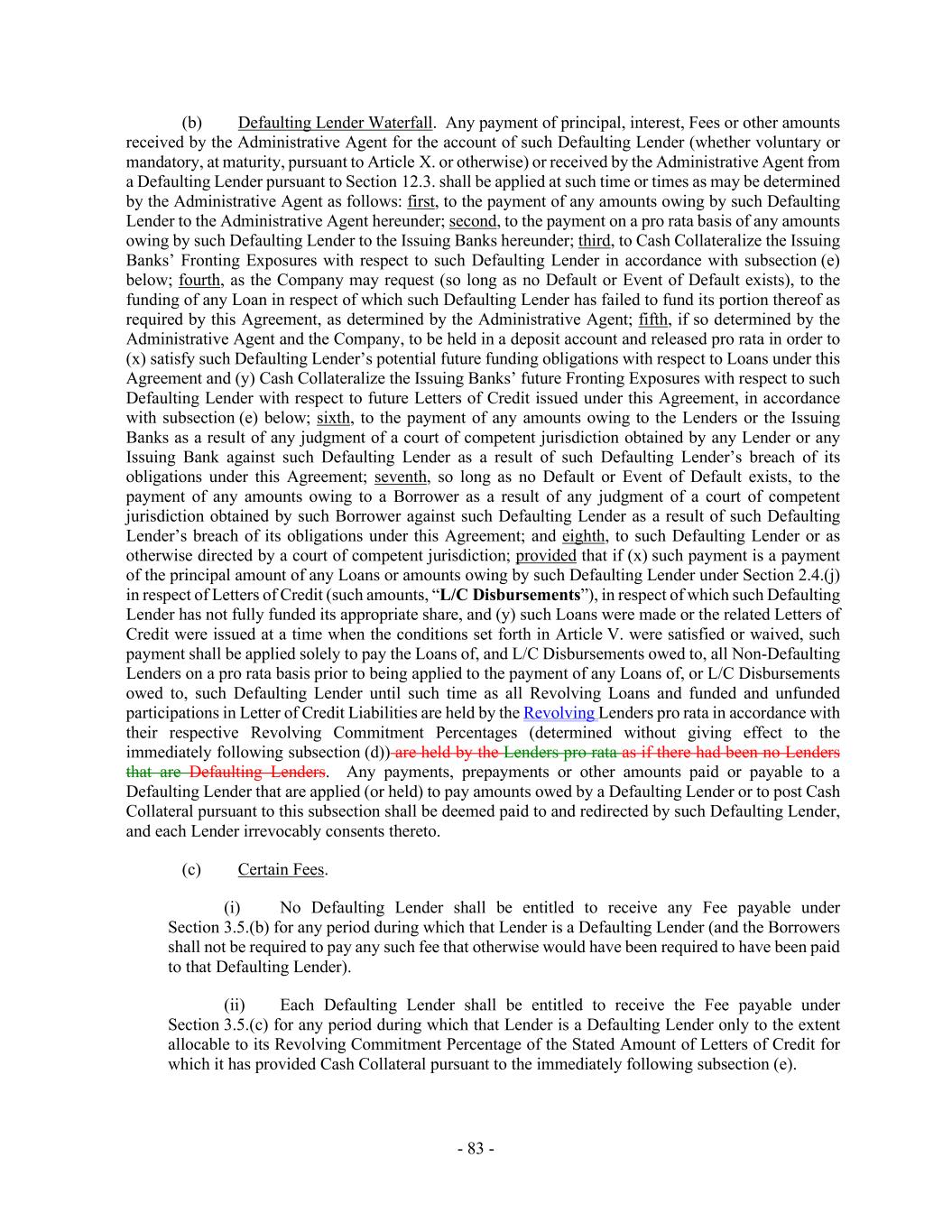 - 83 - (b) Defaulting Lender Waterfall. Any payment of principal, interest, Fees or other amounts received by the Administrative Agent for the account of such Defaulting Lender (whether voluntary or mandatory, at maturity, pursuant to Article X. or otherwise) or received by the Administrative Agent from a Defaulting Lender pursuant to Section 12.3. shall be applied at such time or times as may be determined by the Administrative Agent as follows: first, to the payment of any amounts owing by such Defaulting Lender to the Administrative Agent hereunder; second, to the payment on a pro rata basis of any amounts owing by such Defaulting Lender to the Issuing Banks hereunder; third, to Cash Collateralize the Issuing Banks’ Fronting Exposures with respect to such Defaulting Lender in accordance with subsection (e) below; fourth, as the Company may request (so long as no Default or Event of Default exists), to the funding of any Loan in respect of which such Defaulting Lender has failed to fund its portion thereof as required by this Agreement, as determined by the Administrative Agent; fifth, if so determined by the Administrative Agent and the Company, to be held in a deposit account and released pro rata in order to (x) satisfy such Defaulting Lender’s potential future funding obligations with respect to Loans under this Agreement and (y) Cash Collateralize the Issuing Banks’ future Fronting Exposures with respect to such Defaulting Lender with respect to future Letters of Credit issued under this Agreement, in accordance with subsection (e) below; sixth, to the payment of any amounts owing to the Lenders or the Issuing Banks as a result of any judgment of a court of competent jurisdiction obtained by any Lender or any Issuing Bank against such Defaulting Lender as a result of such Defaulting Lender’s breach of its obligations under this Agreement; seventh, so long as no Default or Event of Default exists, to the payment of any amounts owing to a Borrower as a result of any judgment of a court of competent jurisdiction obtained by such Borrower against such Defaulting Lender as a result of such Defaulting Lender’s breach of its obligations under this Agreement; and eighth, to such Defaulting Lender or as otherwise directed by a court of competent jurisdiction; provided that if (x) such payment is a payment of the principal amount of any Loans or amounts owing by such Defaulting Lender under Section 2.4.(j) in respect of Letters of Credit (such amounts, “L/C Disbursements”), in respect of which such Defaulting Lender has not fully funded its appropriate share, and (y) such Loans were made or the related Letters of Credit were issued at a time when the conditions set forth in Article V. were satisfied or waived, such payment shall be applied solely to pay the Loans of, and L/C Disbursements owed to, all Non-Defaulting Lenders on a pro rata basis prior to being applied to the payment of any Loans of, or L/C Disbursements owed to, such Defaulting Lender until such time as all Revolving Loans and funded and unfunded participations in Letter of Credit Liabilities are held by the Revolving Lenders pro rata in accordance with their respective Revolving Commitment Percentages (determined without giving effect to the immediately following subsection (d)) are held by the Lenders pro rata as if there had been no Lenders that are Defaulting Lenders. Any payments, prepayments or other amounts paid or payable to a Defaulting Lender that are applied (or held) to pay amounts owed by a Defaulting Lender or to post Cash Collateral pursuant to this subsection shall be deemed paid to and redirected by such Defaulting Lender, and each Lender irrevocably consents thereto. (c) Certain Fees. (i) No Defaulting Lender shall be entitled to receive any Fee payable under Section 3.5.(b) for any period during which that Lender is a Defaulting Lender (and the Borrowers shall not be required to pay any such fee that otherwise would have been required to have been paid to that Defaulting Lender). (ii) Each Defaulting Lender shall be entitled to receive the Fee payable under Section 3.5.(c) for any period during which that Lender is a Defaulting Lender only to the extent allocable to its Revolving Commitment Percentage of the Stated Amount of Letters of Credit for which it has provided Cash Collateral pursuant to the immediately following subsection (e).