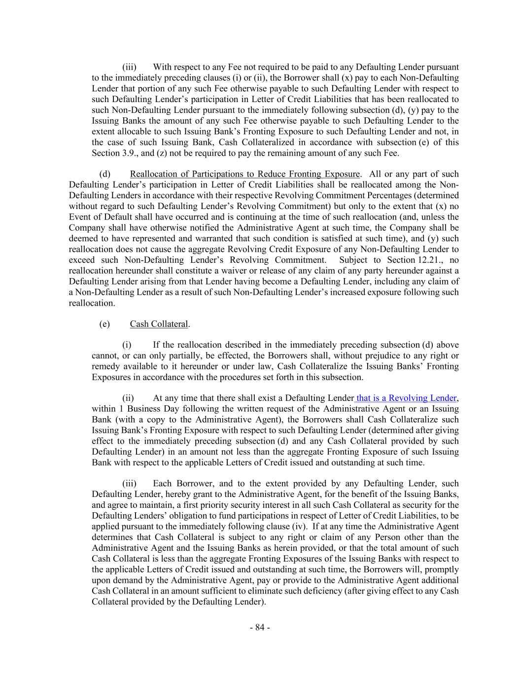 - 84 - (iii) With respect to any Fee not required to be paid to any Defaulting Lender pursuant to the immediately preceding clauses (i) or (ii), the Borrower shall (x) pay to each Non-Defaulting Lender that portion of any such Fee otherwise payable to such Defaulting Lender with respect to such Defaulting Lender’s participation in Letter of Credit Liabilities that has been reallocated to such Non-Defaulting Lender pursuant to the immediately following subsection (d), (y) pay to the Issuing Banks the amount of any such Fee otherwise payable to such Defaulting Lender to the extent allocable to such Issuing Bank’s Fronting Exposure to such Defaulting Lender and not, in the case of such Issuing Bank, Cash Collateralized in accordance with subsection (e) of this Section 3.9., and (z) not be required to pay the remaining amount of any such Fee. (d) Reallocation of Participations to Reduce Fronting Exposure. All or any part of such Defaulting Lender’s participation in Letter of Credit Liabilities shall be reallocated among the Non- Defaulting Lenders in accordance with their respective Revolving Commitment Percentages (determined without regard to such Defaulting Lender’s Revolving Commitment) but only to the extent that (x) no Event of Default shall have occurred and is continuing at the time of such reallocation (and, unless the Company shall have otherwise notified the Administrative Agent at such time, the Company shall be deemed to have represented and warranted that such condition is satisfied at such time), and (y) such reallocation does not cause the aggregate Revolving Credit Exposure of any Non-Defaulting Lender to exceed such Non-Defaulting Lender’s Revolving Commitment. Subject to Section 12.21., no reallocation hereunder shall constitute a waiver or release of any claim of any party hereunder against a Defaulting Lender arising from that Lender having become a Defaulting Lender, including any claim of a Non-Defaulting Lender as a result of such Non-Defaulting Lender’s increased exposure following such reallocation. (e) Cash Collateral. (i) If the reallocation described in the immediately preceding subsection (d) above cannot, or can only partially, be effected, the Borrowers shall, without prejudice to any right or remedy available to it hereunder or under law, Cash Collateralize the Issuing Banks’ Fronting Exposures in accordance with the procedures set forth in this subsection. (ii) At any time that there shall exist a Defaulting Lender that is a Revolving Lender, within 1 Business Day following the written request of the Administrative Agent or an Issuing Bank (with a copy to the Administrative Agent), the Borrowers shall Cash Collateralize such Issuing Bank’s Fronting Exposure with respect to such Defaulting Lender (determined after giving effect to the immediately preceding subsection (d) and any Cash Collateral provided by such Defaulting Lender) in an amount not less than the aggregate Fronting Exposure of such Issuing Bank with respect to the applicable Letters of Credit issued and outstanding at such time. (iii) Each Borrower, and to the extent provided by any Defaulting Lender, such Defaulting Lender, hereby grant to the Administrative Agent, for the benefit of the Issuing Banks, and agree to maintain, a first priority security interest in all such Cash Collateral as security for the Defaulting Lenders’ obligation to fund participations in respect of Letter of Credit Liabilities, to be applied pursuant to the immediately following clause (iv). If at any time the Administrative Agent determines that Cash Collateral is subject to any right or claim of any Person other than the Administrative Agent and the Issuing Banks as herein provided, or that the total amount of such Cash Collateral is less than the aggregate Fronting Exposures of the Issuing Banks with respect to the applicable Letters of Credit issued and outstanding at such time, the Borrowers will, promptly upon demand by the Administrative Agent, pay or provide to the Administrative Agent additional Cash Collateral in an amount sufficient to eliminate such deficiency (after giving effect to any Cash Collateral provided by the Defaulting Lender).