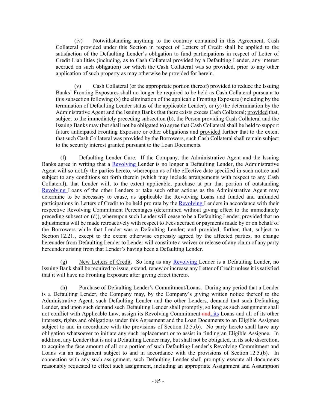 - 85 - (iv) Notwithstanding anything to the contrary contained in this Agreement, Cash Collateral provided under this Section in respect of Letters of Credit shall be applied to the satisfaction of the Defaulting Lender’s obligation to fund participations in respect of Letter of Credit Liabilities (including, as to Cash Collateral provided by a Defaulting Lender, any interest accrued on such obligation) for which the Cash Collateral was so provided, prior to any other application of such property as may otherwise be provided for herein. (v) Cash Collateral (or the appropriate portion thereof) provided to reduce the Issuing Banks’ Fronting Exposures shall no longer be required to be held as Cash Collateral pursuant to this subsection following (x) the elimination of the applicable Fronting Exposure (including by the termination of Defaulting Lender status of the applicable Lender), or (y) the determination by the Administrative Agent and the Issuing Banks that there exists excess Cash Collateral; provided that, subject to the immediately preceding subsection (b), the Person providing Cash Collateral and the Issuing Banks may (but shall not be obligated to) agree that Cash Collateral shall be held to support future anticipated Fronting Exposure or other obligations and provided further that to the extent that such Cash Collateral was provided by the Borrowers, such Cash Collateral shall remain subject to the security interest granted pursuant to the Loan Documents. (f) Defaulting Lender Cure. If the Company, the Administrative Agent and the Issuing Banks agree in writing that a Revolving Lender is no longer a Defaulting Lender, the Administrative Agent will so notify the parties hereto, whereupon as of the effective date specified in such notice and subject to any conditions set forth therein (which may include arrangements with respect to any Cash Collateral), that Lender will, to the extent applicable, purchase at par that portion of outstanding Revolving Loans of the other Lenders or take such other actions as the Administrative Agent may determine to be necessary to cause, as applicable the Revolving Loans and funded and unfunded participations in Letters of Credit to be held pro rata by the Revolving Lenders in accordance with their respective Revolving Commitment Percentages (determined without giving effect to the immediately preceding subsection (d)), whereupon such Lender will cease to be a Defaulting Lender; provided that no adjustments will be made retroactively with respect to Fees accrued or payments made by or on behalf of the Borrowers while that Lender was a Defaulting Lender; and provided, further, that, subject to Section 12.21., except to the extent otherwise expressly agreed by the affected parties, no change hereunder from Defaulting Lender to Lender will constitute a waiver or release of any claim of any party hereunder arising from that Lender’s having been a Defaulting Lender. (g) New Letters of Credit. So long as any Revolving Lender is a Defaulting Lender, no Issuing Bank shall be required to issue, extend, renew or increase any Letter of Credit unless it is satisfied that it will have no Fronting Exposure after giving effect thereto. (h) Purchase of Defaulting Lender’s Commitment/Loans. During any period that a Lender is a Defaulting Lender, the Company may, by the Company’s giving written notice thereof to the Administrative Agent, such Defaulting Lender and the other Lenders, demand that such Defaulting Lender, and upon such demand such Defaulting Lender shall promptly, so long as such assignment shall not conflict with Applicable Law, assign its Revolving Commitment and, its Loans and all of its other interests, rights and obligations under this Agreement and the Loan Documents to an Eligible Assignee subject to and in accordance with the provisions of Section 12.5.(b). No party hereto shall have any obligation whatsoever to initiate any such replacement or to assist in finding an Eligible Assignee. In addition, any Lender that is not a Defaulting Lender may, but shall not be obligated, in its sole discretion, to acquire the face amount of all or a portion of such Defaulting Lender’s Revolving Commitment and Loans via an assignment subject to and in accordance with the provisions of Section 12.5.(b). In connection with any such assignment, such Defaulting Lender shall promptly execute all documents reasonably requested to effect such assignment, including an appropriate Assignment and Assumption