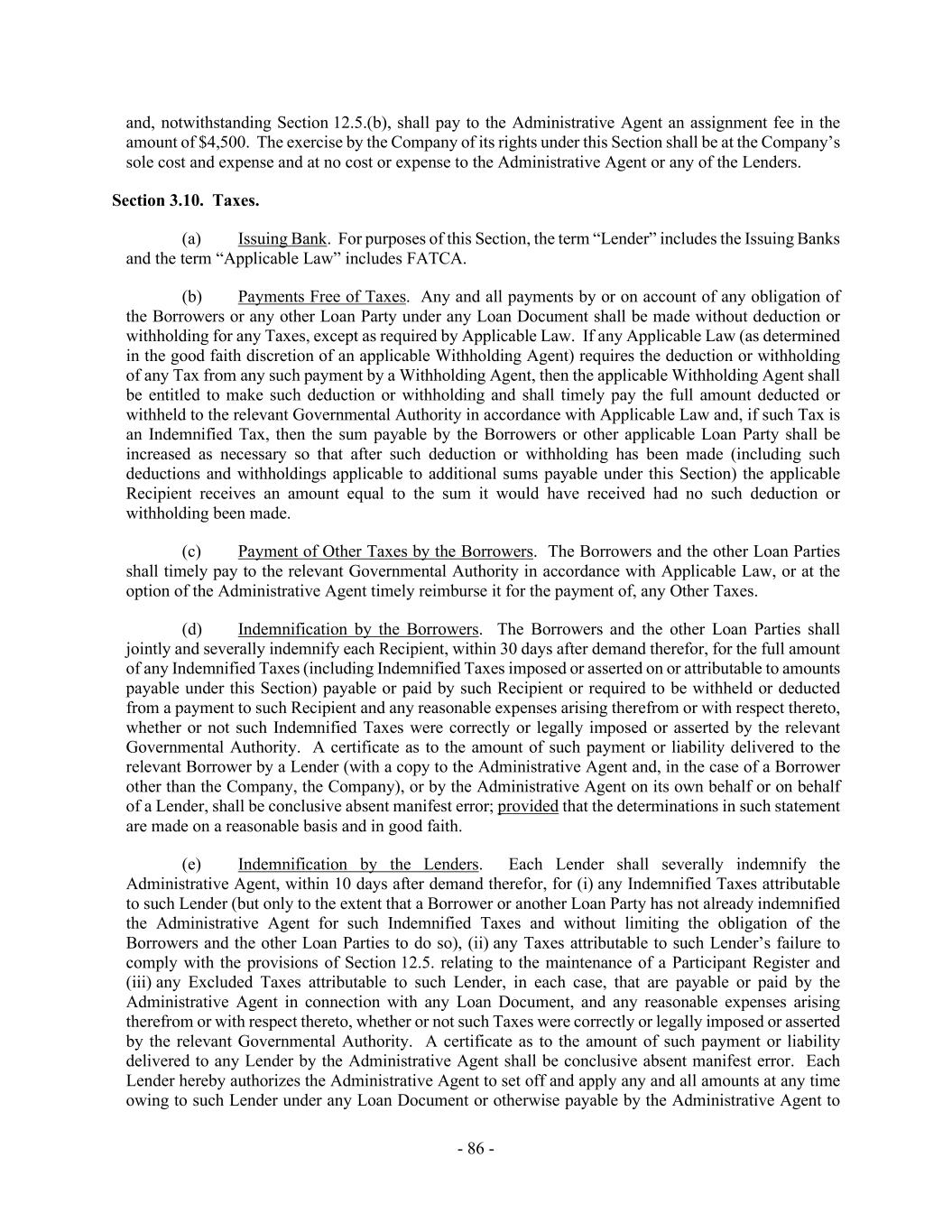 - 86 - and, notwithstanding Section 12.5.(b), shall pay to the Administrative Agent an assignment fee in the amount of $4,500. The exercise by the Company of its rights under this Section shall be at the Company’s sole cost and expense and at no cost or expense to the Administrative Agent or any of the Lenders. Section 3.10. Taxes. (a) Issuing Bank. For purposes of this Section, the term “Lender” includes the Issuing Banks and the term “Applicable Law” includes FATCA. (b) Payments Free of Taxes. Any and all payments by or on account of any obligation of the Borrowers or any other Loan Party under any Loan Document shall be made without deduction or withholding for any Taxes, except as required by Applicable Law. If any Applicable Law (as determined in the good faith discretion of an applicable Withholding Agent) requires the deduction or withholding of any Tax from any such payment by a Withholding Agent, then the applicable Withholding Agent shall be entitled to make such deduction or withholding and shall timely pay the full amount deducted or withheld to the relevant Governmental Authority in accordance with Applicable Law and, if such Tax is an Indemnified Tax, then the sum payable by the Borrowers or other applicable Loan Party shall be increased as necessary so that after such deduction or withholding has been made (including such deductions and withholdings applicable to additional sums payable under this Section) the applicable Recipient receives an amount equal to the sum it would have received had no such deduction or withholding been made. (c) Payment of Other Taxes by the Borrowers. The Borrowers and the other Loan Parties shall timely pay to the relevant Governmental Authority in accordance with Applicable Law, or at the option of the Administrative Agent timely reimburse it for the payment of, any Other Taxes. (d) Indemnification by the Borrowers. The Borrowers and the other Loan Parties shall jointly and severally indemnify each Recipient, within 30 days after demand therefor, for the full amount of any Indemnified Taxes (including Indemnified Taxes imposed or asserted on or attributable to amounts payable under this Section) payable or paid by such Recipient or required to be withheld or deducted from a payment to such Recipient and any reasonable expenses arising therefrom or with respect thereto, whether or not such Indemnified Taxes were correctly or legally imposed or asserted by the relevant Governmental Authority. A certificate as to the amount of such payment or liability delivered to the relevant Borrower by a Lender (with a copy to the Administrative Agent and, in the case of a Borrower other than the Company, the Company), or by the Administrative Agent on its own behalf or on behalf of a Lender, shall be conclusive absent manifest error; provided that the determinations in such statement are made on a reasonable basis and in good faith. (e) Indemnification by the Lenders. Each Lender shall severally indemnify the Administrative Agent, within 10 days after demand therefor, for (i) any Indemnified Taxes attributable to such Lender (but only to the extent that a Borrower or another Loan Party has not already indemnified the Administrative Agent for such Indemnified Taxes and without limiting the obligation of the Borrowers and the other Loan Parties to do so), (ii) any Taxes attributable to such Lender’s failure to comply with the provisions of Section 12.5. relating to the maintenance of a Participant Register and (iii) any Excluded Taxes attributable to such Lender, in each case, that are payable or paid by the Administrative Agent in connection with any Loan Document, and any reasonable expenses arising therefrom or with respect thereto, whether or not such Taxes were correctly or legally imposed or asserted by the relevant Governmental Authority. A certificate as to the amount of such payment or liability delivered to any Lender by the Administrative Agent shall be conclusive absent manifest error. Each Lender hereby authorizes the Administrative Agent to set off and apply any and all amounts at any time owing to such Lender under any Loan Document or otherwise payable by the Administrative Agent to