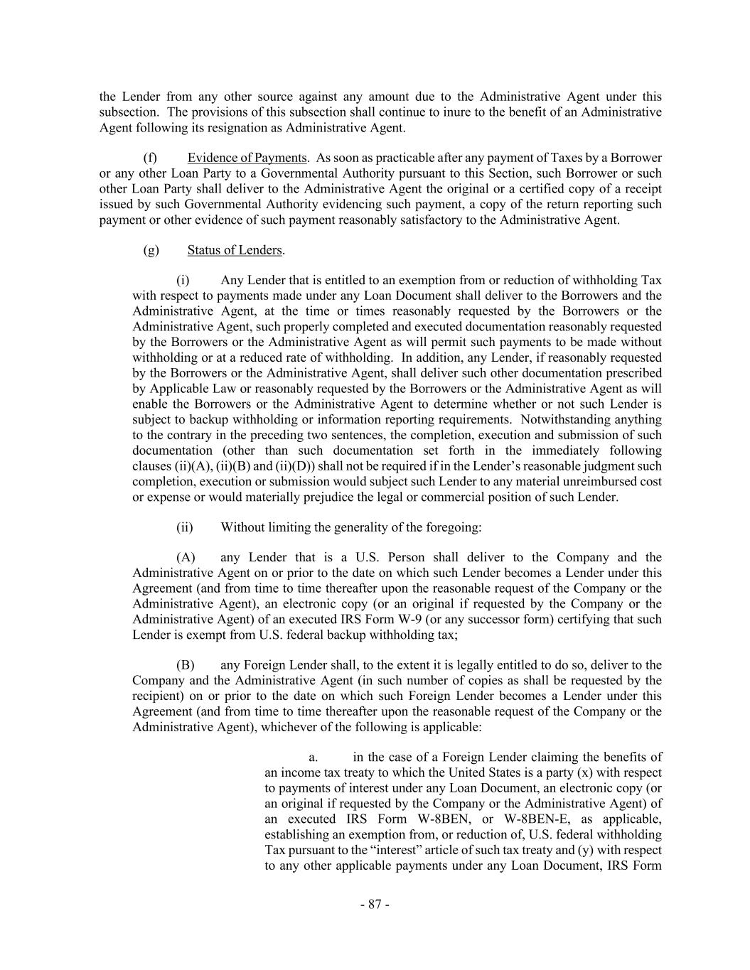 - 87 - the Lender from any other source against any amount due to the Administrative Agent under this subsection. The provisions of this subsection shall continue to inure to the benefit of an Administrative Agent following its resignation as Administrative Agent. (f) Evidence of Payments. As soon as practicable after any payment of Taxes by a Borrower or any other Loan Party to a Governmental Authority pursuant to this Section, such Borrower or such other Loan Party shall deliver to the Administrative Agent the original or a certified copy of a receipt issued by such Governmental Authority evidencing such payment, a copy of the return reporting such payment or other evidence of such payment reasonably satisfactory to the Administrative Agent. (g) Status of Lenders. (i) Any Lender that is entitled to an exemption from or reduction of withholding Tax with respect to payments made under any Loan Document shall deliver to the Borrowers and the Administrative Agent, at the time or times reasonably requested by the Borrowers or the Administrative Agent, such properly completed and executed documentation reasonably requested by the Borrowers or the Administrative Agent as will permit such payments to be made without withholding or at a reduced rate of withholding. In addition, any Lender, if reasonably requested by the Borrowers or the Administrative Agent, shall deliver such other documentation prescribed by Applicable Law or reasonably requested by the Borrowers or the Administrative Agent as will enable the Borrowers or the Administrative Agent to determine whether or not such Lender is subject to backup withholding or information reporting requirements. Notwithstanding anything to the contrary in the preceding two sentences, the completion, execution and submission of such documentation (other than such documentation set forth in the immediately following clauses (ii)(A), (ii)(B) and (ii)(D)) shall not be required if in the Lender’s reasonable judgment such completion, execution or submission would subject such Lender to any material unreimbursed cost or expense or would materially prejudice the legal or commercial position of such Lender. (ii) Without limiting the generality of the foregoing: (A) any Lender that is a U.S. Person shall deliver to the Company and the Administrative Agent on or prior to the date on which such Lender becomes a Lender under this Agreement (and from time to time thereafter upon the reasonable request of the Company or the Administrative Agent), an electronic copy (or an original if requested by the Company or the Administrative Agent) of an executed IRS Form W-9 (or any successor form) certifying that such Lender is exempt from U.S. federal backup withholding tax; (B) any Foreign Lender shall, to the extent it is legally entitled to do so, deliver to the Company and the Administrative Agent (in such number of copies as shall be requested by the recipient) on or prior to the date on which such Foreign Lender becomes a Lender under this Agreement (and from time to time thereafter upon the reasonable request of the Company or the Administrative Agent), whichever of the following is applicable: a. in the case of a Foreign Lender claiming the benefits of an income tax treaty to which the United States is a party (x) with respect to payments of interest under any Loan Document, an electronic copy (or an original if requested by the Company or the Administrative Agent) of an executed IRS Form W-8BEN, or W-8BEN-E, as applicable, establishing an exemption from, or reduction of, U.S. federal withholding Tax pursuant to the “interest” article of such tax treaty and (y) with respect to any other applicable payments under any Loan Document, IRS Form