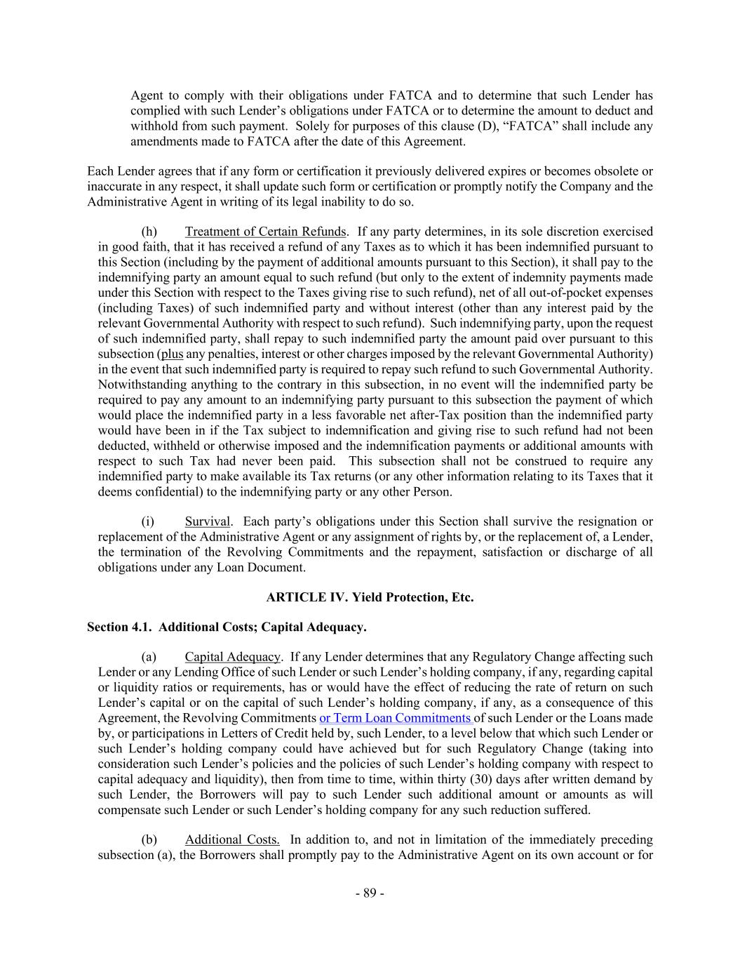 - 89 - Agent to comply with their obligations under FATCA and to determine that such Lender has complied with such Lender’s obligations under FATCA or to determine the amount to deduct and withhold from such payment. Solely for purposes of this clause (D), “FATCA” shall include any amendments made to FATCA after the date of this Agreement. Each Lender agrees that if any form or certification it previously delivered expires or becomes obsolete or inaccurate in any respect, it shall update such form or certification or promptly notify the Company and the Administrative Agent in writing of its legal inability to do so. (h) Treatment of Certain Refunds. If any party determines, in its sole discretion exercised in good faith, that it has received a refund of any Taxes as to which it has been indemnified pursuant to this Section (including by the payment of additional amounts pursuant to this Section), it shall pay to the indemnifying party an amount equal to such refund (but only to the extent of indemnity payments made under this Section with respect to the Taxes giving rise to such refund), net of all out-of-pocket expenses (including Taxes) of such indemnified party and without interest (other than any interest paid by the relevant Governmental Authority with respect to such refund). Such indemnifying party, upon the request of such indemnified party, shall repay to such indemnified party the amount paid over pursuant to this subsection (plus any penalties, interest or other charges imposed by the relevant Governmental Authority) in the event that such indemnified party is required to repay such refund to such Governmental Authority. Notwithstanding anything to the contrary in this subsection, in no event will the indemnified party be required to pay any amount to an indemnifying party pursuant to this subsection the payment of which would place the indemnified party in a less favorable net after-Tax position than the indemnified party would have been in if the Tax subject to indemnification and giving rise to such refund had not been deducted, withheld or otherwise imposed and the indemnification payments or additional amounts with respect to such Tax had never been paid. This subsection shall not be construed to require any indemnified party to make available its Tax returns (or any other information relating to its Taxes that it deems confidential) to the indemnifying party or any other Person. (i) Survival. Each party’s obligations under this Section shall survive the resignation or replacement of the Administrative Agent or any assignment of rights by, or the replacement of, a Lender, the termination of the Revolving Commitments and the repayment, satisfaction or discharge of all obligations under any Loan Document. ARTICLE IV. Yield Protection, Etc. Section 4.1. Additional Costs; Capital Adequacy. (a) Capital Adequacy. If any Lender determines that any Regulatory Change affecting such Lender or any Lending Office of such Lender or such Lender’s holding company, if any, regarding capital or liquidity ratios or requirements, has or would have the effect of reducing the rate of return on such Lender’s capital or on the capital of such Lender’s holding company, if any, as a consequence of this Agreement, the Revolving Commitments or Term Loan Commitments of such Lender or the Loans made by, or participations in Letters of Credit held by, such Lender, to a level below that which such Lender or such Lender’s holding company could have achieved but for such Regulatory Change (taking into consideration such Lender’s policies and the policies of such Lender’s holding company with respect to capital adequacy and liquidity), then from time to time, within thirty (30) days after written demand by such Lender, the Borrowers will pay to such Lender such additional amount or amounts as will compensate such Lender or such Lender’s holding company for any such reduction suffered. (b) Additional Costs. In addition to, and not in limitation of the immediately preceding subsection (a), the Borrowers shall promptly pay to the Administrative Agent on its own account or for
