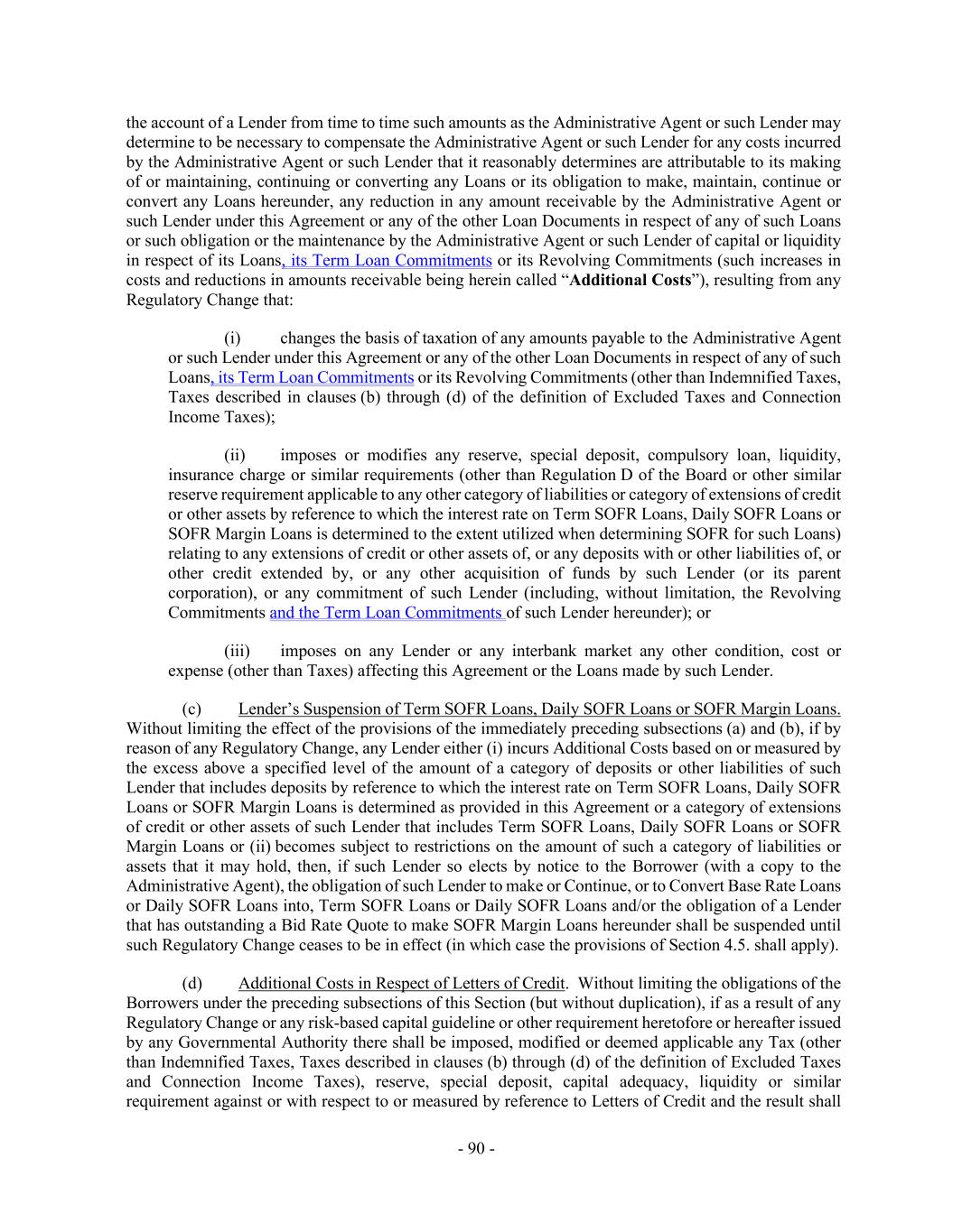 - 90 - the account of a Lender from time to time such amounts as the Administrative Agent or such Lender may determine to be necessary to compensate the Administrative Agent or such Lender for any costs incurred by the Administrative Agent or such Lender that it reasonably determines are attributable to its making of or maintaining, continuing or converting any Loans or its obligation to make, maintain, continue or convert any Loans hereunder, any reduction in any amount receivable by the Administrative Agent or such Lender under this Agreement or any of the other Loan Documents in respect of any of such Loans or such obligation or the maintenance by the Administrative Agent or such Lender of capital or liquidity in respect of its Loans, its Term Loan Commitments or its Revolving Commitments (such increases in costs and reductions in amounts receivable being herein called “Additional Costs”), resulting from any Regulatory Change that: (i) changes the basis of taxation of any amounts payable to the Administrative Agent or such Lender under this Agreement or any of the other Loan Documents in respect of any of such Loans, its Term Loan Commitments or its Revolving Commitments (other than Indemnified Taxes, Taxes described in clauses (b) through (d) of the definition of Excluded Taxes and Connection Income Taxes); (ii) imposes or modifies any reserve, special deposit, compulsory loan, liquidity, insurance charge or similar requirements (other than Regulation D of the Board or other similar reserve requirement applicable to any other category of liabilities or category of extensions of credit or other assets by reference to which the interest rate on Term SOFR Loans, Daily SOFR Loans or SOFR Margin Loans is determined to the extent utilized when determining SOFR for such Loans) relating to any extensions of credit or other assets of, or any deposits with or other liabilities of, or other credit extended by, or any other acquisition of funds by such Lender (or its parent corporation), or any commitment of such Lender (including, without limitation, the Revolving Commitments and the Term Loan Commitments of such Lender hereunder); or (iii) imposes on any Lender or any interbank market any other condition, cost or expense (other than Taxes) affecting this Agreement or the Loans made by such Lender. (c) Lender’s Suspension of Term SOFR Loans, Daily SOFR Loans or SOFR Margin Loans. Without limiting the effect of the provisions of the immediately preceding subsections (a) and (b), if by reason of any Regulatory Change, any Lender either (i) incurs Additional Costs based on or measured by the excess above a specified level of the amount of a category of deposits or other liabilities of such Lender that includes deposits by reference to which the interest rate on Term SOFR Loans, Daily SOFR Loans or SOFR Margin Loans is determined as provided in this Agreement or a category of extensions of credit or other assets of such Lender that includes Term SOFR Loans, Daily SOFR Loans or SOFR Margin Loans or (ii) becomes subject to restrictions on the amount of such a category of liabilities or assets that it may hold, then, if such Lender so elects by notice to the Borrower (with a copy to the Administrative Agent), the obligation of such Lender to make or Continue, or to Convert Base Rate Loans or Daily SOFR Loans into, Term SOFR Loans or Daily SOFR Loans and/or the obligation of a Lender that has outstanding a Bid Rate Quote to make SOFR Margin Loans hereunder shall be suspended until such Regulatory Change ceases to be in effect (in which case the provisions of Section 4.5. shall apply). (d) Additional Costs in Respect of Letters of Credit. Without limiting the obligations of the Borrowers under the preceding subsections of this Section (but without duplication), if as a result of any Regulatory Change or any risk-based capital guideline or other requirement heretofore or hereafter issued by any Governmental Authority there shall be imposed, modified or deemed applicable any Tax (other than Indemnified Taxes, Taxes described in clauses (b) through (d) of the definition of Excluded Taxes and Connection Income Taxes), reserve, special deposit, capital adequacy, liquidity or similar requirement against or with respect to or measured by reference to Letters of Credit and the result shall
