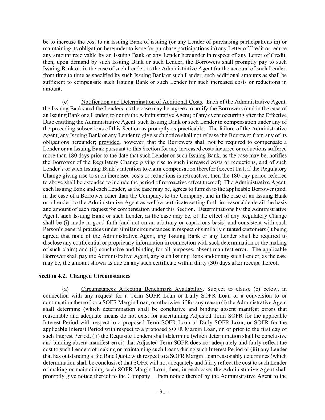 - 91 - be to increase the cost to an Issuing Bank of issuing (or any Lender of purchasing participations in) or maintaining its obligation hereunder to issue (or purchase participations in) any Letter of Credit or reduce any amount receivable by an Issuing Bank or any Lender hereunder in respect of any Letter of Credit, then, upon demand by such Issuing Bank or such Lender, the Borrowers shall promptly pay to such Issuing Bank or, in the case of such Lender, to the Administrative Agent for the account of such Lender, from time to time as specified by such Issuing Bank or such Lender, such additional amounts as shall be sufficient to compensate such Issuing Bank or such Lender for such increased costs or reductions in amount. (e) Notification and Determination of Additional Costs. Each of the Administrative Agent, the Issuing Banks and the Lenders, as the case may be, agrees to notify the Borrowers (and in the case of an Issuing Bank or a Lender, to notify the Administrative Agent) of any event occurring after the Effective Date entitling the Administrative Agent, such Issuing Bank or such Lender to compensation under any of the preceding subsections of this Section as promptly as practicable. The failure of the Administrative Agent, any Issuing Bank or any Lender to give such notice shall not release the Borrower from any of its obligations hereunder; provided, however, that the Borrowers shall not be required to compensate a Lender or an Issuing Bank pursuant to this Section for any increased costs incurred or reductions suffered more than 180 days prior to the date that such Lender or such Issuing Bank, as the case may be, notifies the Borrower of the Regulatory Change giving rise to such increased costs or reductions, and of such Lender’s or such Issuing Bank’s intention to claim compensation therefor (except that, if the Regulatory Change giving rise to such increased costs or reductions is retroactive, then the 180-day period referred to above shall be extended to include the period of retroactive effect thereof). The Administrative Agent, each Issuing Bank and each Lender, as the case may be, agrees to furnish to the applicable Borrower (and, in the case of a Borrower other than the Company, to the Company, and in the case of an Issuing Bank or a Lender, to the Administrative Agent as well) a certificate setting forth in reasonable detail the basis and amount of each request for compensation under this Section. Determinations by the Administrative Agent, such Issuing Bank or such Lender, as the case may be, of the effect of any Regulatory Change shall be (i) made in good faith (and not on an arbitrary or capricious basis) and consistent with such Person’s general practices under similar circumstances in respect of similarly situated customers (it being agreed that none of the Administrative Agent, any Issuing Bank or any Lender shall be required to disclose any confidential or proprietary information in connection with such determination or the making of such claim) and (ii) conclusive and binding for all purposes, absent manifest error. The applicable Borrower shall pay the Administrative Agent, any such Issuing Bank and/or any such Lender, as the case may be, the amount shown as due on any such certificate within thirty (30) days after receipt thereof. Section 4.2. Changed Circumstances (a) Circumstances Affecting Benchmark Availability. Subject to clause (c) below, in connection with any request for a Term SOFR Loan or Daily SOFR Loan or a conversion to or continuation thereof, or a SOFR Margin Loan, or otherwise, if for any reason (i) the Administrative Agent shall determine (which determination shall be conclusive and binding absent manifest error) that reasonable and adequate means do not exist for ascertaining Adjusted Term SOFR for the applicable Interest Period with respect to a proposed Term SOFR Loan or Daily SOFR Loan, or SOFR for the applicable Interest Period with respect to a proposed SOFR Margin Loan, on or prior to the first day of such Interest Period, (ii) the Requisite Lenders shall determine (which determination shall be conclusive and binding absent manifest error) that Adjusted Term SOFR does not adequately and fairly reflect the cost to such Lenders of making or maintaining such Loans during such Interest Period or (iii) any Lender that has outstanding a Bid Rate Quote with respect to a SOFR Margin Loan reasonably determines (which determination shall be conclusive) that SOFR will not adequately and fairly reflect the cost to such Lender of making or maintaining such SOFR Margin Loan, then, in each case, the Administrative Agent shall promptly give notice thereof to the Company. Upon notice thereof by the Administrative Agent to the