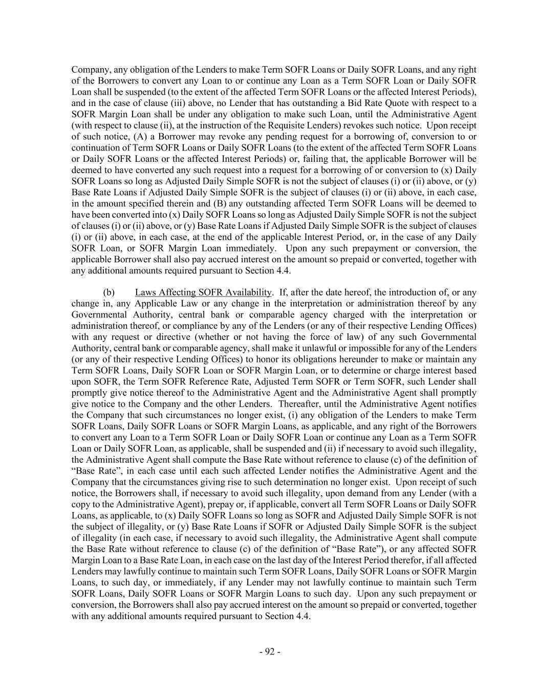 - 92 - Company, any obligation of the Lenders to make Term SOFR Loans or Daily SOFR Loans, and any right of the Borrowers to convert any Loan to or continue any Loan as a Term SOFR Loan or Daily SOFR Loan shall be suspended (to the extent of the affected Term SOFR Loans or the affected Interest Periods), and in the case of clause (iii) above, no Lender that has outstanding a Bid Rate Quote with respect to a SOFR Margin Loan shall be under any obligation to make such Loan, until the Administrative Agent (with respect to clause (ii), at the instruction of the Requisite Lenders) revokes such notice. Upon receipt of such notice, (A) a Borrower may revoke any pending request for a borrowing of, conversion to or continuation of Term SOFR Loans or Daily SOFR Loans (to the extent of the affected Term SOFR Loans or Daily SOFR Loans or the affected Interest Periods) or, failing that, the applicable Borrower will be deemed to have converted any such request into a request for a borrowing of or conversion to (x) Daily SOFR Loans so long as Adjusted Daily Simple SOFR is not the subject of clauses (i) or (ii) above, or (y) Base Rate Loans if Adjusted Daily Simple SOFR is the subject of clauses (i) or (ii) above, in each case, in the amount specified therein and (B) any outstanding affected Term SOFR Loans will be deemed to have been converted into (x) Daily SOFR Loans so long as Adjusted Daily Simple SOFR is not the subject of clauses (i) or (ii) above, or (y) Base Rate Loans if Adjusted Daily Simple SOFR is the subject of clauses (i) or (ii) above, in each case, at the end of the applicable Interest Period, or, in the case of any Daily SOFR Loan, or SOFR Margin Loan immediately. Upon any such prepayment or conversion, the applicable Borrower shall also pay accrued interest on the amount so prepaid or converted, together with any additional amounts required pursuant to Section 4.4. (b) Laws Affecting SOFR Availability. If, after the date hereof, the introduction of, or any change in, any Applicable Law or any change in the interpretation or administration thereof by any Governmental Authority, central bank or comparable agency charged with the interpretation or administration thereof, or compliance by any of the Lenders (or any of their respective Lending Offices) with any request or directive (whether or not having the force of law) of any such Governmental Authority, central bank or comparable agency, shall make it unlawful or impossible for any of the Lenders (or any of their respective Lending Offices) to honor its obligations hereunder to make or maintain any Term SOFR Loans, Daily SOFR Loan or SOFR Margin Loan, or to determine or charge interest based upon SOFR, the Term SOFR Reference Rate, Adjusted Term SOFR or Term SOFR, such Lender shall promptly give notice thereof to the Administrative Agent and the Administrative Agent shall promptly give notice to the Company and the other Lenders. Thereafter, until the Administrative Agent notifies the Company that such circumstances no longer exist, (i) any obligation of the Lenders to make Term SOFR Loans, Daily SOFR Loans or SOFR Margin Loans, as applicable, and any right of the Borrowers to convert any Loan to a Term SOFR Loan or Daily SOFR Loan or continue any Loan as a Term SOFR Loan or Daily SOFR Loan, as applicable, shall be suspended and (ii) if necessary to avoid such illegality, the Administrative Agent shall compute the Base Rate without reference to clause (c) of the definition of “Base Rate”, in each case until each such affected Lender notifies the Administrative Agent and the Company that the circumstances giving rise to such determination no longer exist. Upon receipt of such notice, the Borrowers shall, if necessary to avoid such illegality, upon demand from any Lender (with a copy to the Administrative Agent), prepay or, if applicable, convert all Term SOFR Loans or Daily SOFR Loans, as applicable, to (x) Daily SOFR Loans so long as SOFR and Adjusted Daily Simple SOFR is not the subject of illegality, or (y) Base Rate Loans if SOFR or Adjusted Daily Simple SOFR is the subject of illegality (in each case, if necessary to avoid such illegality, the Administrative Agent shall compute the Base Rate without reference to clause (c) of the definition of “Base Rate”), or any affected SOFR Margin Loan to a Base Rate Loan, in each case on the last day of the Interest Period therefor, if all affected Lenders may lawfully continue to maintain such Term SOFR Loans, Daily SOFR Loans or SOFR Margin Loans, to such day, or immediately, if any Lender may not lawfully continue to maintain such Term SOFR Loans, Daily SOFR Loans or SOFR Margin Loans to such day. Upon any such prepayment or conversion, the Borrowers shall also pay accrued interest on the amount so prepaid or converted, together with any additional amounts required pursuant to Section 4.4.