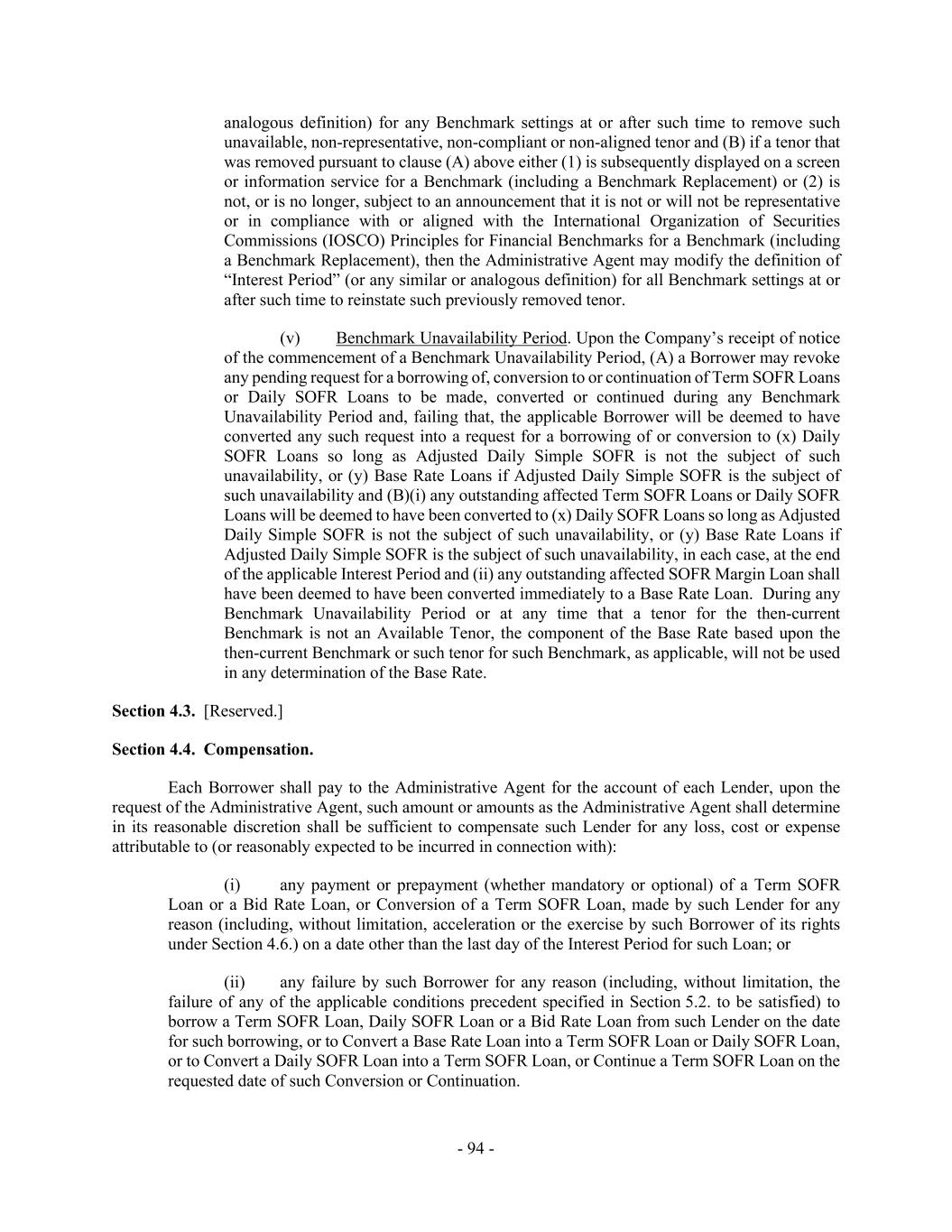 - 94 - analogous definition) for any Benchmark settings at or after such time to remove such unavailable, non-representative, non-compliant or non-aligned tenor and (B) if a tenor that was removed pursuant to clause (A) above either (1) is subsequently displayed on a screen or information service for a Benchmark (including a Benchmark Replacement) or (2) is not, or is no longer, subject to an announcement that it is not or will not be representative or in compliance with or aligned with the International Organization of Securities Commissions (IOSCO) Principles for Financial Benchmarks for a Benchmark (including a Benchmark Replacement), then the Administrative Agent may modify the definition of “Interest Period” (or any similar or analogous definition) for all Benchmark settings at or after such time to reinstate such previously removed tenor. (v) Benchmark Unavailability Period. Upon the Company’s receipt of notice of the commencement of a Benchmark Unavailability Period, (A) a Borrower may revoke any pending request for a borrowing of, conversion to or continuation of Term SOFR Loans or Daily SOFR Loans to be made, converted or continued during any Benchmark Unavailability Period and, failing that, the applicable Borrower will be deemed to have converted any such request into a request for a borrowing of or conversion to (x) Daily SOFR Loans so long as Adjusted Daily Simple SOFR is not the subject of such unavailability, or (y) Base Rate Loans if Adjusted Daily Simple SOFR is the subject of such unavailability and (B)(i) any outstanding affected Term SOFR Loans or Daily SOFR Loans will be deemed to have been converted to (x) Daily SOFR Loans so long as Adjusted Daily Simple SOFR is not the subject of such unavailability, or (y) Base Rate Loans if Adjusted Daily Simple SOFR is the subject of such unavailability, in each case, at the end of the applicable Interest Period and (ii) any outstanding affected SOFR Margin Loan shall have been deemed to have been converted immediately to a Base Rate Loan. During any Benchmark Unavailability Period or at any time that a tenor for the then-current Benchmark is not an Available Tenor, the component of the Base Rate based upon the then-current Benchmark or such tenor for such Benchmark, as applicable, will not be used in any determination of the Base Rate. Section 4.3. [Reserved.] Section 4.4. Compensation. Each Borrower shall pay to the Administrative Agent for the account of each Lender, upon the request of the Administrative Agent, such amount or amounts as the Administrative Agent shall determine in its reasonable discretion shall be sufficient to compensate such Lender for any loss, cost or expense attributable to (or reasonably expected to be incurred in connection with): (i) any payment or prepayment (whether mandatory or optional) of a Term SOFR Loan or a Bid Rate Loan, or Conversion of a Term SOFR Loan, made by such Lender for any reason (including, without limitation, acceleration or the exercise by such Borrower of its rights under Section 4.6.) on a date other than the last day of the Interest Period for such Loan; or (ii) any failure by such Borrower for any reason (including, without limitation, the failure of any of the applicable conditions precedent specified in Section 5.2. to be satisfied) to borrow a Term SOFR Loan, Daily SOFR Loan or a Bid Rate Loan from such Lender on the date for such borrowing, or to Convert a Base Rate Loan into a Term SOFR Loan or Daily SOFR Loan, or to Convert a Daily SOFR Loan into a Term SOFR Loan, or Continue a Term SOFR Loan on the requested date of such Conversion or Continuation.