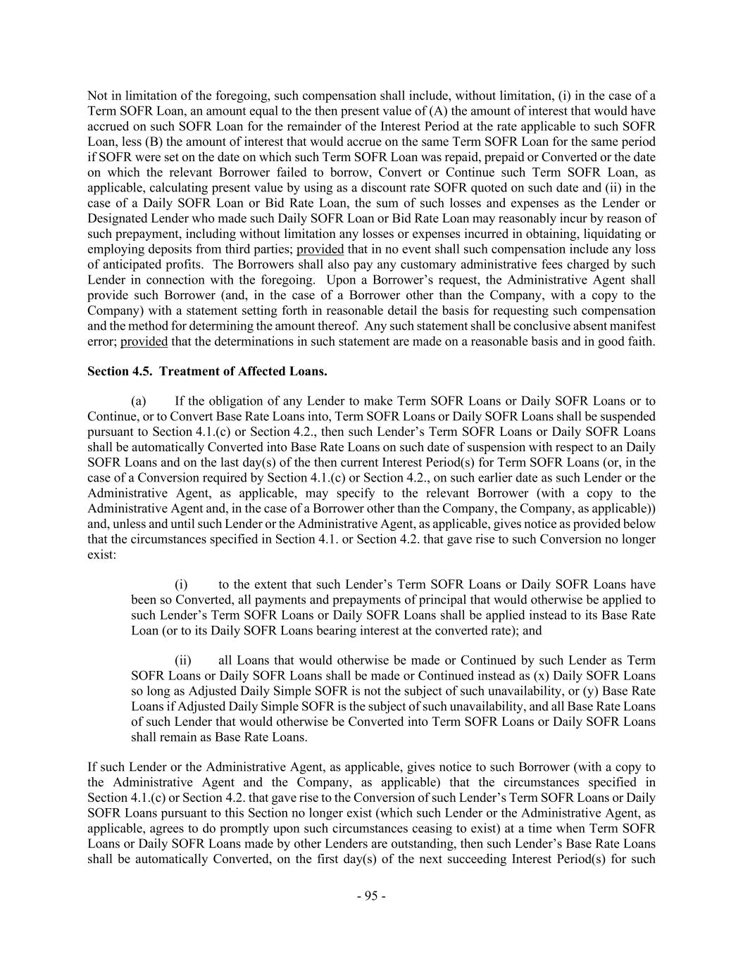 - 95 - Not in limitation of the foregoing, such compensation shall include, without limitation, (i) in the case of a Term SOFR Loan, an amount equal to the then present value of (A) the amount of interest that would have accrued on such SOFR Loan for the remainder of the Interest Period at the rate applicable to such SOFR Loan, less (B) the amount of interest that would accrue on the same Term SOFR Loan for the same period if SOFR were set on the date on which such Term SOFR Loan was repaid, prepaid or Converted or the date on which the relevant Borrower failed to borrow, Convert or Continue such Term SOFR Loan, as applicable, calculating present value by using as a discount rate SOFR quoted on such date and (ii) in the case of a Daily SOFR Loan or Bid Rate Loan, the sum of such losses and expenses as the Lender or Designated Lender who made such Daily SOFR Loan or Bid Rate Loan may reasonably incur by reason of such prepayment, including without limitation any losses or expenses incurred in obtaining, liquidating or employing deposits from third parties; provided that in no event shall such compensation include any loss of anticipated profits. The Borrowers shall also pay any customary administrative fees charged by such Lender in connection with the foregoing. Upon a Borrower’s request, the Administrative Agent shall provide such Borrower (and, in the case of a Borrower other than the Company, with a copy to the Company) with a statement setting forth in reasonable detail the basis for requesting such compensation and the method for determining the amount thereof. Any such statement shall be conclusive absent manifest error; provided that the determinations in such statement are made on a reasonable basis and in good faith. Section 4.5. Treatment of Affected Loans. (a) If the obligation of any Lender to make Term SOFR Loans or Daily SOFR Loans or to Continue, or to Convert Base Rate Loans into, Term SOFR Loans or Daily SOFR Loans shall be suspended pursuant to Section 4.1.(c) or Section 4.2., then such Lender’s Term SOFR Loans or Daily SOFR Loans shall be automatically Converted into Base Rate Loans on such date of suspension with respect to an Daily SOFR Loans and on the last day(s) of the then current Interest Period(s) for Term SOFR Loans (or, in the case of a Conversion required by Section 4.1.(c) or Section 4.2., on such earlier date as such Lender or the Administrative Agent, as applicable, may specify to the relevant Borrower (with a copy to the Administrative Agent and, in the case of a Borrower other than the Company, the Company, as applicable)) and, unless and until such Lender or the Administrative Agent, as applicable, gives notice as provided below that the circumstances specified in Section 4.1. or Section 4.2. that gave rise to such Conversion no longer exist: (i) to the extent that such Lender’s Term SOFR Loans or Daily SOFR Loans have been so Converted, all payments and prepayments of principal that would otherwise be applied to such Lender’s Term SOFR Loans or Daily SOFR Loans shall be applied instead to its Base Rate Loan (or to its Daily SOFR Loans bearing interest at the converted rate); and (ii) all Loans that would otherwise be made or Continued by such Lender as Term SOFR Loans or Daily SOFR Loans shall be made or Continued instead as (x) Daily SOFR Loans so long as Adjusted Daily Simple SOFR is not the subject of such unavailability, or (y) Base Rate Loans if Adjusted Daily Simple SOFR is the subject of such unavailability, and all Base Rate Loans of such Lender that would otherwise be Converted into Term SOFR Loans or Daily SOFR Loans shall remain as Base Rate Loans. If such Lender or the Administrative Agent, as applicable, gives notice to such Borrower (with a copy to the Administrative Agent and the Company, as applicable) that the circumstances specified in Section 4.1.(c) or Section 4.2. that gave rise to the Conversion of such Lender’s Term SOFR Loans or Daily SOFR Loans pursuant to this Section no longer exist (which such Lender or the Administrative Agent, as applicable, agrees to do promptly upon such circumstances ceasing to exist) at a time when Term SOFR Loans or Daily SOFR Loans made by other Lenders are outstanding, then such Lender’s Base Rate Loans shall be automatically Converted, on the first day(s) of the next succeeding Interest Period(s) for such