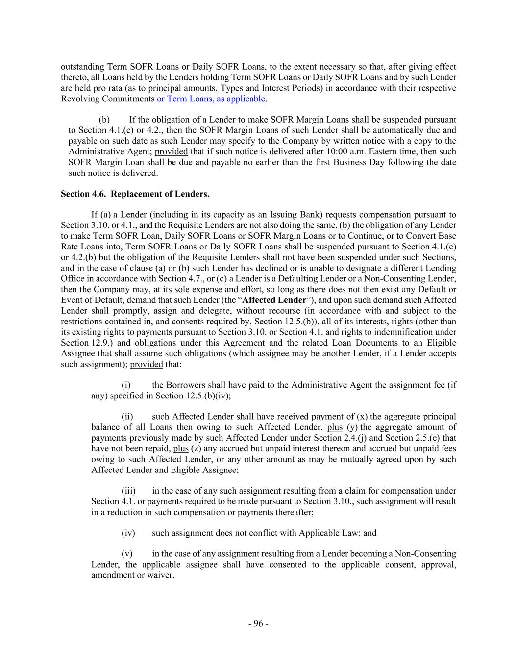 - 96 - outstanding Term SOFR Loans or Daily SOFR Loans, to the extent necessary so that, after giving effect thereto, all Loans held by the Lenders holding Term SOFR Loans or Daily SOFR Loans and by such Lender are held pro rata (as to principal amounts, Types and Interest Periods) in accordance with their respective Revolving Commitments or Term Loans, as applicable. (b) If the obligation of a Lender to make SOFR Margin Loans shall be suspended pursuant to Section 4.1.(c) or 4.2., then the SOFR Margin Loans of such Lender shall be automatically due and payable on such date as such Lender may specify to the Company by written notice with a copy to the Administrative Agent; provided that if such notice is delivered after 10:00 a.m. Eastern time, then such SOFR Margin Loan shall be due and payable no earlier than the first Business Day following the date such notice is delivered. Section 4.6. Replacement of Lenders. If (a) a Lender (including in its capacity as an Issuing Bank) requests compensation pursuant to Section 3.10. or 4.1., and the Requisite Lenders are not also doing the same, (b) the obligation of any Lender to make Term SOFR Loan, Daily SOFR Loans or SOFR Margin Loans or to Continue, or to Convert Base Rate Loans into, Term SOFR Loans or Daily SOFR Loans shall be suspended pursuant to Section 4.1.(c) or 4.2.(b) but the obligation of the Requisite Lenders shall not have been suspended under such Sections, and in the case of clause (a) or (b) such Lender has declined or is unable to designate a different Lending Office in accordance with Section 4.7., or (c) a Lender is a Defaulting Lender or a Non-Consenting Lender, then the Company may, at its sole expense and effort, so long as there does not then exist any Default or Event of Default, demand that such Lender (the “Affected Lender”), and upon such demand such Affected Lender shall promptly, assign and delegate, without recourse (in accordance with and subject to the restrictions contained in, and consents required by, Section 12.5.(b)), all of its interests, rights (other than its existing rights to payments pursuant to Section 3.10. or Section 4.1. and rights to indemnification under Section 12.9.) and obligations under this Agreement and the related Loan Documents to an Eligible Assignee that shall assume such obligations (which assignee may be another Lender, if a Lender accepts such assignment); provided that: (i) the Borrowers shall have paid to the Administrative Agent the assignment fee (if any) specified in Section 12.5.(b)(iv); (ii) such Affected Lender shall have received payment of (x) the aggregate principal balance of all Loans then owing to such Affected Lender, plus (y) the aggregate amount of payments previously made by such Affected Lender under Section 2.4.(j) and Section 2.5.(e) that have not been repaid, plus (z) any accrued but unpaid interest thereon and accrued but unpaid fees owing to such Affected Lender, or any other amount as may be mutually agreed upon by such Affected Lender and Eligible Assignee; (iii) in the case of any such assignment resulting from a claim for compensation under Section 4.1. or payments required to be made pursuant to Section 3.10., such assignment will result in a reduction in such compensation or payments thereafter; (iv) such assignment does not conflict with Applicable Law; and (v) in the case of any assignment resulting from a Lender becoming a Non-Consenting Lender, the applicable assignee shall have consented to the applicable consent, approval, amendment or waiver.