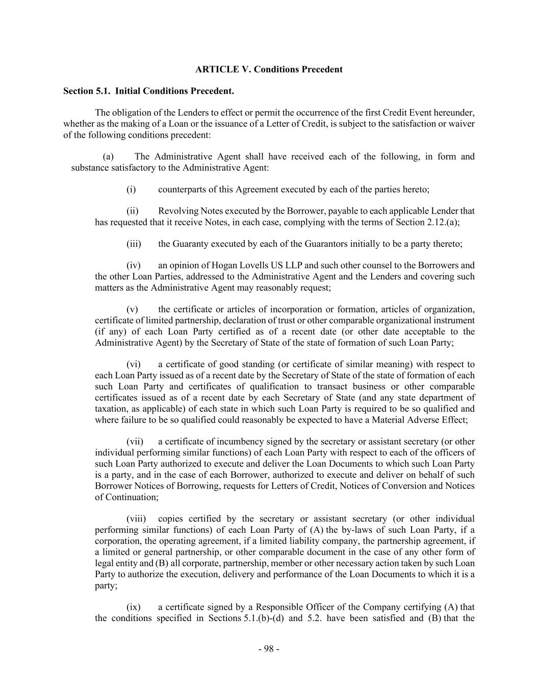 - 98 - ARTICLE V. Conditions Precedent Section 5.1. Initial Conditions Precedent. The obligation of the Lenders to effect or permit the occurrence of the first Credit Event hereunder, whether as the making of a Loan or the issuance of a Letter of Credit, is subject to the satisfaction or waiver of the following conditions precedent: (a) The Administrative Agent shall have received each of the following, in form and substance satisfactory to the Administrative Agent: (i) counterparts of this Agreement executed by each of the parties hereto; (ii) Revolving Notes executed by the Borrower, payable to each applicable Lender that has requested that it receive Notes, in each case, complying with the terms of Section 2.12.(a); (iii) the Guaranty executed by each of the Guarantors initially to be a party thereto; (iv) an opinion of Hogan Lovells US LLP and such other counsel to the Borrowers and the other Loan Parties, addressed to the Administrative Agent and the Lenders and covering such matters as the Administrative Agent may reasonably request; (v) the certificate or articles of incorporation or formation, articles of organization, certificate of limited partnership, declaration of trust or other comparable organizational instrument (if any) of each Loan Party certified as of a recent date (or other date acceptable to the Administrative Agent) by the Secretary of State of the state of formation of such Loan Party; (vi) a certificate of good standing (or certificate of similar meaning) with respect to each Loan Party issued as of a recent date by the Secretary of State of the state of formation of each such Loan Party and certificates of qualification to transact business or other comparable certificates issued as of a recent date by each Secretary of State (and any state department of taxation, as applicable) of each state in which such Loan Party is required to be so qualified and where failure to be so qualified could reasonably be expected to have a Material Adverse Effect; (vii) a certificate of incumbency signed by the secretary or assistant secretary (or other individual performing similar functions) of each Loan Party with respect to each of the officers of such Loan Party authorized to execute and deliver the Loan Documents to which such Loan Party is a party, and in the case of each Borrower, authorized to execute and deliver on behalf of such Borrower Notices of Borrowing, requests for Letters of Credit, Notices of Conversion and Notices of Continuation; (viii) copies certified by the secretary or assistant secretary (or other individual performing similar functions) of each Loan Party of (A) the by-laws of such Loan Party, if a corporation, the operating agreement, if a limited liability company, the partnership agreement, if a limited or general partnership, or other comparable document in the case of any other form of legal entity and (B) all corporate, partnership, member or other necessary action taken by such Loan Party to authorize the execution, delivery and performance of the Loan Documents to which it is a party; (ix) a certificate signed by a Responsible Officer of the Company certifying (A) that the conditions specified in Sections 5.1.(b)-(d) and 5.2. have been satisfied and (B) that the