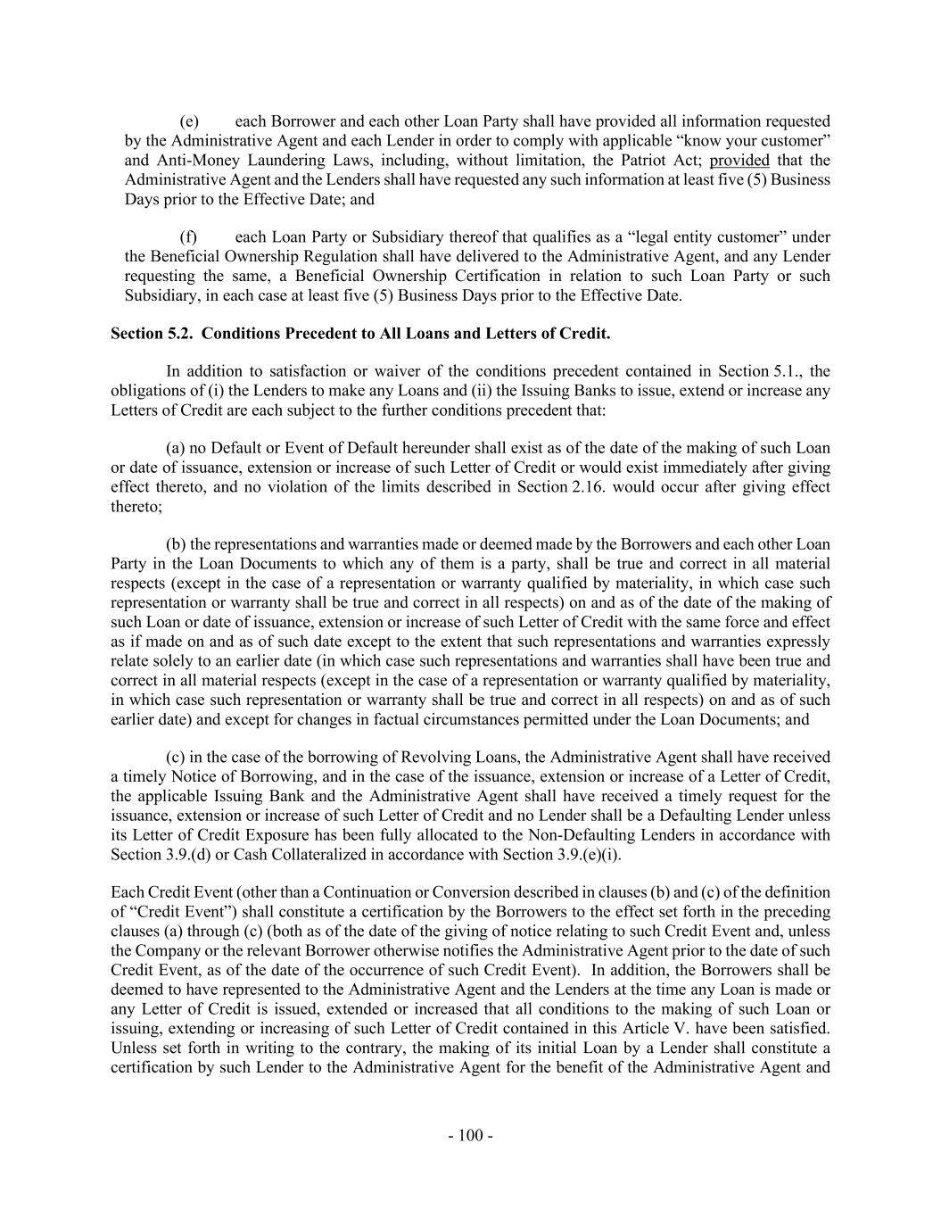 - 100 - (e) each Borrower and each other Loan Party shall have provided all information requested by the Administrative Agent and each Lender in order to comply with applicable “know your customer” and Anti-Money Laundering Laws, including, without limitation, the Patriot Act; provided that the Administrative Agent and the Lenders shall have requested any such information at least five (5) Business Days prior to the Effective Date; and (f) each Loan Party or Subsidiary thereof that qualifies as a “legal entity customer” under the Beneficial Ownership Regulation shall have delivered to the Administrative Agent, and any Lender requesting the same, a Beneficial Ownership Certification in relation to such Loan Party or such Subsidiary, in each case at least five (5) Business Days prior to the Effective Date. Section 5.2. Conditions Precedent to All Loans and Letters of Credit. In addition to satisfaction or waiver of the conditions precedent contained in Section 5.1., the obligations of (i) the Lenders to make any Loans and (ii) the Issuing Banks to issue, extend or increase any Letters of Credit are each subject to the further conditions precedent that: (a) no Default or Event of Default hereunder shall exist as of the date of the making of such Loan or date of issuance, extension or increase of such Letter of Credit or would exist immediately after giving effect thereto, and no violation of the limits described in Section 2.16. would occur after giving effect thereto; (b) the representations and warranties made or deemed made by the Borrowers and each other Loan Party in the Loan Documents to which any of them is a party, shall be true and correct in all material respects (except in the case of a representation or warranty qualified by materiality, in which case such representation or warranty shall be true and correct in all respects) on and as of the date of the making of such Loan or date of issuance, extension or increase of such Letter of Credit with the same force and effect as if made on and as of such date except to the extent that such representations and warranties expressly relate solely to an earlier date (in which case such representations and warranties shall have been true and correct in all material respects (except in the case of a representation or warranty qualified by materiality, in which case such representation or warranty shall be true and correct in all respects) on and as of such earlier date) and except for changes in factual circumstances permitted under the Loan Documents; and (c) in the case of the borrowing of Revolving Loans, the Administrative Agent shall have received a timely Notice of Borrowing, and in the case of the issuance, extension or increase of a Letter of Credit, the applicable Issuing Bank and the Administrative Agent shall have received a timely request for the issuance, extension or increase of such Letter of Credit and no Lender shall be a Defaulting Lender unless its Letter of Credit Exposure has been fully allocated to the Non-Defaulting Lenders in accordance with Section 3.9.(d) or Cash Collateralized in accordance with Section 3.9.(e)(i). Each Credit Event (other than a Continuation or Conversion described in clauses (b) and (c) of the definition of “Credit Event”) shall constitute a certification by the Borrowers to the effect set forth in the preceding clauses (a) through (c) (both as of the date of the giving of notice relating to such Credit Event and, unless the Company or the relevant Borrower otherwise notifies the Administrative Agent prior to the date of such Credit Event, as of the date of the occurrence of such Credit Event). In addition, the Borrowers shall be deemed to have represented to the Administrative Agent and the Lenders at the time any Loan is made or any Letter of Credit is issued, extended or increased that all conditions to the making of such Loan or issuing, extending or increasing of such Letter of Credit contained in this Article V. have been satisfied. Unless set forth in writing to the contrary, the making of its initial Loan by a Lender shall constitute a certification by such Lender to the Administrative Agent for the benefit of the Administrative Agent and
