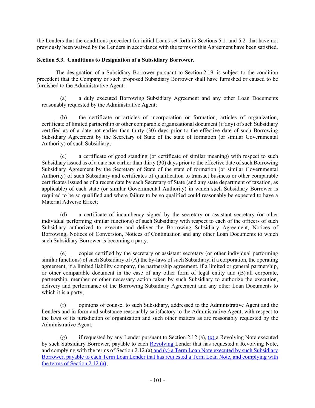 - 101 - the Lenders that the conditions precedent for initial Loans set forth in Sections 5.1. and 5.2. that have not previously been waived by the Lenders in accordance with the terms of this Agreement have been satisfied. Section 5.3. Conditions to Designation of a Subsidiary Borrower. The designation of a Subsidiary Borrower pursuant to Section 2.19. is subject to the condition precedent that the Company or such proposed Subsidiary Borrower shall have furnished or caused to be furnished to the Administrative Agent: (a) a duly executed Borrowing Subsidiary Agreement and any other Loan Documents reasonably requested by the Administrative Agent; (b) the certificate or articles of incorporation or formation, articles of organization, certificate of limited partnership or other comparable organizational document (if any) of such Subsidiary certified as of a date not earlier than thirty (30) days prior to the effective date of such Borrowing Subsidiary Agreement by the Secretary of State of the state of formation (or similar Governmental Authority) of such Subsidiary; (c) a certificate of good standing (or certificate of similar meaning) with respect to such Subsidiary issued as of a date not earlier than thirty (30) days prior to the effective date of such Borrowing Subsidiary Agreement by the Secretary of State of the state of formation (or similar Governmental Authority) of such Subsidiary and certificates of qualification to transact business or other comparable certificates issued as of a recent date by each Secretary of State (and any state department of taxation, as applicable) of each state (or similar Governmental Authority) in which such Subsidiary Borrower is required to be so qualified and where failure to be so qualified could reasonably be expected to have a Material Adverse Effect; (d) a certificate of incumbency signed by the secretary or assistant secretary (or other individual performing similar functions) of such Subsidiary with respect to each of the officers of such Subsidiary authorized to execute and deliver the Borrowing Subsidiary Agreement, Notices of Borrowing, Notices of Conversion, Notices of Continuation and any other Loan Documents to which such Subsidiary Borrower is becoming a party; (e) copies certified by the secretary or assistant secretary (or other individual performing similar functions) of such Subsidiary of (A) the by-laws of such Subsidiary, if a corporation, the operating agreement, if a limited liability company, the partnership agreement, if a limited or general partnership, or other comparable document in the case of any other form of legal entity and (B) all corporate, partnership, member or other necessary action taken by such Subsidiary to authorize the execution, delivery and performance of the Borrowing Subsidiary Agreement and any other Loan Documents to which it is a party; (f) opinions of counsel to such Subsidiary, addressed to the Administrative Agent and the Lenders and in form and substance reasonably satisfactory to the Administrative Agent, with respect to the laws of its jurisdiction of organization and such other matters as are reasonably requested by the Administrative Agent; (g) if requested by any Lender pursuant to Section 2.12.(a), (x) a Revolving Note executed by such Subsidiary Borrower, payable to each Revolving Lender that has requested a Revolving Note, and complying with the terms of Section 2.12.(a) and (y) a Term Loan Note executed by such Subsidiary Borrower, payable to each Term Loan Lender that has requested a Term Loan Note, and complying with the terms of Section 2.12.(a);