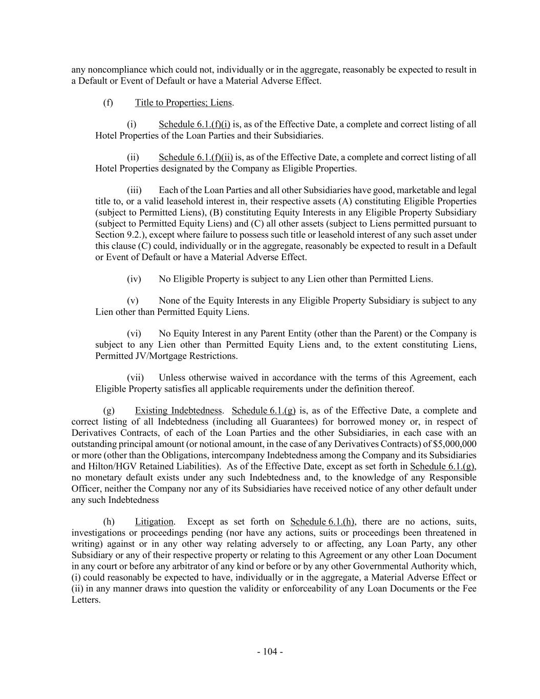 - 104 - any noncompliance which could not, individually or in the aggregate, reasonably be expected to result in a Default or Event of Default or have a Material Adverse Effect. (f) Title to Properties; Liens. (i) Schedule 6.1.(f)(i) is, as of the Effective Date, a complete and correct listing of all Hotel Properties of the Loan Parties and their Subsidiaries. (ii) Schedule 6.1.(f)(ii) is, as of the Effective Date, a complete and correct listing of all Hotel Properties designated by the Company as Eligible Properties. (iii) Each of the Loan Parties and all other Subsidiaries have good, marketable and legal title to, or a valid leasehold interest in, their respective assets (A) constituting Eligible Properties (subject to Permitted Liens), (B) constituting Equity Interests in any Eligible Property Subsidiary (subject to Permitted Equity Liens) and (C) all other assets (subject to Liens permitted pursuant to Section 9.2.), except where failure to possess such title or leasehold interest of any such asset under this clause (C) could, individually or in the aggregate, reasonably be expected to result in a Default or Event of Default or have a Material Adverse Effect. (iv) No Eligible Property is subject to any Lien other than Permitted Liens. (v) None of the Equity Interests in any Eligible Property Subsidiary is subject to any Lien other than Permitted Equity Liens. (vi) No Equity Interest in any Parent Entity (other than the Parent) or the Company is subject to any Lien other than Permitted Equity Liens and, to the extent constituting Liens, Permitted JV/Mortgage Restrictions. (vii) Unless otherwise waived in accordance with the terms of this Agreement, each Eligible Property satisfies all applicable requirements under the definition thereof. (g) Existing Indebtedness. Schedule 6.1.(g) is, as of the Effective Date, a complete and correct listing of all Indebtedness (including all Guarantees) for borrowed money or, in respect of Derivatives Contracts, of each of the Loan Parties and the other Subsidiaries, in each case with an outstanding principal amount (or notional amount, in the case of any Derivatives Contracts) of $5,000,000 or more (other than the Obligations, intercompany Indebtedness among the Company and its Subsidiaries and Hilton/HGV Retained Liabilities). As of the Effective Date, except as set forth in Schedule 6.1.(g), no monetary default exists under any such Indebtedness and, to the knowledge of any Responsible Officer, neither the Company nor any of its Subsidiaries have received notice of any other default under any such Indebtedness (h) Litigation. Except as set forth on Schedule 6.1.(h), there are no actions, suits, investigations or proceedings pending (nor have any actions, suits or proceedings been threatened in writing) against or in any other way relating adversely to or affecting, any Loan Party, any other Subsidiary or any of their respective property or relating to this Agreement or any other Loan Document in any court or before any arbitrator of any kind or before or by any other Governmental Authority which, (i) could reasonably be expected to have, individually or in the aggregate, a Material Adverse Effect or (ii) in any manner draws into question the validity or enforceability of any Loan Documents or the Fee Letters.