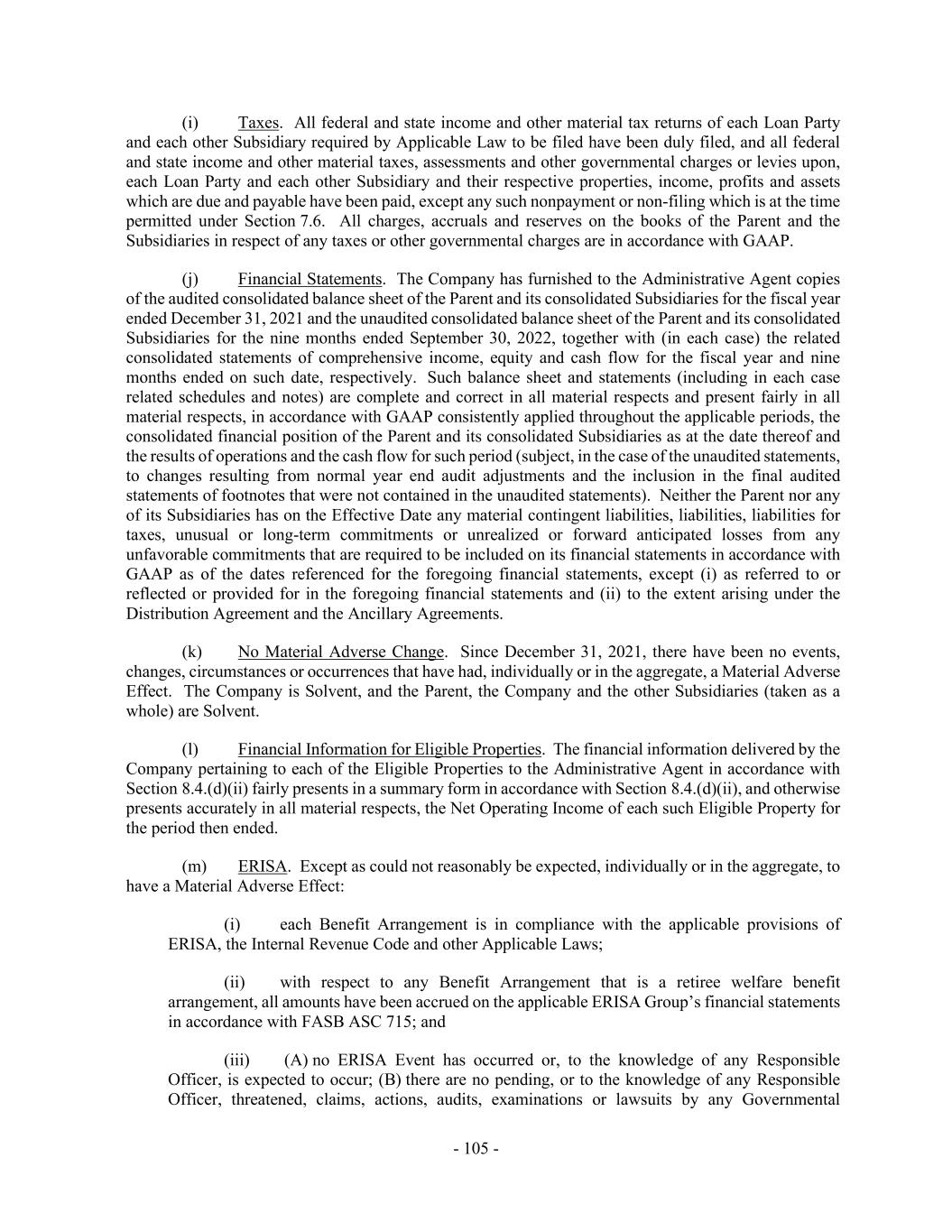 - 105 - (i) Taxes. All federal and state income and other material tax returns of each Loan Party and each other Subsidiary required by Applicable Law to be filed have been duly filed, and all federal and state income and other material taxes, assessments and other governmental charges or levies upon, each Loan Party and each other Subsidiary and their respective properties, income, profits and assets which are due and payable have been paid, except any such nonpayment or non-filing which is at the time permitted under Section 7.6. All charges, accruals and reserves on the books of the Parent and the Subsidiaries in respect of any taxes or other governmental charges are in accordance with GAAP. (j) Financial Statements. The Company has furnished to the Administrative Agent copies of the audited consolidated balance sheet of the Parent and its consolidated Subsidiaries for the fiscal year ended December 31, 2021 and the unaudited consolidated balance sheet of the Parent and its consolidated Subsidiaries for the nine months ended September 30, 2022, together with (in each case) the related consolidated statements of comprehensive income, equity and cash flow for the fiscal year and nine months ended on such date, respectively. Such balance sheet and statements (including in each case related schedules and notes) are complete and correct in all material respects and present fairly in all material respects, in accordance with GAAP consistently applied throughout the applicable periods, the consolidated financial position of the Parent and its consolidated Subsidiaries as at the date thereof and the results of operations and the cash flow for such period (subject, in the case of the unaudited statements, to changes resulting from normal year end audit adjustments and the inclusion in the final audited statements of footnotes that were not contained in the unaudited statements). Neither the Parent nor any of its Subsidiaries has on the Effective Date any material contingent liabilities, liabilities, liabilities for taxes, unusual or long-term commitments or unrealized or forward anticipated losses from any unfavorable commitments that are required to be included on its financial statements in accordance with GAAP as of the dates referenced for the foregoing financial statements, except (i) as referred to or reflected or provided for in the foregoing financial statements and (ii) to the extent arising under the Distribution Agreement and the Ancillary Agreements. (k) No Material Adverse Change. Since December 31, 2021, there have been no events, changes, circumstances or occurrences that have had, individually or in the aggregate, a Material Adverse Effect. The Company is Solvent, and the Parent, the Company and the other Subsidiaries (taken as a whole) are Solvent. (l) Financial Information for Eligible Properties. The financial information delivered by the Company pertaining to each of the Eligible Properties to the Administrative Agent in accordance with Section 8.4.(d)(ii) fairly presents in a summary form in accordance with Section 8.4.(d)(ii), and otherwise presents accurately in all material respects, the Net Operating Income of each such Eligible Property for the period then ended. (m) ERISA. Except as could not reasonably be expected, individually or in the aggregate, to have a Material Adverse Effect: (i) each Benefit Arrangement is in compliance with the applicable provisions of ERISA, the Internal Revenue Code and other Applicable Laws; (ii) with respect to any Benefit Arrangement that is a retiree welfare benefit arrangement, all amounts have been accrued on the applicable ERISA Group’s financial statements in accordance with FASB ASC 715; and (iii) (A) no ERISA Event has occurred or, to the knowledge of any Responsible Officer, is expected to occur; (B) there are no pending, or to the knowledge of any Responsible Officer, threatened, claims, actions, audits, examinations or lawsuits by any Governmental