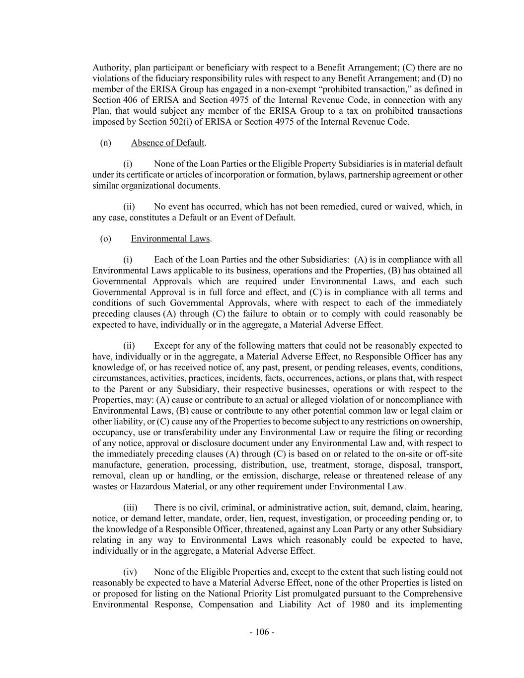 - 106 - Authority, plan participant or beneficiary with respect to a Benefit Arrangement; (C) there are no violations of the fiduciary responsibility rules with respect to any Benefit Arrangement; and (D) no member of the ERISA Group has engaged in a non-exempt “prohibited transaction,” as defined in Section 406 of ERISA and Section 4975 of the Internal Revenue Code, in connection with any Plan, that would subject any member of the ERISA Group to a tax on prohibited transactions imposed by Section 502(i) of ERISA or Section 4975 of the Internal Revenue Code. (n) Absence of Default. (i) None of the Loan Parties or the Eligible Property Subsidiaries is in material default under its certificate or articles of incorporation or formation, bylaws, partnership agreement or other similar organizational documents. (ii) No event has occurred, which has not been remedied, cured or waived, which, in any case, constitutes a Default or an Event of Default. (o) Environmental Laws. (i) Each of the Loan Parties and the other Subsidiaries: (A) is in compliance with all Environmental Laws applicable to its business, operations and the Properties, (B) has obtained all Governmental Approvals which are required under Environmental Laws, and each such Governmental Approval is in full force and effect, and (C) is in compliance with all terms and conditions of such Governmental Approvals, where with respect to each of the immediately preceding clauses (A) through (C) the failure to obtain or to comply with could reasonably be expected to have, individually or in the aggregate, a Material Adverse Effect. (ii) Except for any of the following matters that could not be reasonably expected to have, individually or in the aggregate, a Material Adverse Effect, no Responsible Officer has any knowledge of, or has received notice of, any past, present, or pending releases, events, conditions, circumstances, activities, practices, incidents, facts, occurrences, actions, or plans that, with respect to the Parent or any Subsidiary, their respective businesses, operations or with respect to the Properties, may: (A) cause or contribute to an actual or alleged violation of or noncompliance with Environmental Laws, (B) cause or contribute to any other potential common law or legal claim or other liability, or (C) cause any of the Properties to become subject to any restrictions on ownership, occupancy, use or transferability under any Environmental Law or require the filing or recording of any notice, approval or disclosure document under any Environmental Law and, with respect to the immediately preceding clauses (A) through (C) is based on or related to the on-site or off-site manufacture, generation, processing, distribution, use, treatment, storage, disposal, transport, removal, clean up or handling, or the emission, discharge, release or threatened release of any wastes or Hazardous Material, or any other requirement under Environmental Law. (iii) There is no civil, criminal, or administrative action, suit, demand, claim, hearing, notice, or demand letter, mandate, order, lien, request, investigation, or proceeding pending or, to the knowledge of a Responsible Officer, threatened, against any Loan Party or any other Subsidiary relating in any way to Environmental Laws which reasonably could be expected to have, individually or in the aggregate, a Material Adverse Effect. (iv) None of the Eligible Properties and, except to the extent that such listing could not reasonably be expected to have a Material Adverse Effect, none of the other Properties is listed on or proposed for listing on the National Priority List promulgated pursuant to the Comprehensive Environmental Response, Compensation and Liability Act of 1980 and its implementing
