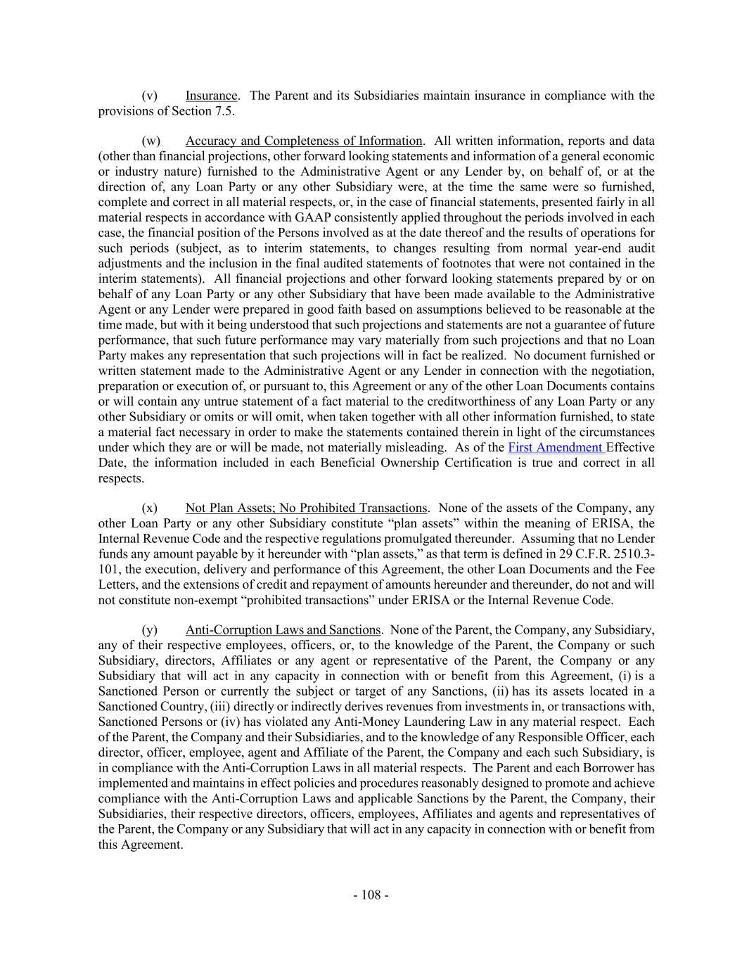 - 108 - (v) Insurance. The Parent and its Subsidiaries maintain insurance in compliance with the provisions of Section 7.5. (w) Accuracy and Completeness of Information. All written information, reports and data (other than financial projections, other forward looking statements and information of a general economic or industry nature) furnished to the Administrative Agent or any Lender by, on behalf of, or at the direction of, any Loan Party or any other Subsidiary were, at the time the same were so furnished, complete and correct in all material respects, or, in the case of financial statements, presented fairly in all material respects in accordance with GAAP consistently applied throughout the periods involved in each case, the financial position of the Persons involved as at the date thereof and the results of operations for such periods (subject, as to interim statements, to changes resulting from normal year-end audit adjustments and the inclusion in the final audited statements of footnotes that were not contained in the interim statements). All financial projections and other forward looking statements prepared by or on behalf of any Loan Party or any other Subsidiary that have been made available to the Administrative Agent or any Lender were prepared in good faith based on assumptions believed to be reasonable at the time made, but with it being understood that such projections and statements are not a guarantee of future performance, that such future performance may vary materially from such projections and that no Loan Party makes any representation that such projections will in fact be realized. No document furnished or written statement made to the Administrative Agent or any Lender in connection with the negotiation, preparation or execution of, or pursuant to, this Agreement or any of the other Loan Documents contains or will contain any untrue statement of a fact material to the creditworthiness of any Loan Party or any other Subsidiary or omits or will omit, when taken together with all other information furnished, to state a material fact necessary in order to make the statements contained therein in light of the circumstances under which they are or will be made, not materially misleading. As of the First Amendment Effective Date, the information included in each Beneficial Ownership Certification is true and correct in all respects. (x) Not Plan Assets; No Prohibited Transactions. None of the assets of the Company, any other Loan Party or any other Subsidiary constitute “plan assets” within the meaning of ERISA, the Internal Revenue Code and the respective regulations promulgated thereunder. Assuming that no Lender funds any amount payable by it hereunder with “plan assets,” as that term is defined in 29 C.F.R. 2510.3- 101, the execution, delivery and performance of this Agreement, the other Loan Documents and the Fee Letters, and the extensions of credit and repayment of amounts hereunder and thereunder, do not and will not constitute non-exempt “prohibited transactions” under ERISA or the Internal Revenue Code. (y) Anti-Corruption Laws and Sanctions. None of the Parent, the Company, any Subsidiary, any of their respective employees, officers, or, to the knowledge of the Parent, the Company or such Subsidiary, directors, Affiliates or any agent or representative of the Parent, the Company or any Subsidiary that will act in any capacity in connection with or benefit from this Agreement, (i) is a Sanctioned Person or currently the subject or target of any Sanctions, (ii) has its assets located in a Sanctioned Country, (iii) directly or indirectly derives revenues from investments in, or transactions with, Sanctioned Persons or (iv) has violated any Anti-Money Laundering Law in any material respect. Each of the Parent, the Company and their Subsidiaries, and to the knowledge of any Responsible Officer, each director, officer, employee, agent and Affiliate of the Parent, the Company and each such Subsidiary, is in compliance with the Anti-Corruption Laws in all material respects. The Parent and each Borrower has implemented and maintains in effect policies and procedures reasonably designed to promote and achieve compliance with the Anti-Corruption Laws and applicable Sanctions by the Parent, the Company, their Subsidiaries, their respective directors, officers, employees, Affiliates and agents and representatives of the Parent, the Company or any Subsidiary that will act in any capacity in connection with or benefit from this Agreement.