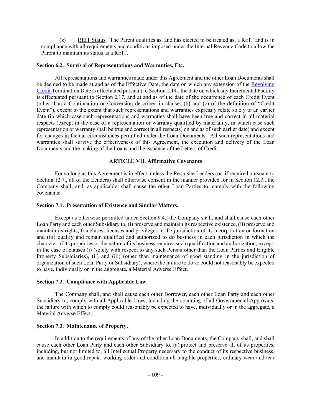 - 109 - (z) REIT Status. The Parent qualifies as, and has elected to be treated as, a REIT and is in compliance with all requirements and conditions imposed under the Internal Revenue Code to allow the Parent to maintain its status as a REIT. Section 6.2. Survival of Representations and Warranties, Etc. All representations and warranties made under this Agreement and the other Loan Documents shall be deemed to be made at and as of the Effective Date, the date on which any extension of the Revolving Credit Termination Date is effectuated pursuant to Section 2.14., the date on which any Incremental Facility is effectuated pursuant to Section 2.17. and at and as of the date of the occurrence of each Credit Event (other than a Continuation or Conversion described in clauses (b) and (c) of the definition of “Credit Event”), except to the extent that such representations and warranties expressly relate solely to an earlier date (in which case such representations and warranties shall have been true and correct in all material respects (except in the case of a representation or warranty qualified by materiality, in which case such representation or warranty shall be true and correct in all respects) on and as of such earlier date) and except for changes in factual circumstances permitted under the Loan Documents. All such representations and warranties shall survive the effectiveness of this Agreement, the execution and delivery of the Loan Documents and the making of the Loans and the issuance of the Letters of Credit. ARTICLE VII. Affirmative Covenants For so long as this Agreement is in effect, unless the Requisite Lenders (or, if required pursuant to Section 12.7., all of the Lenders) shall otherwise consent in the manner provided for in Section 12.7., the Company shall, and, as applicable, shall cause the other Loan Parties to, comply with the following covenants: Section 7.1. Preservation of Existence and Similar Matters. Except as otherwise permitted under Section 9.4., the Company shall, and shall cause each other Loan Party and each other Subsidiary to, (i) preserve and maintain its respective existence, (ii) preserve and maintain its rights, franchises, licenses and privileges in the jurisdiction of its incorporation or formation and (iii) qualify and remain qualified and authorized to do business in each jurisdiction in which the character of its properties or the nature of its business requires such qualification and authorization; except, in the case of clauses (i) (solely with respect to any such Person other than the Loan Parties and Eligible Property Subsidiaries), (ii) and (iii) (other than maintenance of good standing in the jurisdiction of organization of such Loan Party or Subsidiary), where the failure to do so could not reasonably be expected to have, individually or in the aggregate, a Material Adverse Effect. Section 7.2. Compliance with Applicable Law. The Company shall, and shall cause each other Borrower, each other Loan Party and each other Subsidiary to, comply with all Applicable Laws, including the obtaining of all Governmental Approvals, the failure with which to comply could reasonably be expected to have, individually or in the aggregate, a Material Adverse Effect. Section 7.3. Maintenance of Property. In addition to the requirements of any of the other Loan Documents, the Company shall, and shall cause each other Loan Party and each other Subsidiary to, (a) protect and preserve all of its properties, including, but not limited to, all Intellectual Property necessary to the conduct of its respective business, and maintain in good repair, working order and condition all tangible properties, ordinary wear and tear
