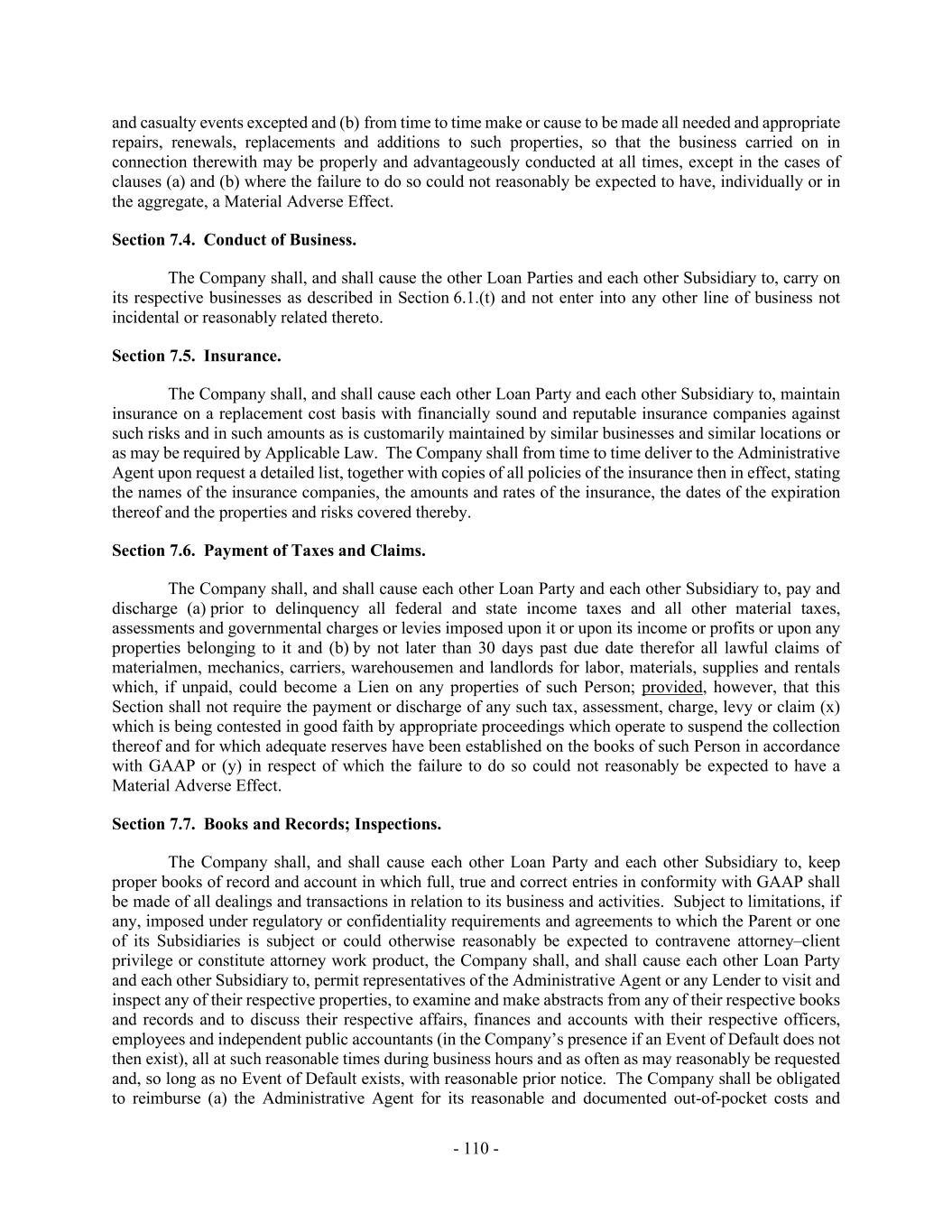 - 110 - and casualty events excepted and (b) from time to time make or cause to be made all needed and appropriate repairs, renewals, replacements and additions to such properties, so that the business carried on in connection therewith may be properly and advantageously conducted at all times, except in the cases of clauses (a) and (b) where the failure to do so could not reasonably be expected to have, individually or in the aggregate, a Material Adverse Effect. Section 7.4. Conduct of Business. The Company shall, and shall cause the other Loan Parties and each other Subsidiary to, carry on its respective businesses as described in Section 6.1.(t) and not enter into any other line of business not incidental or reasonably related thereto. Section 7.5. Insurance. The Company shall, and shall cause each other Loan Party and each other Subsidiary to, maintain insurance on a replacement cost basis with financially sound and reputable insurance companies against such risks and in such amounts as is customarily maintained by similar businesses and similar locations or as may be required by Applicable Law. The Company shall from time to time deliver to the Administrative Agent upon request a detailed list, together with copies of all policies of the insurance then in effect, stating the names of the insurance companies, the amounts and rates of the insurance, the dates of the expiration thereof and the properties and risks covered thereby. Section 7.6. Payment of Taxes and Claims. The Company shall, and shall cause each other Loan Party and each other Subsidiary to, pay and discharge (a) prior to delinquency all federal and state income taxes and all other material taxes, assessments and governmental charges or levies imposed upon it or upon its income or profits or upon any properties belonging to it and (b) by not later than 30 days past due date therefor all lawful claims of materialmen, mechanics, carriers, warehousemen and landlords for labor, materials, supplies and rentals which, if unpaid, could become a Lien on any properties of such Person; provided, however, that this Section shall not require the payment or discharge of any such tax, assessment, charge, levy or claim (x) which is being contested in good faith by appropriate proceedings which operate to suspend the collection thereof and for which adequate reserves have been established on the books of such Person in accordance with GAAP or (y) in respect of which the failure to do so could not reasonably be expected to have a Material Adverse Effect. Section 7.7. Books and Records; Inspections. The Company shall, and shall cause each other Loan Party and each other Subsidiary to, keep proper books of record and account in which full, true and correct entries in conformity with GAAP shall be made of all dealings and transactions in relation to its business and activities. Subject to limitations, if any, imposed under regulatory or confidentiality requirements and agreements to which the Parent or one of its Subsidiaries is subject or could otherwise reasonably be expected to contravene attorney–client privilege or constitute attorney work product, the Company shall, and shall cause each other Loan Party and each other Subsidiary to, permit representatives of the Administrative Agent or any Lender to visit and inspect any of their respective properties, to examine and make abstracts from any of their respective books and records and to discuss their respective affairs, finances and accounts with their respective officers, employees and independent public accountants (in the Company’s presence if an Event of Default does not then exist), all at such reasonable times during business hours and as often as may reasonably be requested and, so long as no Event of Default exists, with reasonable prior notice. The Company shall be obligated to reimburse (a) the Administrative Agent for its reasonable and documented out-of-pocket costs and