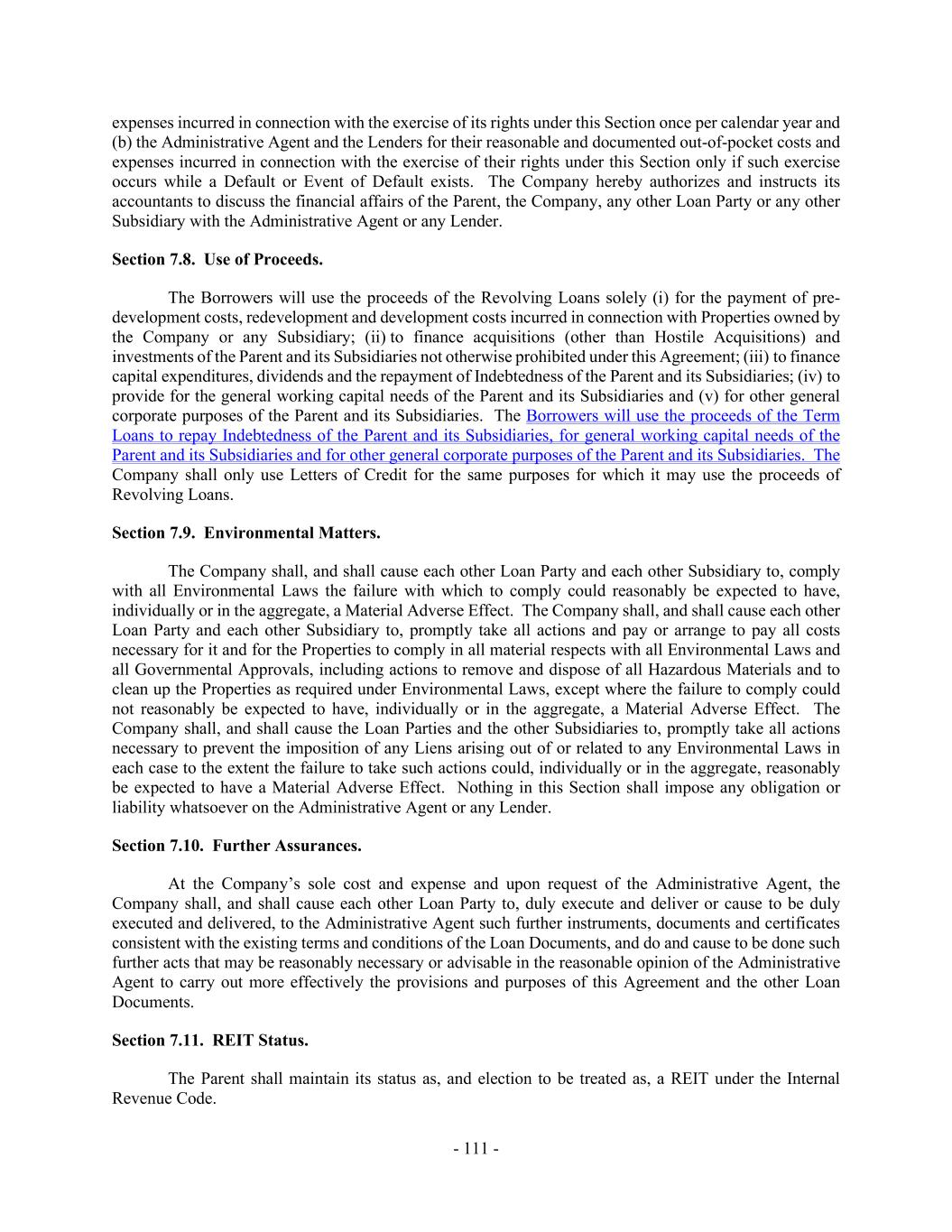 - 111 - expenses incurred in connection with the exercise of its rights under this Section once per calendar year and (b) the Administrative Agent and the Lenders for their reasonable and documented out-of-pocket costs and expenses incurred in connection with the exercise of their rights under this Section only if such exercise occurs while a Default or Event of Default exists. The Company hereby authorizes and instructs its accountants to discuss the financial affairs of the Parent, the Company, any other Loan Party or any other Subsidiary with the Administrative Agent or any Lender. Section 7.8. Use of Proceeds. The Borrowers will use the proceeds of the Revolving Loans solely (i) for the payment of pre- development costs, redevelopment and development costs incurred in connection with Properties owned by the Company or any Subsidiary; (ii) to finance acquisitions (other than Hostile Acquisitions) and investments of the Parent and its Subsidiaries not otherwise prohibited under this Agreement; (iii) to finance capital expenditures, dividends and the repayment of Indebtedness of the Parent and its Subsidiaries; (iv) to provide for the general working capital needs of the Parent and its Subsidiaries and (v) for other general corporate purposes of the Parent and its Subsidiaries. The Borrowers will use the proceeds of the Term Loans to repay Indebtedness of the Parent and its Subsidiaries, for general working capital needs of the Parent and its Subsidiaries and for other general corporate purposes of the Parent and its Subsidiaries. The Company shall only use Letters of Credit for the same purposes for which it may use the proceeds of Revolving Loans. Section 7.9. Environmental Matters. The Company shall, and shall cause each other Loan Party and each other Subsidiary to, comply with all Environmental Laws the failure with which to comply could reasonably be expected to have, individually or in the aggregate, a Material Adverse Effect. The Company shall, and shall cause each other Loan Party and each other Subsidiary to, promptly take all actions and pay or arrange to pay all costs necessary for it and for the Properties to comply in all material respects with all Environmental Laws and all Governmental Approvals, including actions to remove and dispose of all Hazardous Materials and to clean up the Properties as required under Environmental Laws, except where the failure to comply could not reasonably be expected to have, individually or in the aggregate, a Material Adverse Effect. The Company shall, and shall cause the Loan Parties and the other Subsidiaries to, promptly take all actions necessary to prevent the imposition of any Liens arising out of or related to any Environmental Laws in each case to the extent the failure to take such actions could, individually or in the aggregate, reasonably be expected to have a Material Adverse Effect. Nothing in this Section shall impose any obligation or liability whatsoever on the Administrative Agent or any Lender. Section 7.10. Further Assurances. At the Company’s sole cost and expense and upon request of the Administrative Agent, the Company shall, and shall cause each other Loan Party to, duly execute and deliver or cause to be duly executed and delivered, to the Administrative Agent such further instruments, documents and certificates consistent with the existing terms and conditions of the Loan Documents, and do and cause to be done such further acts that may be reasonably necessary or advisable in the reasonable opinion of the Administrative Agent to carry out more effectively the provisions and purposes of this Agreement and the other Loan Documents. Section 7.11. REIT Status. The Parent shall maintain its status as, and election to be treated as, a REIT under the Internal Revenue Code.