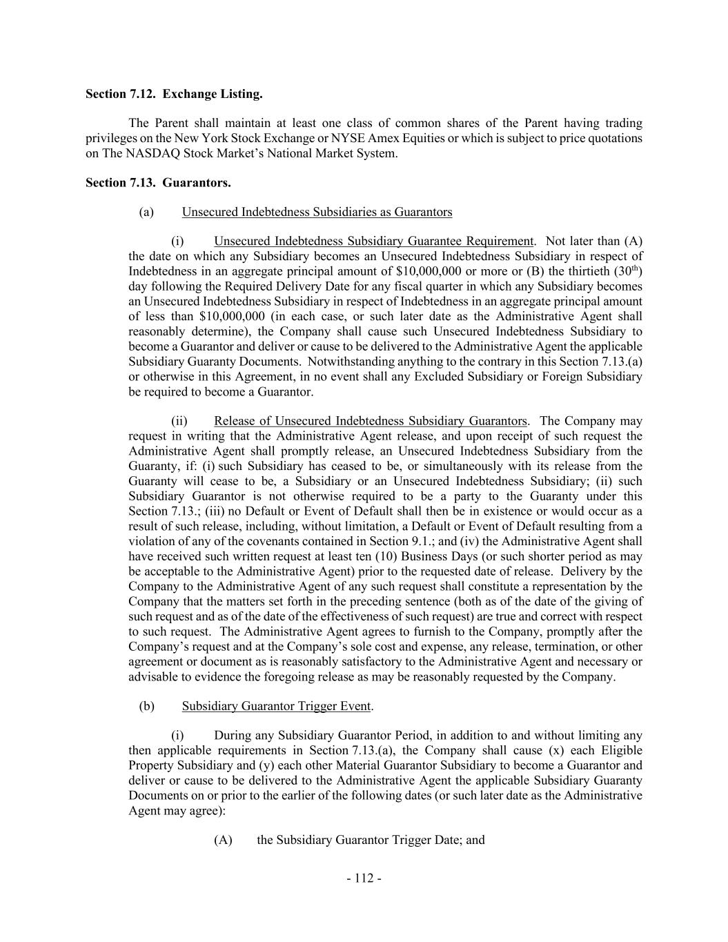 - 112 - Section 7.12. Exchange Listing. The Parent shall maintain at least one class of common shares of the Parent having trading privileges on the New York Stock Exchange or NYSE Amex Equities or which is subject to price quotations on The NASDAQ Stock Market’s National Market System. Section 7.13. Guarantors. (a) Unsecured Indebtedness Subsidiaries as Guarantors (i) Unsecured Indebtedness Subsidiary Guarantee Requirement. Not later than (A) the date on which any Subsidiary becomes an Unsecured Indebtedness Subsidiary in respect of Indebtedness in an aggregate principal amount of $10,000,000 or more or (B) the thirtieth (30th) day following the Required Delivery Date for any fiscal quarter in which any Subsidiary becomes an Unsecured Indebtedness Subsidiary in respect of Indebtedness in an aggregate principal amount of less than $10,000,000 (in each case, or such later date as the Administrative Agent shall reasonably determine), the Company shall cause such Unsecured Indebtedness Subsidiary to become a Guarantor and deliver or cause to be delivered to the Administrative Agent the applicable Subsidiary Guaranty Documents. Notwithstanding anything to the contrary in this Section 7.13.(a) or otherwise in this Agreement, in no event shall any Excluded Subsidiary or Foreign Subsidiary be required to become a Guarantor. (ii) Release of Unsecured Indebtedness Subsidiary Guarantors. The Company may request in writing that the Administrative Agent release, and upon receipt of such request the Administrative Agent shall promptly release, an Unsecured Indebtedness Subsidiary from the Guaranty, if: (i) such Subsidiary has ceased to be, or simultaneously with its release from the Guaranty will cease to be, a Subsidiary or an Unsecured Indebtedness Subsidiary; (ii) such Subsidiary Guarantor is not otherwise required to be a party to the Guaranty under this Section 7.13.; (iii) no Default or Event of Default shall then be in existence or would occur as a result of such release, including, without limitation, a Default or Event of Default resulting from a violation of any of the covenants contained in Section 9.1.; and (iv) the Administrative Agent shall have received such written request at least ten (10) Business Days (or such shorter period as may be acceptable to the Administrative Agent) prior to the requested date of release. Delivery by the Company to the Administrative Agent of any such request shall constitute a representation by the Company that the matters set forth in the preceding sentence (both as of the date of the giving of such request and as of the date of the effectiveness of such request) are true and correct with respect to such request. The Administrative Agent agrees to furnish to the Company, promptly after the Company’s request and at the Company’s sole cost and expense, any release, termination, or other agreement or document as is reasonably satisfactory to the Administrative Agent and necessary or advisable to evidence the foregoing release as may be reasonably requested by the Company. (b) Subsidiary Guarantor Trigger Event. (i) During any Subsidiary Guarantor Period, in addition to and without limiting any then applicable requirements in Section 7.13.(a), the Company shall cause (x) each Eligible Property Subsidiary and (y) each other Material Guarantor Subsidiary to become a Guarantor and deliver or cause to be delivered to the Administrative Agent the applicable Subsidiary Guaranty Documents on or prior to the earlier of the following dates (or such later date as the Administrative Agent may agree): (A) the Subsidiary Guarantor Trigger Date; and