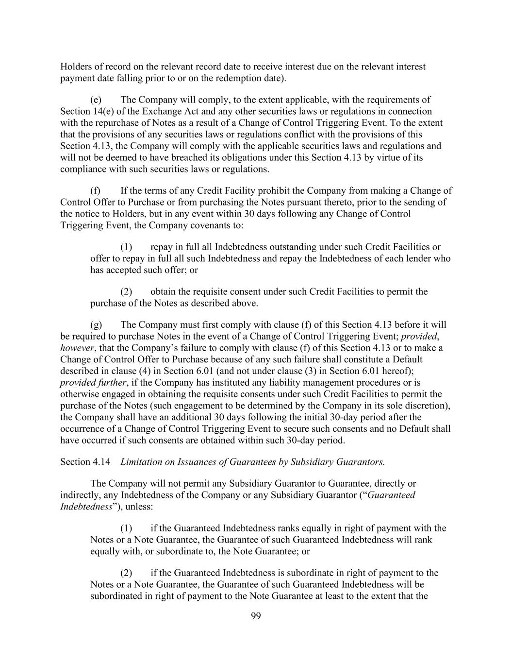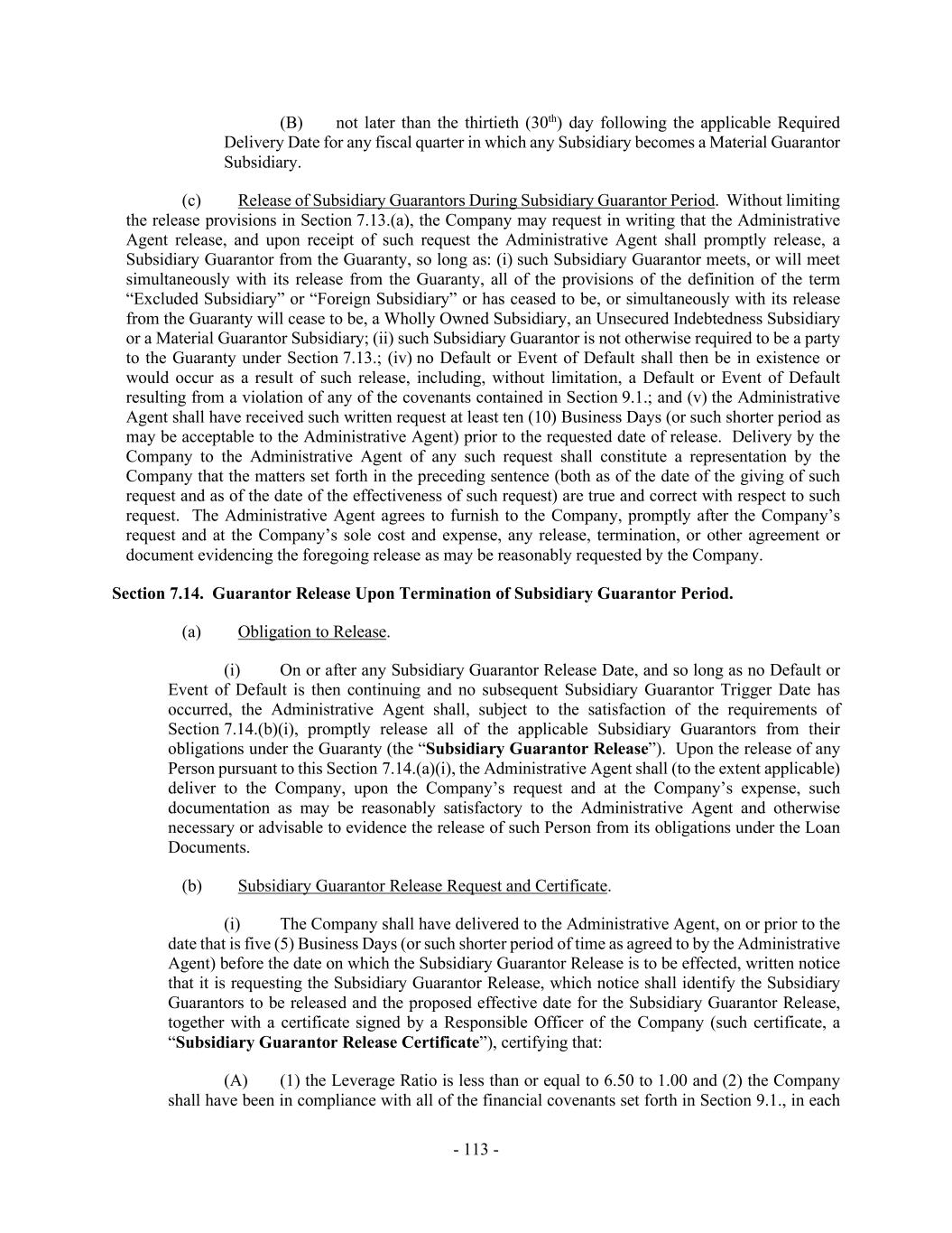 - 113 - (B) not later than the thirtieth (30th) day following the applicable Required Delivery Date for any fiscal quarter in which any Subsidiary becomes a Material Guarantor Subsidiary. (c) Release of Subsidiary Guarantors During Subsidiary Guarantor Period. Without limiting the release provisions in Section 7.13.(a), the Company may request in writing that the Administrative Agent release, and upon receipt of such request the Administrative Agent shall promptly release, a Subsidiary Guarantor from the Guaranty, so long as: (i) such Subsidiary Guarantor meets, or will meet simultaneously with its release from the Guaranty, all of the provisions of the definition of the term “Excluded Subsidiary” or “Foreign Subsidiary” or has ceased to be, or simultaneously with its release from the Guaranty will cease to be, a Wholly Owned Subsidiary, an Unsecured Indebtedness Subsidiary or a Material Guarantor Subsidiary; (ii) such Subsidiary Guarantor is not otherwise required to be a party to the Guaranty under Section 7.13.; (iv) no Default or Event of Default shall then be in existence or would occur as a result of such release, including, without limitation, a Default or Event of Default resulting from a violation of any of the covenants contained in Section 9.1.; and (v) the Administrative Agent shall have received such written request at least ten (10) Business Days (or such shorter period as may be acceptable to the Administrative Agent) prior to the requested date of release. Delivery by the Company to the Administrative Agent of any such request shall constitute a representation by the Company that the matters set forth in the preceding sentence (both as of the date of the giving of such request and as of the date of the effectiveness of such request) are true and correct with respect to such request. The Administrative Agent agrees to furnish to the Company, promptly after the Company’s request and at the Company’s sole cost and expense, any release, termination, or other agreement or document evidencing the foregoing release as may be reasonably requested by the Company. Section 7.14. Guarantor Release Upon Termination of Subsidiary Guarantor Period. (a) Obligation to Release. (i) On or after any Subsidiary Guarantor Release Date, and so long as no Default or Event of Default is then continuing and no subsequent Subsidiary Guarantor Trigger Date has occurred, the Administrative Agent shall, subject to the satisfaction of the requirements of Section 7.14.(b)(i), promptly release all of the applicable Subsidiary Guarantors from their obligations under the Guaranty (the “Subsidiary Guarantor Release”). Upon the release of any Person pursuant to this Section 7.14.(a)(i), the Administrative Agent shall (to the extent applicable) deliver to the Company, upon the Company’s request and at the Company’s expense, such documentation as may be reasonably satisfactory to the Administrative Agent and otherwise necessary or advisable to evidence the release of such Person from its obligations under the Loan Documents. (b) Subsidiary Guarantor Release Request and Certificate. (i) The Company shall have delivered to the Administrative Agent, on or prior to the date that is five (5) Business Days (or such shorter period of time as agreed to by the Administrative Agent) before the date on which the Subsidiary Guarantor Release is to be effected, written notice that it is requesting the Subsidiary Guarantor Release, which notice shall identify the Subsidiary Guarantors to be released and the proposed effective date for the Subsidiary Guarantor Release, together with a certificate signed by a Responsible Officer of the Company (such certificate, a “Subsidiary Guarantor Release Certificate”), certifying that: (A) (1) the Leverage Ratio is less than or equal to 6.50 to 1.00 and (2) the Company shall have been in compliance with all of the financial covenants set forth in Section 9.1., in each