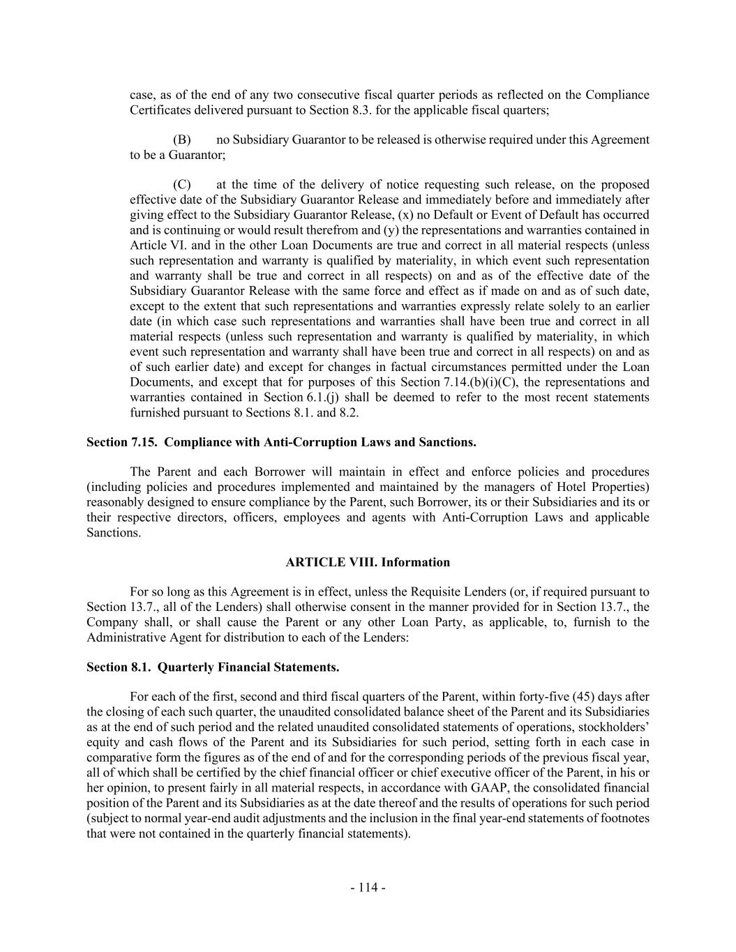 - 114 - case, as of the end of any two consecutive fiscal quarter periods as reflected on the Compliance Certificates delivered pursuant to Section 8.3. for the applicable fiscal quarters; (B) no Subsidiary Guarantor to be released is otherwise required under this Agreement to be a Guarantor; (C) at the time of the delivery of notice requesting such release, on the proposed effective date of the Subsidiary Guarantor Release and immediately before and immediately after giving effect to the Subsidiary Guarantor Release, (x) no Default or Event of Default has occurred and is continuing or would result therefrom and (y) the representations and warranties contained in Article VI. and in the other Loan Documents are true and correct in all material respects (unless such representation and warranty is qualified by materiality, in which event such representation and warranty shall be true and correct in all respects) on and as of the effective date of the Subsidiary Guarantor Release with the same force and effect as if made on and as of such date, except to the extent that such representations and warranties expressly relate solely to an earlier date (in which case such representations and warranties shall have been true and correct in all material respects (unless such representation and warranty is qualified by materiality, in which event such representation and warranty shall have been true and correct in all respects) on and as of such earlier date) and except for changes in factual circumstances permitted under the Loan Documents, and except that for purposes of this Section 7.14.(b)(i)(C), the representations and warranties contained in Section 6.1.(j) shall be deemed to refer to the most recent statements furnished pursuant to Sections 8.1. and 8.2. Section 7.15. Compliance with Anti-Corruption Laws and Sanctions. The Parent and each Borrower will maintain in effect and enforce policies and procedures (including policies and procedures implemented and maintained by the managers of Hotel Properties) reasonably designed to ensure compliance by the Parent, such Borrower, its or their Subsidiaries and its or their respective directors, officers, employees and agents with Anti-Corruption Laws and applicable Sanctions. ARTICLE VIII. Information For so long as this Agreement is in effect, unless the Requisite Lenders (or, if required pursuant to Section 13.7., all of the Lenders) shall otherwise consent in the manner provided for in Section 13.7., the Company shall, or shall cause the Parent or any other Loan Party, as applicable, to, furnish to the Administrative Agent for distribution to each of the Lenders: Section 8.1. Quarterly Financial Statements. For each of the first, second and third fiscal quarters of the Parent, within forty-five (45) days after the closing of each such quarter, the unaudited consolidated balance sheet of the Parent and its Subsidiaries as at the end of such period and the related unaudited consolidated statements of operations, stockholders’ equity and cash flows of the Parent and its Subsidiaries for such period, setting forth in each case in comparative form the figures as of the end of and for the corresponding periods of the previous fiscal year, all of which shall be certified by the chief financial officer or chief executive officer of the Parent, in his or her opinion, to present fairly in all material respects, in accordance with GAAP, the consolidated financial position of the Parent and its Subsidiaries as at the date thereof and the results of operations for such period (subject to normal year-end audit adjustments and the inclusion in the final year-end statements of footnotes that were not contained in the quarterly financial statements).