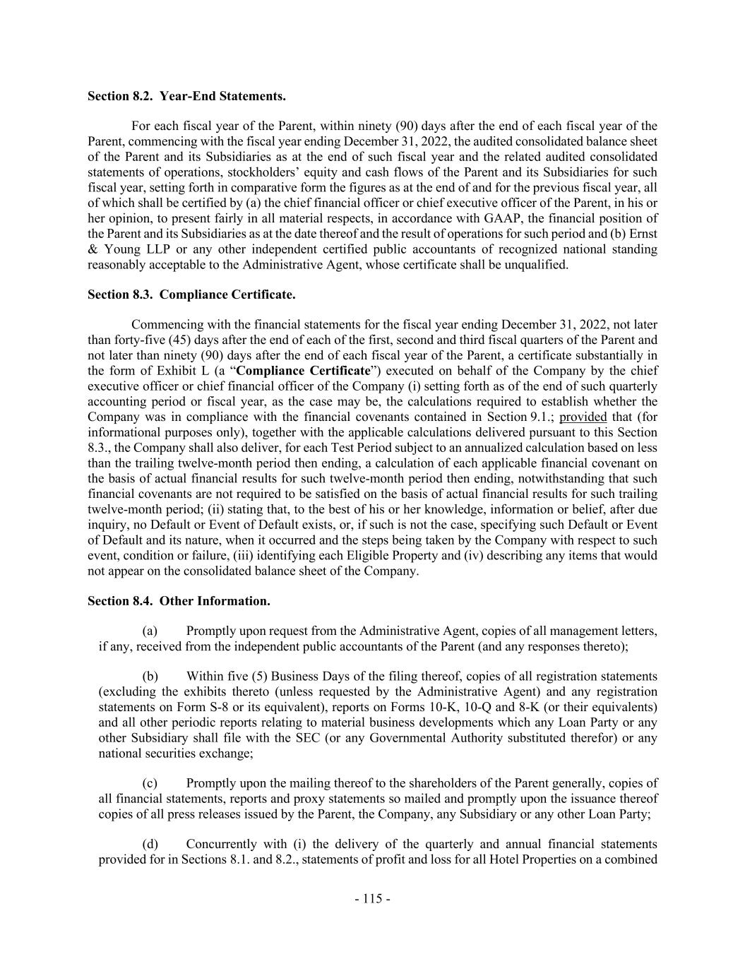 - 115 - Section 8.2. Year-End Statements. For each fiscal year of the Parent, within ninety (90) days after the end of each fiscal year of the Parent, commencing with the fiscal year ending December 31, 2022, the audited consolidated balance sheet of the Parent and its Subsidiaries as at the end of such fiscal year and the related audited consolidated statements of operations, stockholders’ equity and cash flows of the Parent and its Subsidiaries for such fiscal year, setting forth in comparative form the figures as at the end of and for the previous fiscal year, all of which shall be certified by (a) the chief financial officer or chief executive officer of the Parent, in his or her opinion, to present fairly in all material respects, in accordance with GAAP, the financial position of the Parent and its Subsidiaries as at the date thereof and the result of operations for such period and (b) Ernst & Young LLP or any other independent certified public accountants of recognized national standing reasonably acceptable to the Administrative Agent, whose certificate shall be unqualified. Section 8.3. Compliance Certificate. Commencing with the financial statements for the fiscal year ending December 31, 2022, not later than forty-five (45) days after the end of each of the first, second and third fiscal quarters of the Parent and not later than ninety (90) days after the end of each fiscal year of the Parent, a certificate substantially in the form of Exhibit L (a “Compliance Certificate”) executed on behalf of the Company by the chief executive officer or chief financial officer of the Company (i) setting forth as of the end of such quarterly accounting period or fiscal year, as the case may be, the calculations required to establish whether the Company was in compliance with the financial covenants contained in Section 9.1.; provided that (for informational purposes only), together with the applicable calculations delivered pursuant to this Section 8.3., the Company shall also deliver, for each Test Period subject to an annualized calculation based on less than the trailing twelve-month period then ending, a calculation of each applicable financial covenant on the basis of actual financial results for such twelve-month period then ending, notwithstanding that such financial covenants are not required to be satisfied on the basis of actual financial results for such trailing twelve-month period; (ii) stating that, to the best of his or her knowledge, information or belief, after due inquiry, no Default or Event of Default exists, or, if such is not the case, specifying such Default or Event of Default and its nature, when it occurred and the steps being taken by the Company with respect to such event, condition or failure, (iii) identifying each Eligible Property and (iv) describing any items that would not appear on the consolidated balance sheet of the Company. Section 8.4. Other Information. (a) Promptly upon request from the Administrative Agent, copies of all management letters, if any, received from the independent public accountants of the Parent (and any responses thereto); (b) Within five (5) Business Days of the filing thereof, copies of all registration statements (excluding the exhibits thereto (unless requested by the Administrative Agent) and any registration statements on Form S-8 or its equivalent), reports on Forms 10-K, 10-Q and 8-K (or their equivalents) and all other periodic reports relating to material business developments which any Loan Party or any other Subsidiary shall file with the SEC (or any Governmental Authority substituted therefor) or any national securities exchange; (c) Promptly upon the mailing thereof to the shareholders of the Parent generally, copies of all financial statements, reports and proxy statements so mailed and promptly upon the issuance thereof copies of all press releases issued by the Parent, the Company, any Subsidiary or any other Loan Party; (d) Concurrently with (i) the delivery of the quarterly and annual financial statements provided for in Sections 8.1. and 8.2., statements of profit and loss for all Hotel Properties on a combined