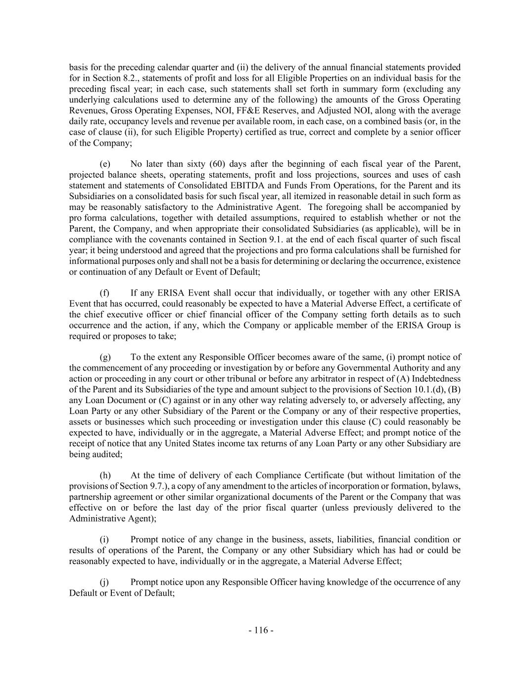 - 116 - basis for the preceding calendar quarter and (ii) the delivery of the annual financial statements provided for in Section 8.2., statements of profit and loss for all Eligible Properties on an individual basis for the preceding fiscal year; in each case, such statements shall set forth in summary form (excluding any underlying calculations used to determine any of the following) the amounts of the Gross Operating Revenues, Gross Operating Expenses, NOI, FF&E Reserves, and Adjusted NOI, along with the average daily rate, occupancy levels and revenue per available room, in each case, on a combined basis (or, in the case of clause (ii), for such Eligible Property) certified as true, correct and complete by a senior officer of the Company; (e) No later than sixty (60) days after the beginning of each fiscal year of the Parent, projected balance sheets, operating statements, profit and loss projections, sources and uses of cash statement and statements of Consolidated EBITDA and Funds From Operations, for the Parent and its Subsidiaries on a consolidated basis for such fiscal year, all itemized in reasonable detail in such form as may be reasonably satisfactory to the Administrative Agent. The foregoing shall be accompanied by pro forma calculations, together with detailed assumptions, required to establish whether or not the Parent, the Company, and when appropriate their consolidated Subsidiaries (as applicable), will be in compliance with the covenants contained in Section 9.1. at the end of each fiscal quarter of such fiscal year; it being understood and agreed that the projections and pro forma calculations shall be furnished for informational purposes only and shall not be a basis for determining or declaring the occurrence, existence or continuation of any Default or Event of Default; (f) If any ERISA Event shall occur that individually, or together with any other ERISA Event that has occurred, could reasonably be expected to have a Material Adverse Effect, a certificate of the chief executive officer or chief financial officer of the Company setting forth details as to such occurrence and the action, if any, which the Company or applicable member of the ERISA Group is required or proposes to take; (g) To the extent any Responsible Officer becomes aware of the same, (i) prompt notice of the commencement of any proceeding or investigation by or before any Governmental Authority and any action or proceeding in any court or other tribunal or before any arbitrator in respect of (A) Indebtedness of the Parent and its Subsidiaries of the type and amount subject to the provisions of Section 10.1.(d), (B) any Loan Document or (C) against or in any other way relating adversely to, or adversely affecting, any Loan Party or any other Subsidiary of the Parent or the Company or any of their respective properties, assets or businesses which such proceeding or investigation under this clause (C) could reasonably be expected to have, individually or in the aggregate, a Material Adverse Effect; and prompt notice of the receipt of notice that any United States income tax returns of any Loan Party or any other Subsidiary are being audited; (h) At the time of delivery of each Compliance Certificate (but without limitation of the provisions of Section 9.7.), a copy of any amendment to the articles of incorporation or formation, bylaws, partnership agreement or other similar organizational documents of the Parent or the Company that was effective on or before the last day of the prior fiscal quarter (unless previously delivered to the Administrative Agent); (i) Prompt notice of any change in the business, assets, liabilities, financial condition or results of operations of the Parent, the Company or any other Subsidiary which has had or could be reasonably expected to have, individually or in the aggregate, a Material Adverse Effect; (j) Prompt notice upon any Responsible Officer having knowledge of the occurrence of any Default or Event of Default;