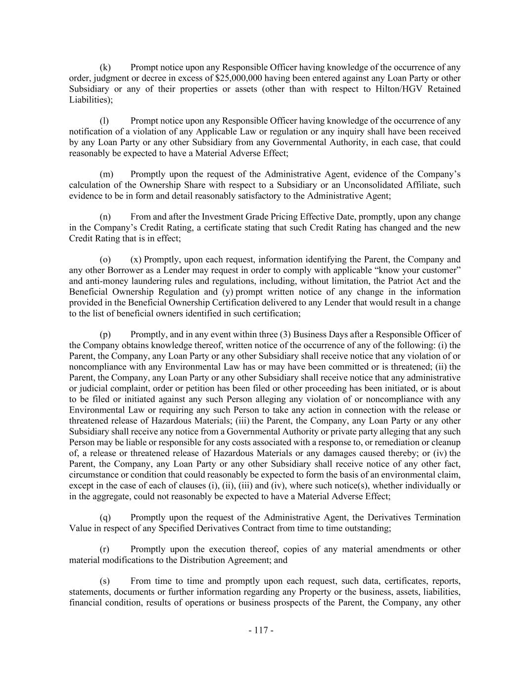 - 117 - (k) Prompt notice upon any Responsible Officer having knowledge of the occurrence of any order, judgment or decree in excess of $25,000,000 having been entered against any Loan Party or other Subsidiary or any of their properties or assets (other than with respect to Hilton/HGV Retained Liabilities); (l) Prompt notice upon any Responsible Officer having knowledge of the occurrence of any notification of a violation of any Applicable Law or regulation or any inquiry shall have been received by any Loan Party or any other Subsidiary from any Governmental Authority, in each case, that could reasonably be expected to have a Material Adverse Effect; (m) Promptly upon the request of the Administrative Agent, evidence of the Company’s calculation of the Ownership Share with respect to a Subsidiary or an Unconsolidated Affiliate, such evidence to be in form and detail reasonably satisfactory to the Administrative Agent; (n) From and after the Investment Grade Pricing Effective Date, promptly, upon any change in the Company’s Credit Rating, a certificate stating that such Credit Rating has changed and the new Credit Rating that is in effect; (o) (x) Promptly, upon each request, information identifying the Parent, the Company and any other Borrower as a Lender may request in order to comply with applicable “know your customer” and anti-money laundering rules and regulations, including, without limitation, the Patriot Act and the Beneficial Ownership Regulation and (y) prompt written notice of any change in the information provided in the Beneficial Ownership Certification delivered to any Lender that would result in a change to the list of beneficial owners identified in such certification; (p) Promptly, and in any event within three (3) Business Days after a Responsible Officer of the Company obtains knowledge thereof, written notice of the occurrence of any of the following: (i) the Parent, the Company, any Loan Party or any other Subsidiary shall receive notice that any violation of or noncompliance with any Environmental Law has or may have been committed or is threatened; (ii) the Parent, the Company, any Loan Party or any other Subsidiary shall receive notice that any administrative or judicial complaint, order or petition has been filed or other proceeding has been initiated, or is about to be filed or initiated against any such Person alleging any violation of or noncompliance with any Environmental Law or requiring any such Person to take any action in connection with the release or threatened release of Hazardous Materials; (iii) the Parent, the Company, any Loan Party or any other Subsidiary shall receive any notice from a Governmental Authority or private party alleging that any such Person may be liable or responsible for any costs associated with a response to, or remediation or cleanup of, a release or threatened release of Hazardous Materials or any damages caused thereby; or (iv) the Parent, the Company, any Loan Party or any other Subsidiary shall receive notice of any other fact, circumstance or condition that could reasonably be expected to form the basis of an environmental claim, except in the case of each of clauses (i), (ii), (iii) and (iv), where such notice(s), whether individually or in the aggregate, could not reasonably be expected to have a Material Adverse Effect; (q) Promptly upon the request of the Administrative Agent, the Derivatives Termination Value in respect of any Specified Derivatives Contract from time to time outstanding; (r) Promptly upon the execution thereof, copies of any material amendments or other material modifications to the Distribution Agreement; and (s) From time to time and promptly upon each request, such data, certificates, reports, statements, documents or further information regarding any Property or the business, assets, liabilities, financial condition, results of operations or business prospects of the Parent, the Company, any other