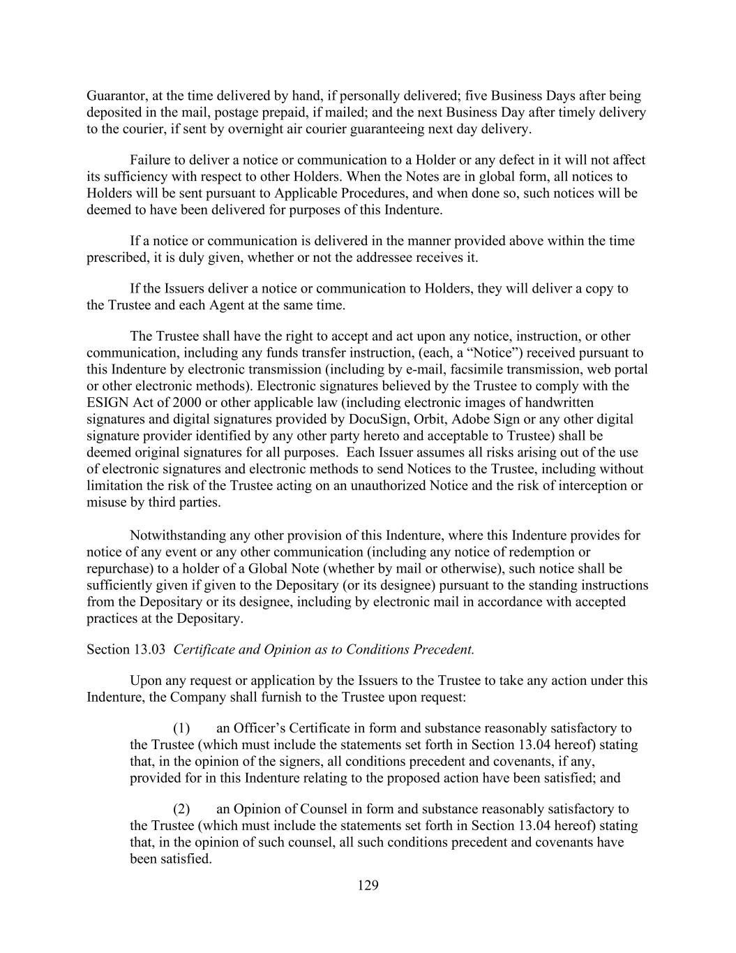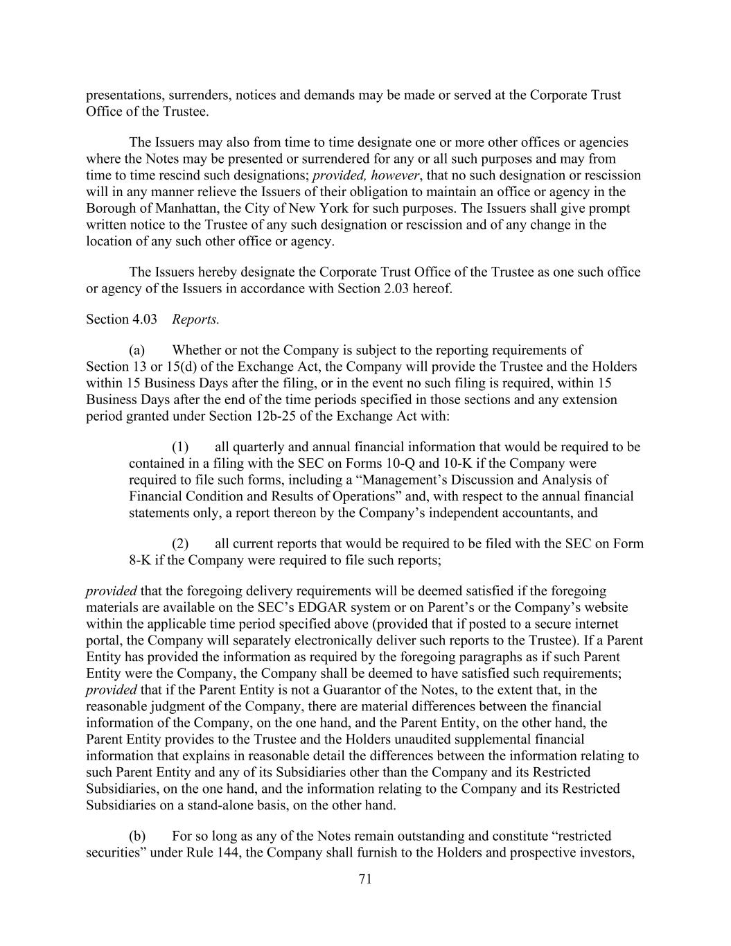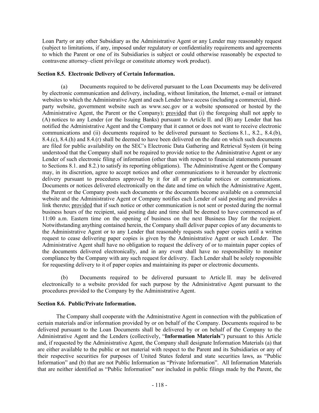 - 118 - Loan Party or any other Subsidiary as the Administrative Agent or any Lender may reasonably request (subject to limitations, if any, imposed under regulatory or confidentiality requirements and agreements to which the Parent or one of its Subsidiaries is subject or could otherwise reasonably be expected to contravene attorney–client privilege or constitute attorney work product). Section 8.5. Electronic Delivery of Certain Information. (a) Documents required to be delivered pursuant to the Loan Documents may be delivered by electronic communication and delivery, including, without limitation, the Internet, e-mail or intranet websites to which the Administrative Agent and each Lender have access (including a commercial, third- party website, government website such as www.sec.gov or a website sponsored or hosted by the Administrative Agent, the Parent or the Company); provided that (i) the foregoing shall not apply to (A) notices to any Lender (or the Issuing Banks) pursuant to Article II. and (B) any Lender that has notified the Administrative Agent and the Company that it cannot or does not want to receive electronic communications and (ii) documents required to be delivered pursuant to Sections 8.1., 8.2., 8.4.(b), 8.4.(c), 8.4.(h) and 8.4.(r) shall be deemed to have been delivered on the date on which such documents are filed for public availability on the SEC’s Electronic Data Gathering and Retrieval System (it being understood that the Company shall not be required to provide notice to the Administrative Agent or any Lender of such electronic filing of information (other than with respect to financial statements pursuant to Sections 8.1. and 8.2.) to satisfy its reporting obligations). The Administrative Agent or the Company may, in its discretion, agree to accept notices and other communications to it hereunder by electronic delivery pursuant to procedures approved by it for all or particular notices or communications. Documents or notices delivered electronically on the date and time on which the Administrative Agent, the Parent or the Company posts such documents or the documents become available on a commercial website and the Administrative Agent or Company notifies each Lender of said posting and provides a link thereto; provided that if such notice or other communication is not sent or posted during the normal business hours of the recipient, said posting date and time shall be deemed to have commenced as of 11:00 a.m. Eastern time on the opening of business on the next Business Day for the recipient. Notwithstanding anything contained herein, the Company shall deliver paper copies of any documents to the Administrative Agent or to any Lender that reasonably requests such paper copies until a written request to cease delivering paper copies is given by the Administrative Agent or such Lender. The Administrative Agent shall have no obligation to request the delivery of or to maintain paper copies of the documents delivered electronically, and in any event shall have no responsibility to monitor compliance by the Company with any such request for delivery. Each Lender shall be solely responsible for requesting delivery to it of paper copies and maintaining its paper or electronic documents. (b) Documents required to be delivered pursuant to Article II. may be delivered electronically to a website provided for such purpose by the Administrative Agent pursuant to the procedures provided to the Company by the Administrative Agent. Section 8.6. Public/Private Information. The Company shall cooperate with the Administrative Agent in connection with the publication of certain materials and/or information provided by or on behalf of the Company. Documents required to be delivered pursuant to the Loan Documents shall be delivered by or on behalf of the Company to the Administrative Agent and the Lenders (collectively, “Information Materials”) pursuant to this Article and, if requested by the Administrative Agent, the Company shall designate Information Materials (a) that are either available to the public or not material with respect to the Parent and its Subsidiaries or any of their respective securities for purposes of United States federal and state securities laws, as “Public Information” and (b) that are not Public Information as “Private Information”. All Information Materials that are neither identified as “Public Information” nor included in public filings made by the Parent, the
