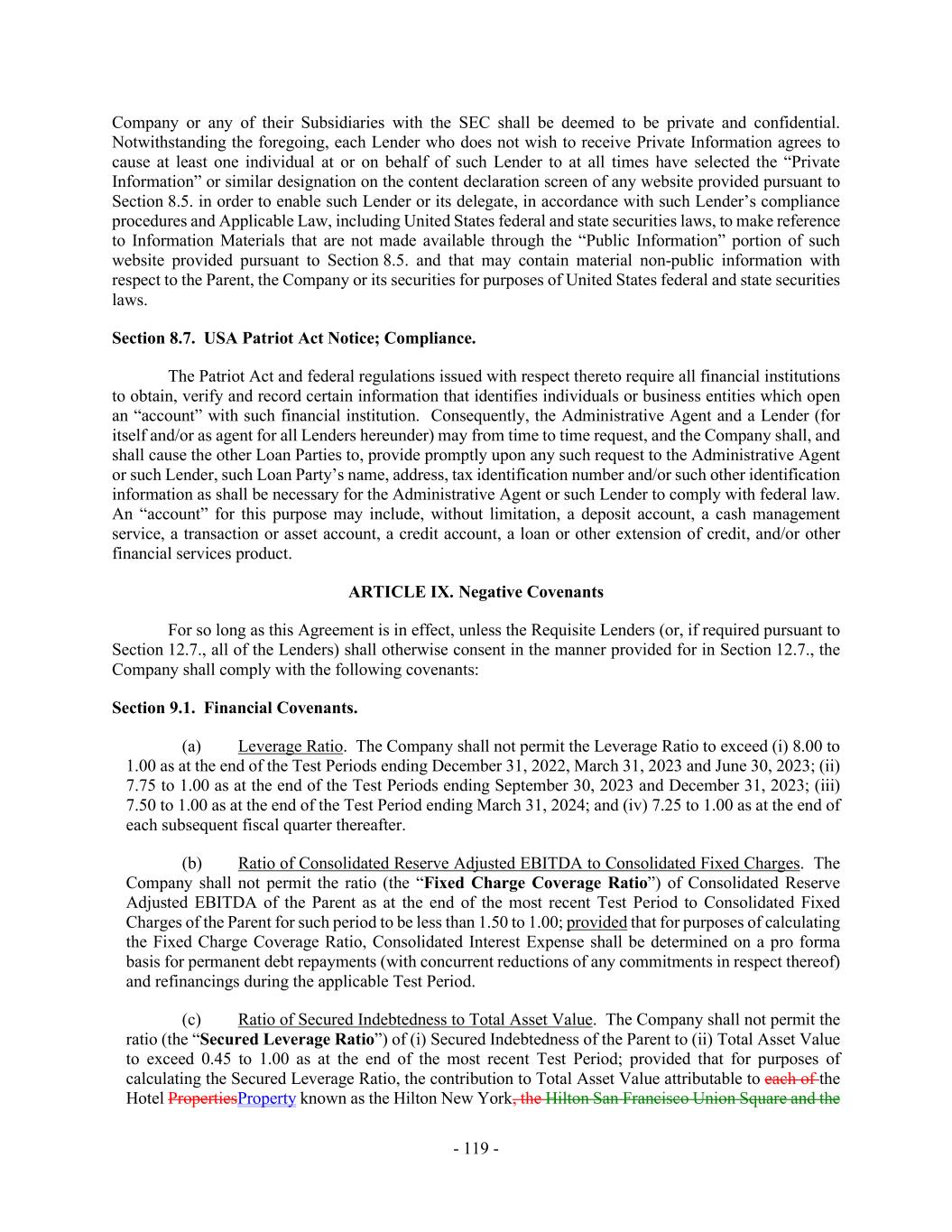 - 119 - Company or any of their Subsidiaries with the SEC shall be deemed to be private and confidential. Notwithstanding the foregoing, each Lender who does not wish to receive Private Information agrees to cause at least one individual at or on behalf of such Lender to at all times have selected the “Private Information” or similar designation on the content declaration screen of any website provided pursuant to Section 8.5. in order to enable such Lender or its delegate, in accordance with such Lender’s compliance procedures and Applicable Law, including United States federal and state securities laws, to make reference to Information Materials that are not made available through the “Public Information” portion of such website provided pursuant to Section 8.5. and that may contain material non-public information with respect to the Parent, the Company or its securities for purposes of United States federal and state securities laws. Section 8.7. USA Patriot Act Notice; Compliance. The Patriot Act and federal regulations issued with respect thereto require all financial institutions to obtain, verify and record certain information that identifies individuals or business entities which open an “account” with such financial institution. Consequently, the Administrative Agent and a Lender (for itself and/or as agent for all Lenders hereunder) may from time to time request, and the Company shall, and shall cause the other Loan Parties to, provide promptly upon any such request to the Administrative Agent or such Lender, such Loan Party’s name, address, tax identification number and/or such other identification information as shall be necessary for the Administrative Agent or such Lender to comply with federal law. An “account” for this purpose may include, without limitation, a deposit account, a cash management service, a transaction or asset account, a credit account, a loan or other extension of credit, and/or other financial services product. ARTICLE IX. Negative Covenants For so long as this Agreement is in effect, unless the Requisite Lenders (or, if required pursuant to Section 12.7., all of the Lenders) shall otherwise consent in the manner provided for in Section 12.7., the Company shall comply with the following covenants: Section 9.1. Financial Covenants. (a) Leverage Ratio. The Company shall not permit the Leverage Ratio to exceed (i) 8.00 to 1.00 as at the end of the Test Periods ending December 31, 2022, March 31, 2023 and June 30, 2023; (ii) 7.75 to 1.00 as at the end of the Test Periods ending September 30, 2023 and December 31, 2023; (iii) 7.50 to 1.00 as at the end of the Test Period ending March 31, 2024; and (iv) 7.25 to 1.00 as at the end of each subsequent fiscal quarter thereafter. (b) Ratio of Consolidated Reserve Adjusted EBITDA to Consolidated Fixed Charges. The Company shall not permit the ratio (the “Fixed Charge Coverage Ratio”) of Consolidated Reserve Adjusted EBITDA of the Parent as at the end of the most recent Test Period to Consolidated Fixed Charges of the Parent for such period to be less than 1.50 to 1.00; provided that for purposes of calculating the Fixed Charge Coverage Ratio, Consolidated Interest Expense shall be determined on a pro forma basis for permanent debt repayments (with concurrent reductions of any commitments in respect thereof) and refinancings during the applicable Test Period. (c) Ratio of Secured Indebtedness to Total Asset Value. The Company shall not permit the ratio (the “Secured Leverage Ratio”) of (i) Secured Indebtedness of the Parent to (ii) Total Asset Value to exceed 0.45 to 1.00 as at the end of the most recent Test Period; provided that for purposes of calculating the Secured Leverage Ratio, the contribution to Total Asset Value attributable to each of the Hotel PropertiesProperty known as the Hilton New York, the Hilton San Francisco Union Square and the