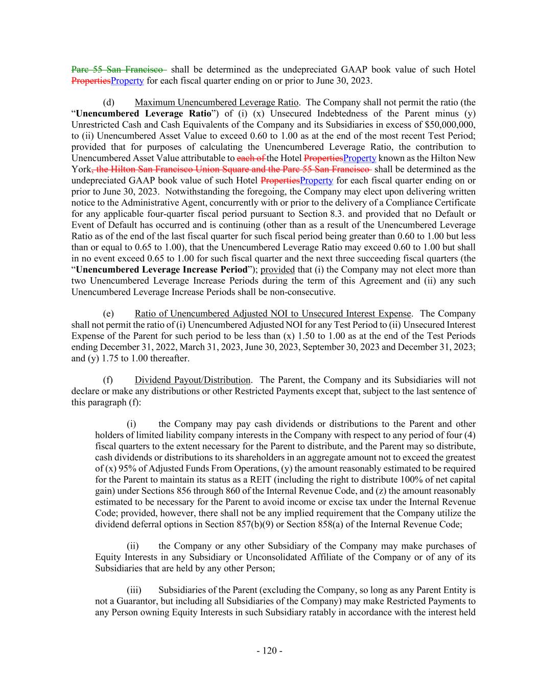 - 120 - Parc 55 San Francisco shall be determined as the undepreciated GAAP book value of such Hotel PropertiesProperty for each fiscal quarter ending on or prior to June 30, 2023. (d) Maximum Unencumbered Leverage Ratio. The Company shall not permit the ratio (the “Unencumbered Leverage Ratio”) of (i) (x) Unsecured Indebtedness of the Parent minus (y) Unrestricted Cash and Cash Equivalents of the Company and its Subsidiaries in excess of $50,000,000, to (ii) Unencumbered Asset Value to exceed 0.60 to 1.00 as at the end of the most recent Test Period; provided that for purposes of calculating the Unencumbered Leverage Ratio, the contribution to Unencumbered Asset Value attributable to each of the Hotel PropertiesProperty known as the Hilton New York, the Hilton San Francisco Union Square and the Parc 55 San Francisco shall be determined as the undepreciated GAAP book value of such Hotel PropertiesProperty for each fiscal quarter ending on or prior to June 30, 2023. Notwithstanding the foregoing, the Company may elect upon delivering written notice to the Administrative Agent, concurrently with or prior to the delivery of a Compliance Certificate for any applicable four-quarter fiscal period pursuant to Section 8.3. and provided that no Default or Event of Default has occurred and is continuing (other than as a result of the Unencumbered Leverage Ratio as of the end of the last fiscal quarter for such fiscal period being greater than 0.60 to 1.00 but less than or equal to 0.65 to 1.00), that the Unencumbered Leverage Ratio may exceed 0.60 to 1.00 but shall in no event exceed 0.65 to 1.00 for such fiscal quarter and the next three succeeding fiscal quarters (the “Unencumbered Leverage Increase Period”); provided that (i) the Company may not elect more than two Unencumbered Leverage Increase Periods during the term of this Agreement and (ii) any such Unencumbered Leverage Increase Periods shall be non-consecutive. (e) Ratio of Unencumbered Adjusted NOI to Unsecured Interest Expense. The Company shall not permit the ratio of (i) Unencumbered Adjusted NOI for any Test Period to (ii) Unsecured Interest Expense of the Parent for such period to be less than (x) 1.50 to 1.00 as at the end of the Test Periods ending December 31, 2022, March 31, 2023, June 30, 2023, September 30, 2023 and December 31, 2023; and (y) 1.75 to 1.00 thereafter. (f) Dividend Payout/Distribution. The Parent, the Company and its Subsidiaries will not declare or make any distributions or other Restricted Payments except that, subject to the last sentence of this paragraph (f): (i) the Company may pay cash dividends or distributions to the Parent and other holders of limited liability company interests in the Company with respect to any period of four (4) fiscal quarters to the extent necessary for the Parent to distribute, and the Parent may so distribute, cash dividends or distributions to its shareholders in an aggregate amount not to exceed the greatest of (x) 95% of Adjusted Funds From Operations, (y) the amount reasonably estimated to be required for the Parent to maintain its status as a REIT (including the right to distribute 100% of net capital gain) under Sections 856 through 860 of the Internal Revenue Code, and (z) the amount reasonably estimated to be necessary for the Parent to avoid income or excise tax under the Internal Revenue Code; provided, however, there shall not be any implied requirement that the Company utilize the dividend deferral options in Section 857(b)(9) or Section 858(a) of the Internal Revenue Code; (ii) the Company or any other Subsidiary of the Company may make purchases of Equity Interests in any Subsidiary or Unconsolidated Affiliate of the Company or of any of its Subsidiaries that are held by any other Person; (iii) Subsidiaries of the Parent (excluding the Company, so long as any Parent Entity is not a Guarantor, but including all Subsidiaries of the Company) may make Restricted Payments to any Person owning Equity Interests in such Subsidiary ratably in accordance with the interest held