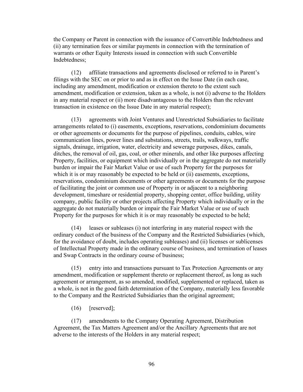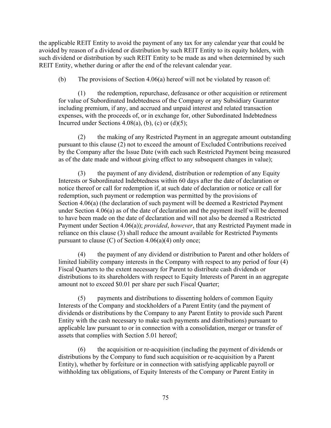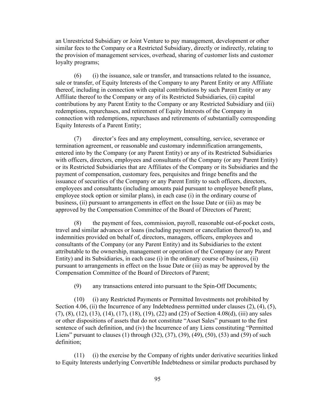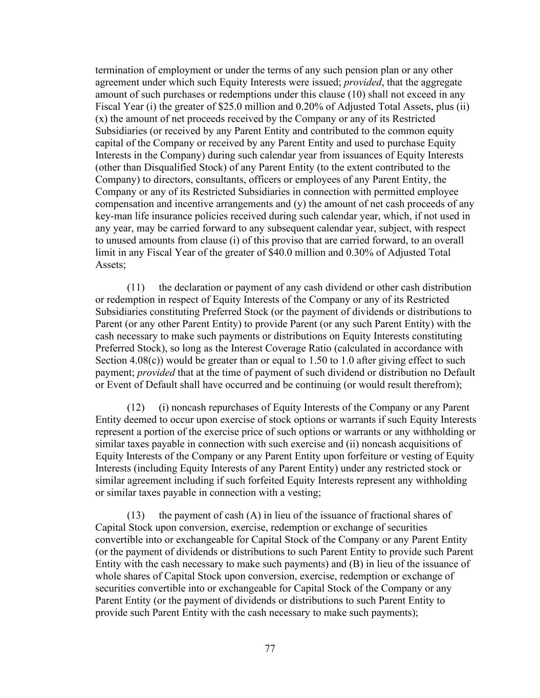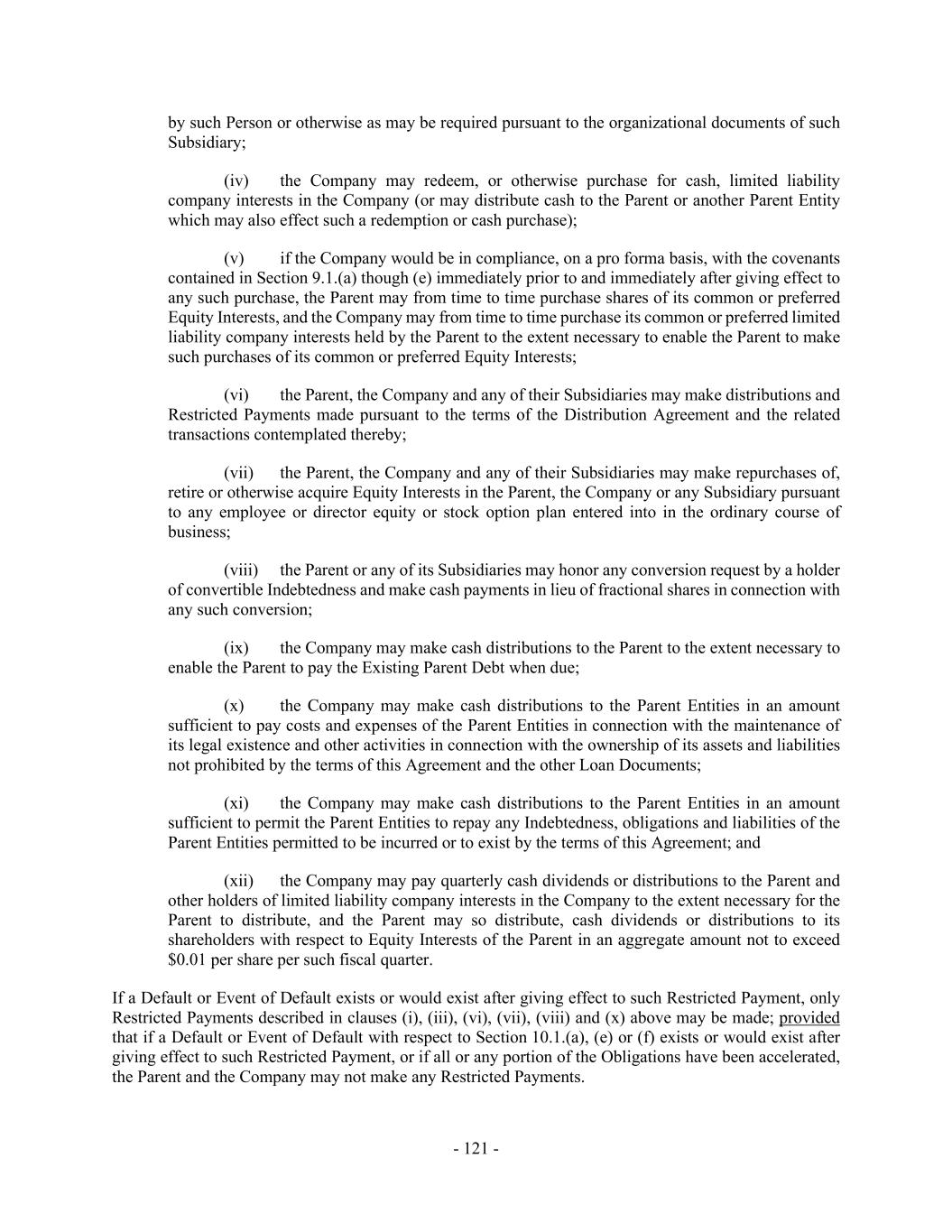- 121 - by such Person or otherwise as may be required pursuant to the organizational documents of such Subsidiary; (iv) the Company may redeem, or otherwise purchase for cash, limited liability company interests in the Company (or may distribute cash to the Parent or another Parent Entity which may also effect such a redemption or cash purchase); (v) if the Company would be in compliance, on a pro forma basis, with the covenants contained in Section 9.1.(a) though (e) immediately prior to and immediately after giving effect to any such purchase, the Parent may from time to time purchase shares of its common or preferred Equity Interests, and the Company may from time to time purchase its common or preferred limited liability company interests held by the Parent to the extent necessary to enable the Parent to make such purchases of its common or preferred Equity Interests; (vi) the Parent, the Company and any of their Subsidiaries may make distributions and Restricted Payments made pursuant to the terms of the Distribution Agreement and the related transactions contemplated thereby; (vii) the Parent, the Company and any of their Subsidiaries may make repurchases of, retire or otherwise acquire Equity Interests in the Parent, the Company or any Subsidiary pursuant to any employee or director equity or stock option plan entered into in the ordinary course of business; (viii) the Parent or any of its Subsidiaries may honor any conversion request by a holder of convertible Indebtedness and make cash payments in lieu of fractional shares in connection with any such conversion; (ix) the Company may make cash distributions to the Parent to the extent necessary to enable the Parent to pay the Existing Parent Debt when due; (x) the Company may make cash distributions to the Parent Entities in an amount sufficient to pay costs and expenses of the Parent Entities in connection with the maintenance of its legal existence and other activities in connection with the ownership of its assets and liabilities not prohibited by the terms of this Agreement and the other Loan Documents; (xi) the Company may make cash distributions to the Parent Entities in an amount sufficient to permit the Parent Entities to repay any Indebtedness, obligations and liabilities of the Parent Entities permitted to be incurred or to exist by the terms of this Agreement; and (xii) the Company may pay quarterly cash dividends or distributions to the Parent and other holders of limited liability company interests in the Company to the extent necessary for the Parent to distribute, and the Parent may so distribute, cash dividends or distributions to its shareholders with respect to Equity Interests of the Parent in an aggregate amount not to exceed $0.01 per share per such fiscal quarter. If a Default or Event of Default exists or would exist after giving effect to such Restricted Payment, only Restricted Payments described in clauses (i), (iii), (vi), (vii), (viii) and (x) above may be made; provided that if a Default or Event of Default with respect to Section 10.1.(a), (e) or (f) exists or would exist after giving effect to such Restricted Payment, or if all or any portion of the Obligations have been accelerated, the Parent and the Company may not make any Restricted Payments.