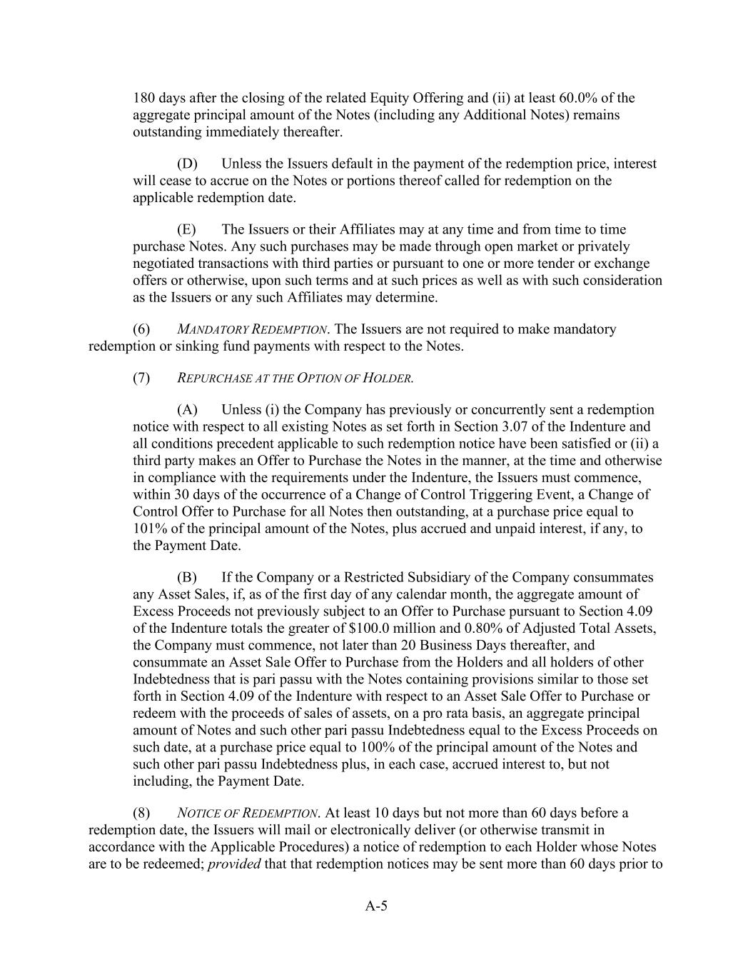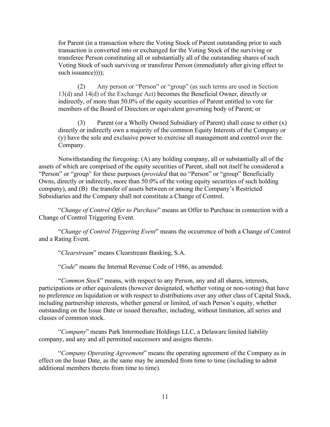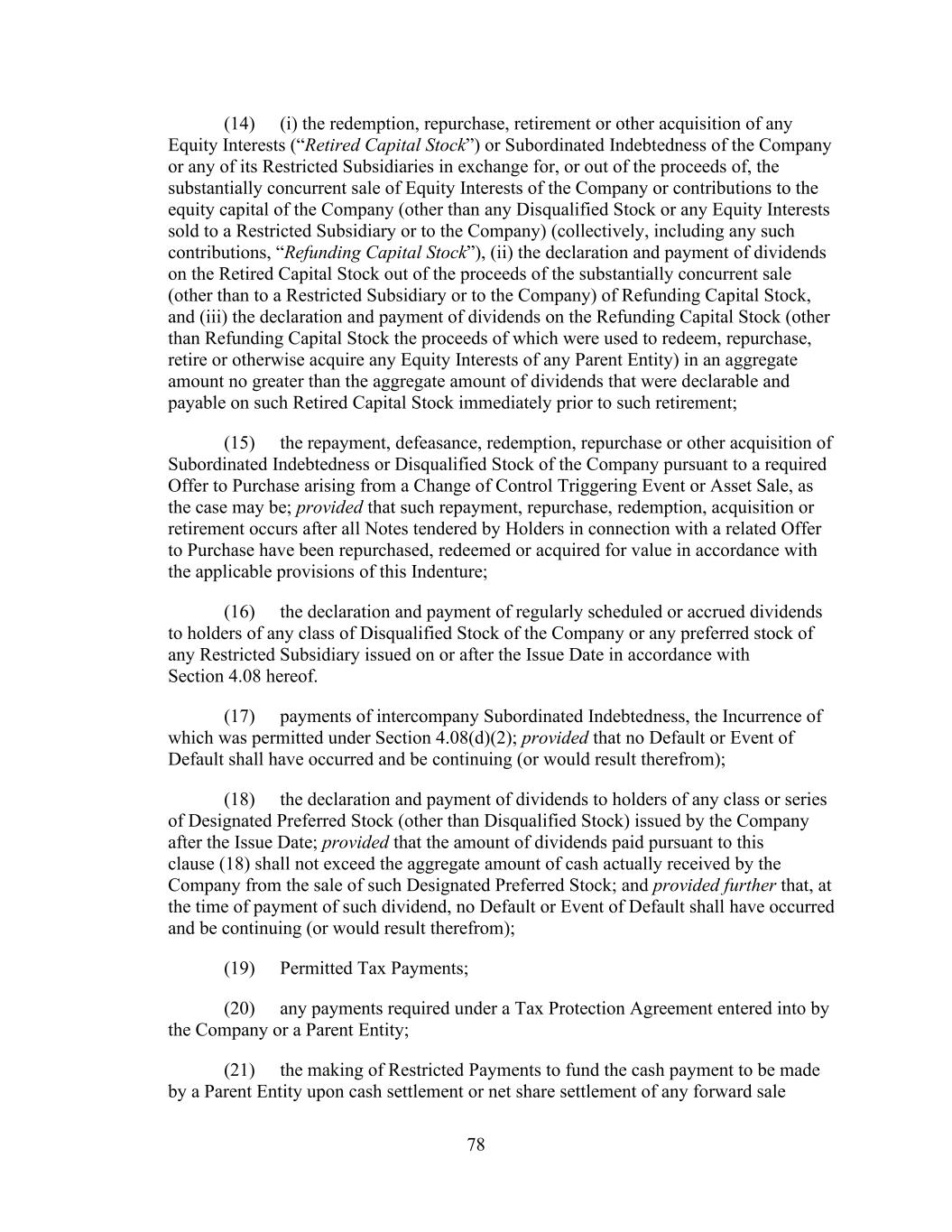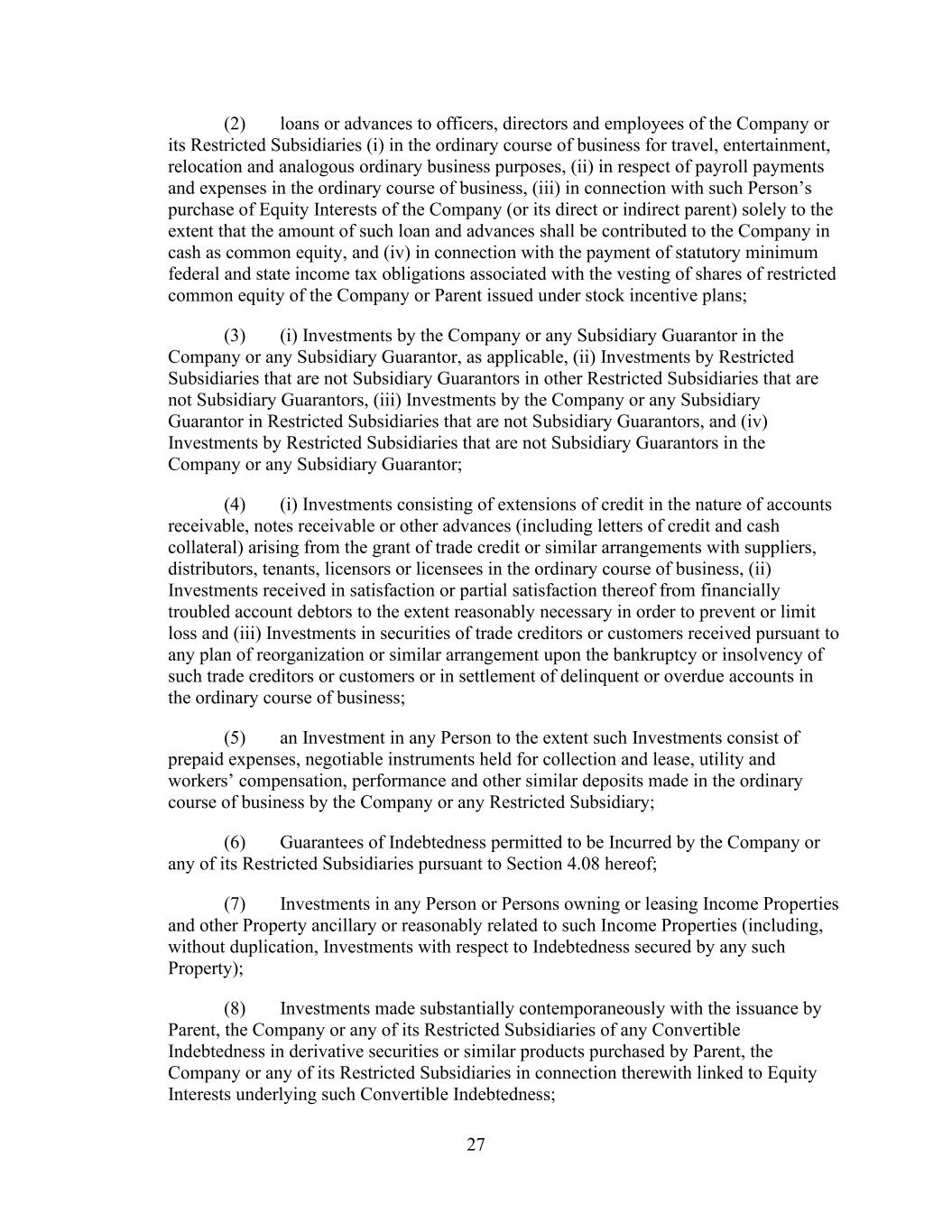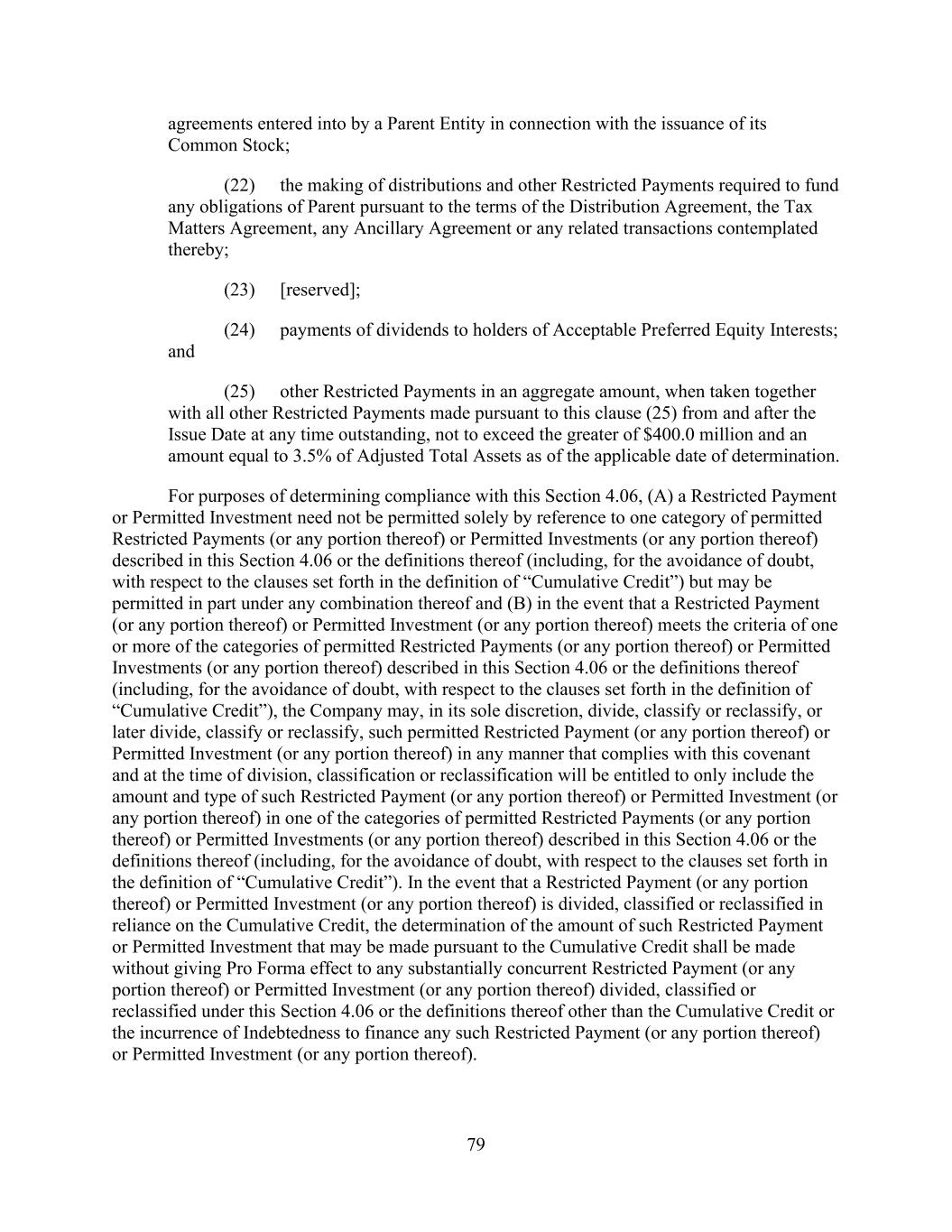 - 121 - by such Person or otherwise as may be required pursuant to the organizational documents of such Subsidiary; (iv) the Company may redeem, or otherwise purchase for cash, limited liability company interests in the Company (or may distribute cash to the Parent or another Parent Entity which may also effect such a redemption or cash purchase); (v) if the Company would be in compliance, on a pro forma basis, with the covenants contained in Section 9.1.(a) though (e) immediately prior to and immediately after giving effect to any such purchase, the Parent may from time to time purchase shares of its common or preferred Equity Interests, and the Company may from time to time purchase its common or preferred limited liability company interests held by the Parent to the extent necessary to enable the Parent to make such purchases of its common or preferred Equity Interests; (vi) the Parent, the Company and any of their Subsidiaries may make distributions and Restricted Payments made pursuant to the terms of the Distribution Agreement and the related transactions contemplated thereby; (vii) the Parent, the Company and any of their Subsidiaries may make repurchases of, retire or otherwise acquire Equity Interests in the Parent, the Company or any Subsidiary pursuant to any employee or director equity or stock option plan entered into in the ordinary course of business; (viii) the Parent or any of its Subsidiaries may honor any conversion request by a holder of convertible Indebtedness and make cash payments in lieu of fractional shares in connection with any such conversion; (ix) the Company may make cash distributions to the Parent to the extent necessary to enable the Parent to pay the Existing Parent Debt when due; (x) the Company may make cash distributions to the Parent Entities in an amount sufficient to pay costs and expenses of the Parent Entities in connection with the maintenance of its legal existence and other activities in connection with the ownership of its assets and liabilities not prohibited by the terms of this Agreement and the other Loan Documents; (xi) the Company may make cash distributions to the Parent Entities in an amount sufficient to permit the Parent Entities to repay any Indebtedness, obligations and liabilities of the Parent Entities permitted to be incurred or to exist by the terms of this Agreement; and (xii) the Company may pay quarterly cash dividends or distributions to the Parent and other holders of limited liability company interests in the Company to the extent necessary for the Parent to distribute, and the Parent may so distribute, cash dividends or distributions to its shareholders with respect to Equity Interests of the Parent in an aggregate amount not to exceed $0.01 per share per such fiscal quarter. If a Default or Event of Default exists or would exist after giving effect to such Restricted Payment, only Restricted Payments described in clauses (i), (iii), (vi), (vii), (viii) and (x) above may be made; provided that if a Default or Event of Default with respect to Section 10.1.(a), (e) or (f) exists or would exist after giving effect to such Restricted Payment, or if all or any portion of the Obligations have been accelerated, the Parent and the Company may not make any Restricted Payments.