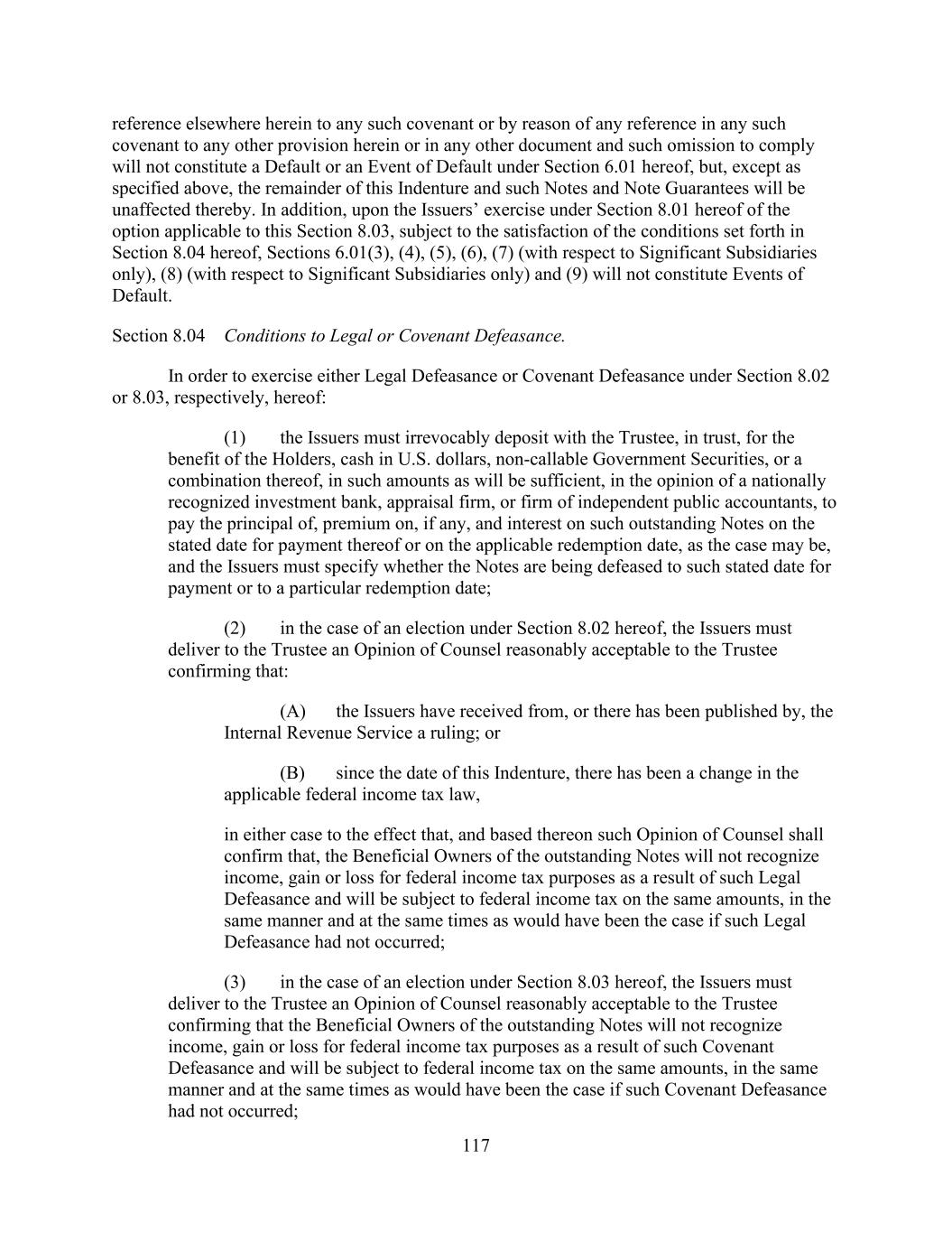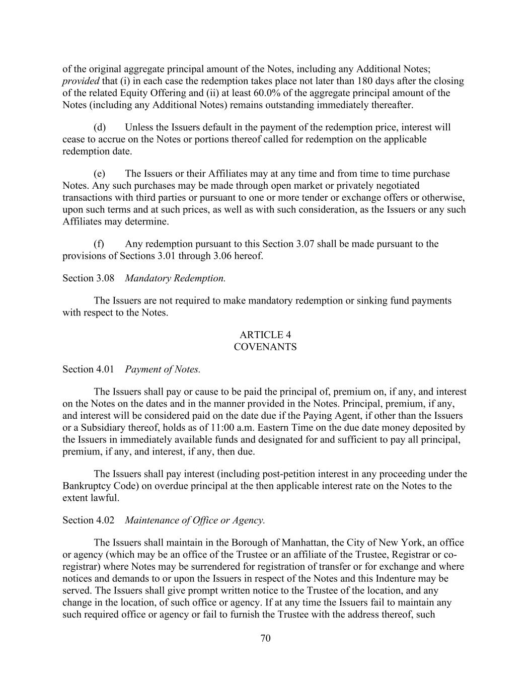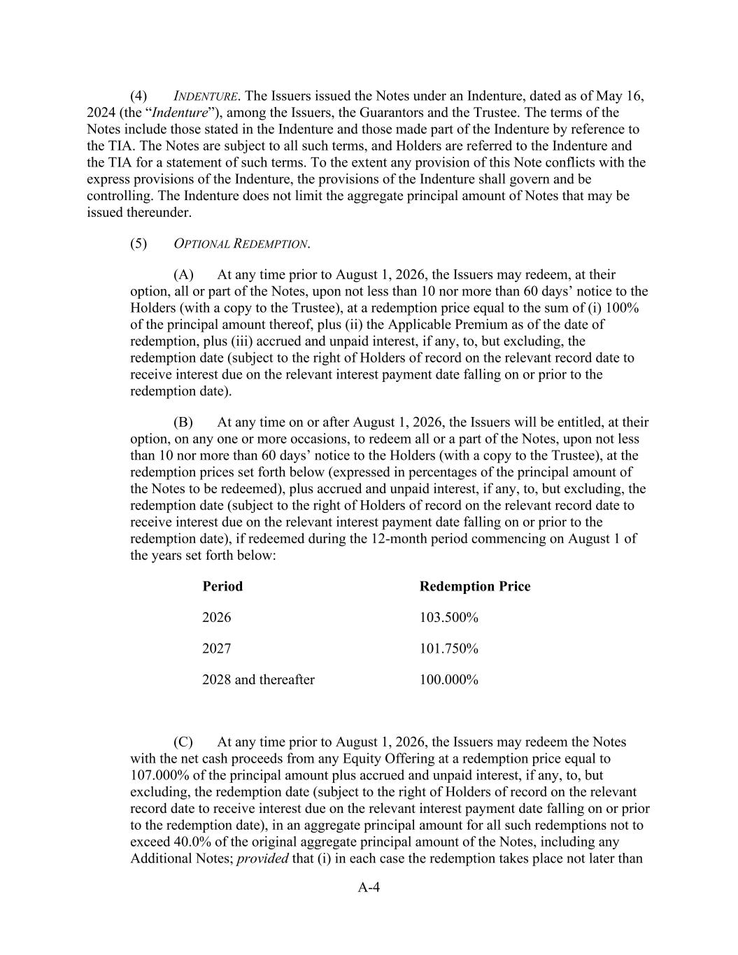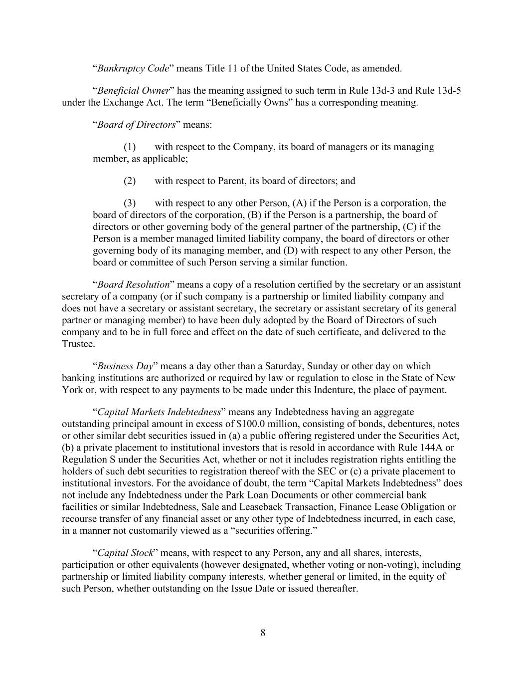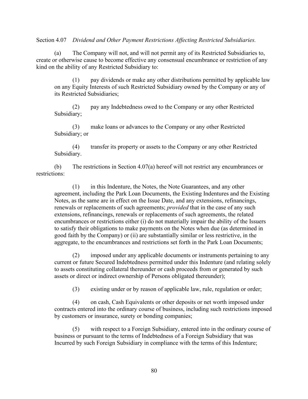 - 121 - by such Person or otherwise as may be required pursuant to the organizational documents of such Subsidiary; (iv) the Company may redeem, or otherwise purchase for cash, limited liability company interests in the Company (or may distribute cash to the Parent or another Parent Entity which may also effect such a redemption or cash purchase); (v) if the Company would be in compliance, on a pro forma basis, with the covenants contained in Section 9.1.(a) though (e) immediately prior to and immediately after giving effect to any such purchase, the Parent may from time to time purchase shares of its common or preferred Equity Interests, and the Company may from time to time purchase its common or preferred limited liability company interests held by the Parent to the extent necessary to enable the Parent to make such purchases of its common or preferred Equity Interests; (vi) the Parent, the Company and any of their Subsidiaries may make distributions and Restricted Payments made pursuant to the terms of the Distribution Agreement and the related transactions contemplated thereby; (vii) the Parent, the Company and any of their Subsidiaries may make repurchases of, retire or otherwise acquire Equity Interests in the Parent, the Company or any Subsidiary pursuant to any employee or director equity or stock option plan entered into in the ordinary course of business; (viii) the Parent or any of its Subsidiaries may honor any conversion request by a holder of convertible Indebtedness and make cash payments in lieu of fractional shares in connection with any such conversion; (ix) the Company may make cash distributions to the Parent to the extent necessary to enable the Parent to pay the Existing Parent Debt when due; (x) the Company may make cash distributions to the Parent Entities in an amount sufficient to pay costs and expenses of the Parent Entities in connection with the maintenance of its legal existence and other activities in connection with the ownership of its assets and liabilities not prohibited by the terms of this Agreement and the other Loan Documents; (xi) the Company may make cash distributions to the Parent Entities in an amount sufficient to permit the Parent Entities to repay any Indebtedness, obligations and liabilities of the Parent Entities permitted to be incurred or to exist by the terms of this Agreement; and (xii) the Company may pay quarterly cash dividends or distributions to the Parent and other holders of limited liability company interests in the Company to the extent necessary for the Parent to distribute, and the Parent may so distribute, cash dividends or distributions to its shareholders with respect to Equity Interests of the Parent in an aggregate amount not to exceed $0.01 per share per such fiscal quarter. If a Default or Event of Default exists or would exist after giving effect to such Restricted Payment, only Restricted Payments described in clauses (i), (iii), (vi), (vii), (viii) and (x) above may be made; provided that if a Default or Event of Default with respect to Section 10.1.(a), (e) or (f) exists or would exist after giving effect to such Restricted Payment, or if all or any portion of the Obligations have been accelerated, the Parent and the Company may not make any Restricted Payments.