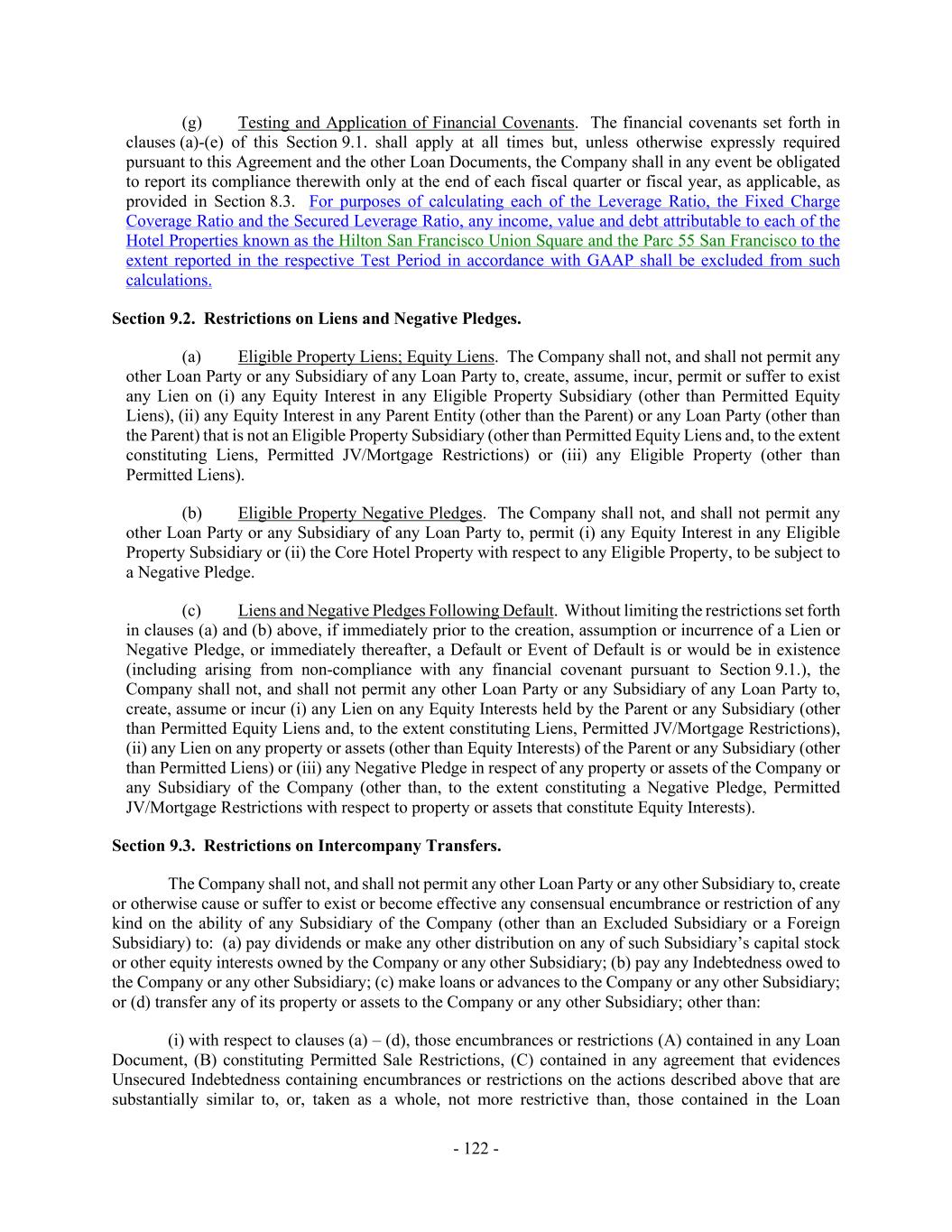 - 122 - (g) Testing and Application of Financial Covenants. The financial covenants set forth in clauses (a)-(e) of this Section 9.1. shall apply at all times but, unless otherwise expressly required pursuant to this Agreement and the other Loan Documents, the Company shall in any event be obligated to report its compliance therewith only at the end of each fiscal quarter or fiscal year, as applicable, as provided in Section 8.3. For purposes of calculating each of the Leverage Ratio, the Fixed Charge Coverage Ratio and the Secured Leverage Ratio, any income, value and debt attributable to each of the Hotel Properties known as the Hilton San Francisco Union Square and the Parc 55 San Francisco to the extent reported in the respective Test Period in accordance with GAAP shall be excluded from such calculations. Section 9.2. Restrictions on Liens and Negative Pledges. (a) Eligible Property Liens; Equity Liens. The Company shall not, and shall not permit any other Loan Party or any Subsidiary of any Loan Party to, create, assume, incur, permit or suffer to exist any Lien on (i) any Equity Interest in any Eligible Property Subsidiary (other than Permitted Equity Liens), (ii) any Equity Interest in any Parent Entity (other than the Parent) or any Loan Party (other than the Parent) that is not an Eligible Property Subsidiary (other than Permitted Equity Liens and, to the extent constituting Liens, Permitted JV/Mortgage Restrictions) or (iii) any Eligible Property (other than Permitted Liens). (b) Eligible Property Negative Pledges. The Company shall not, and shall not permit any other Loan Party or any Subsidiary of any Loan Party to, permit (i) any Equity Interest in any Eligible Property Subsidiary or (ii) the Core Hotel Property with respect to any Eligible Property, to be subject to a Negative Pledge. (c) Liens and Negative Pledges Following Default. Without limiting the restrictions set forth in clauses (a) and (b) above, if immediately prior to the creation, assumption or incurrence of a Lien or Negative Pledge, or immediately thereafter, a Default or Event of Default is or would be in existence (including arising from non-compliance with any financial covenant pursuant to Section 9.1.), the Company shall not, and shall not permit any other Loan Party or any Subsidiary of any Loan Party to, create, assume or incur (i) any Lien on any Equity Interests held by the Parent or any Subsidiary (other than Permitted Equity Liens and, to the extent constituting Liens, Permitted JV/Mortgage Restrictions), (ii) any Lien on any property or assets (other than Equity Interests) of the Parent or any Subsidiary (other than Permitted Liens) or (iii) any Negative Pledge in respect of any property or assets of the Company or any Subsidiary of the Company (other than, to the extent constituting a Negative Pledge, Permitted JV/Mortgage Restrictions with respect to property or assets that constitute Equity Interests). Section 9.3. Restrictions on Intercompany Transfers. The Company shall not, and shall not permit any other Loan Party or any other Subsidiary to, create or otherwise cause or suffer to exist or become effective any consensual encumbrance or restriction of any kind on the ability of any Subsidiary of the Company (other than an Excluded Subsidiary or a Foreign Subsidiary) to: (a) pay dividends or make any other distribution on any of such Subsidiary’s capital stock or other equity interests owned by the Company or any other Subsidiary; (b) pay any Indebtedness owed to the Company or any other Subsidiary; (c) make loans or advances to the Company or any other Subsidiary; or (d) transfer any of its property or assets to the Company or any other Subsidiary; other than: (i) with respect to clauses (a) – (d), those encumbrances or restrictions (A) contained in any Loan Document, (B) constituting Permitted Sale Restrictions, (C) contained in any agreement that evidences Unsecured Indebtedness containing encumbrances or restrictions on the actions described above that are substantially similar to, or, taken as a whole, not more restrictive than, those contained in the Loan