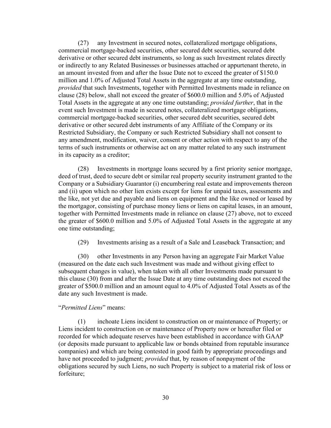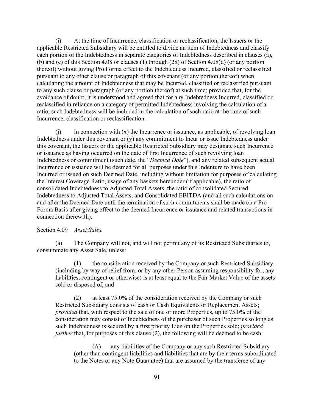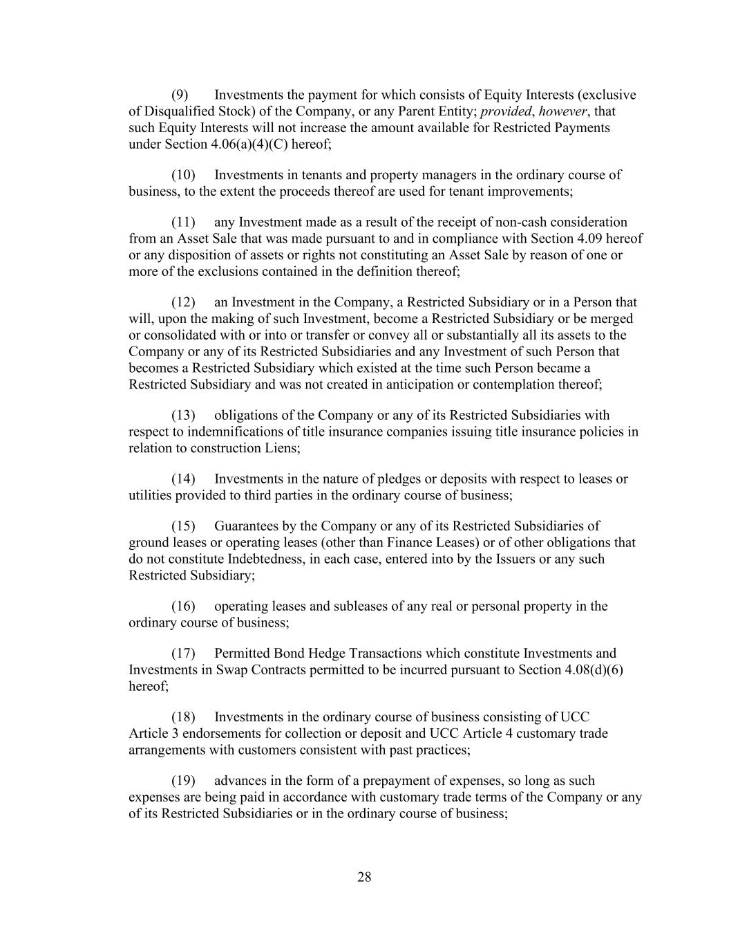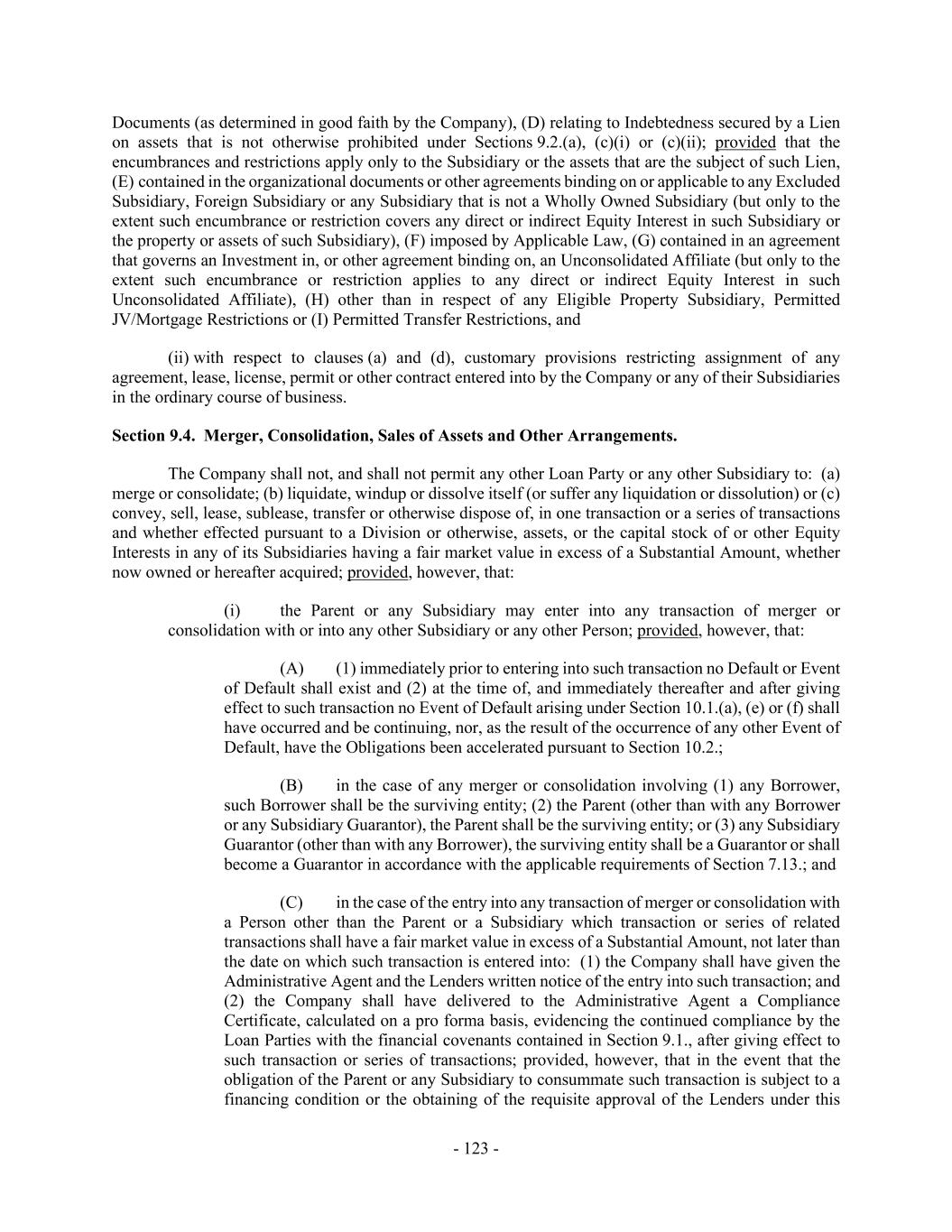 - 123 - Documents (as determined in good faith by the Company), (D) relating to Indebtedness secured by a Lien on assets that is not otherwise prohibited under Sections 9.2.(a), (c)(i) or (c)(ii); provided that the encumbrances and restrictions apply only to the Subsidiary or the assets that are the subject of such Lien, (E) contained in the organizational documents or other agreements binding on or applicable to any Excluded Subsidiary, Foreign Subsidiary or any Subsidiary that is not a Wholly Owned Subsidiary (but only to the extent such encumbrance or restriction covers any direct or indirect Equity Interest in such Subsidiary or the property or assets of such Subsidiary), (F) imposed by Applicable Law, (G) contained in an agreement that governs an Investment in, or other agreement binding on, an Unconsolidated Affiliate (but only to the extent such encumbrance or restriction applies to any direct or indirect Equity Interest in such Unconsolidated Affiliate), (H) other than in respect of any Eligible Property Subsidiary, Permitted JV/Mortgage Restrictions or (I) Permitted Transfer Restrictions, and (ii) with respect to clauses (a) and (d), customary provisions restricting assignment of any agreement, lease, license, permit or other contract entered into by the Company or any of their Subsidiaries in the ordinary course of business. Section 9.4. Merger, Consolidation, Sales of Assets and Other Arrangements. The Company shall not, and shall not permit any other Loan Party or any other Subsidiary to: (a) merge or consolidate; (b) liquidate, windup or dissolve itself (or suffer any liquidation or dissolution) or (c) convey, sell, lease, sublease, transfer or otherwise dispose of, in one transaction or a series of transactions and whether effected pursuant to a Division or otherwise, assets, or the capital stock of or other Equity Interests in any of its Subsidiaries having a fair market value in excess of a Substantial Amount, whether now owned or hereafter acquired; provided, however, that: (i) the Parent or any Subsidiary may enter into any transaction of merger or consolidation with or into any other Subsidiary or any other Person; provided, however, that: (A) (1) immediately prior to entering into such transaction no Default or Event of Default shall exist and (2) at the time of, and immediately thereafter and after giving effect to such transaction no Event of Default arising under Section 10.1.(a), (e) or (f) shall have occurred and be continuing, nor, as the result of the occurrence of any other Event of Default, have the Obligations been accelerated pursuant to Section 10.2.; (B) in the case of any merger or consolidation involving (1) any Borrower, such Borrower shall be the surviving entity; (2) the Parent (other than with any Borrower or any Subsidiary Guarantor), the Parent shall be the surviving entity; or (3) any Subsidiary Guarantor (other than with any Borrower), the surviving entity shall be a Guarantor or shall become a Guarantor in accordance with the applicable requirements of Section 7.13.; and (C) in the case of the entry into any transaction of merger or consolidation with a Person other than the Parent or a Subsidiary which transaction or series of related transactions shall have a fair market value in excess of a Substantial Amount, not later than the date on which such transaction is entered into: (1) the Company shall have given the Administrative Agent and the Lenders written notice of the entry into such transaction; and (2) the Company shall have delivered to the Administrative Agent a Compliance Certificate, calculated on a pro forma basis, evidencing the continued compliance by the Loan Parties with the financial covenants contained in Section 9.1., after giving effect to such transaction or series of transactions; provided, however, that in the event that the obligation of the Parent or any Subsidiary to consummate such transaction is subject to a financing condition or the obtaining of the requisite approval of the Lenders under this