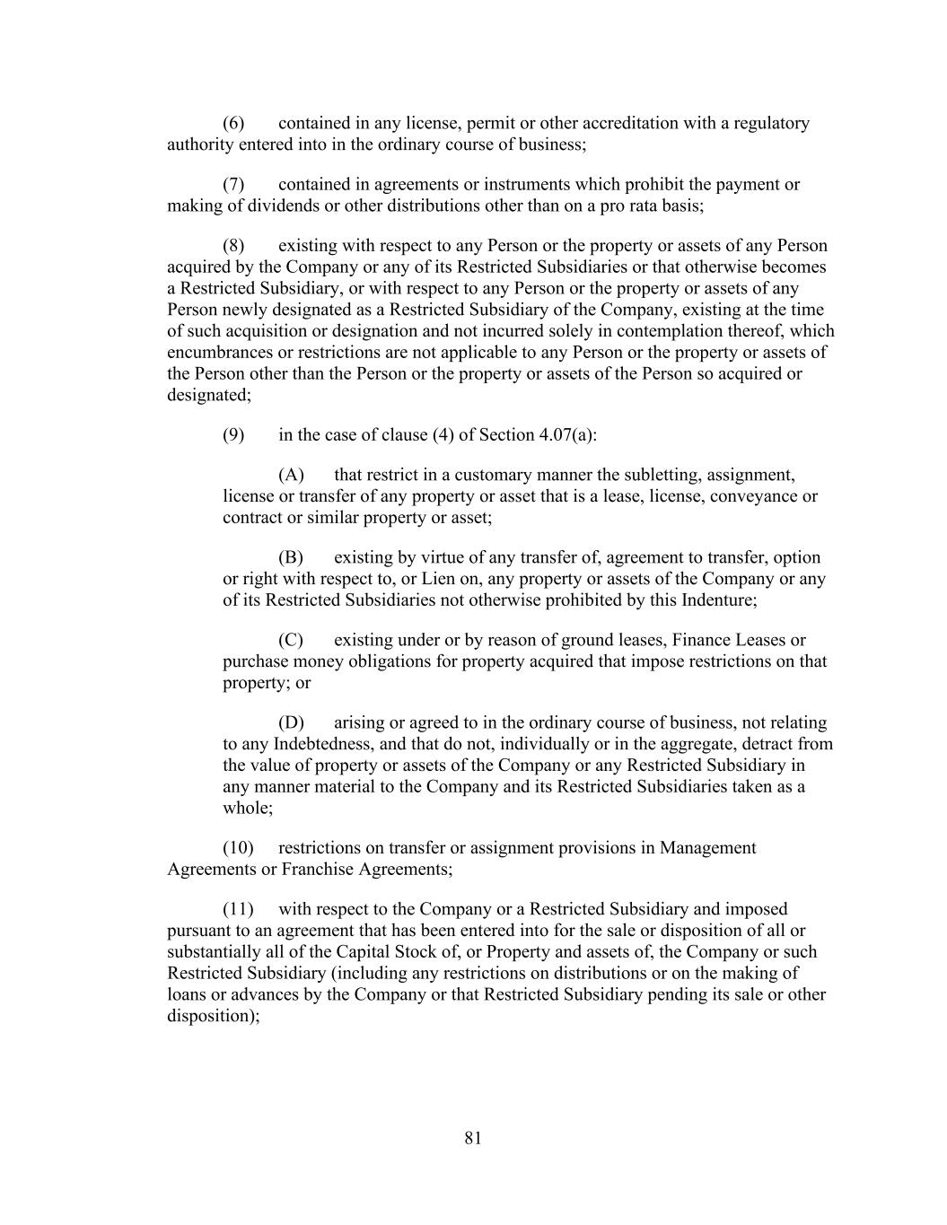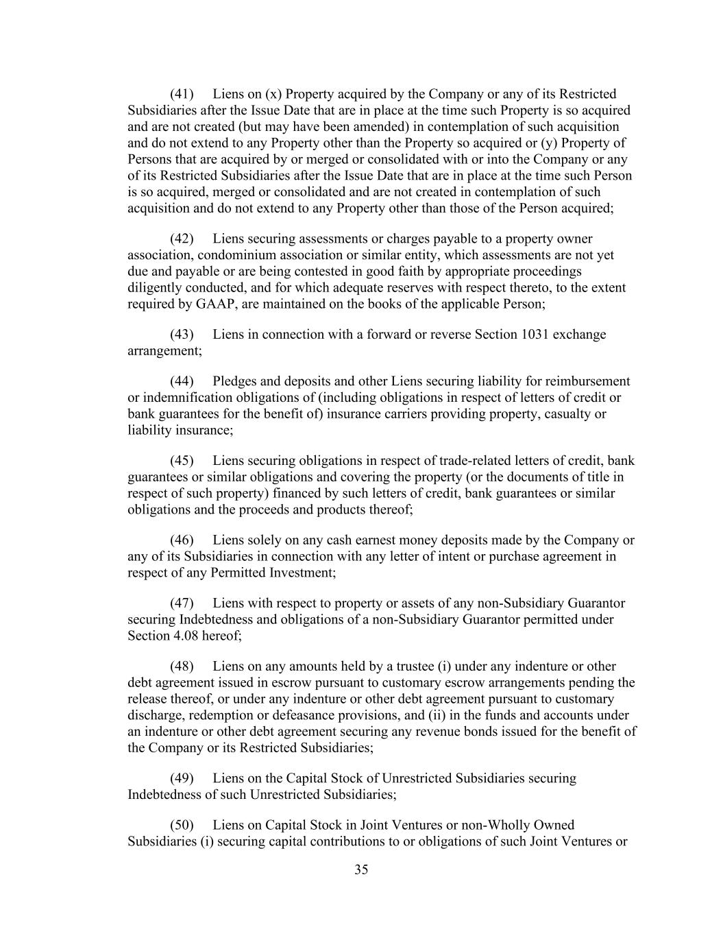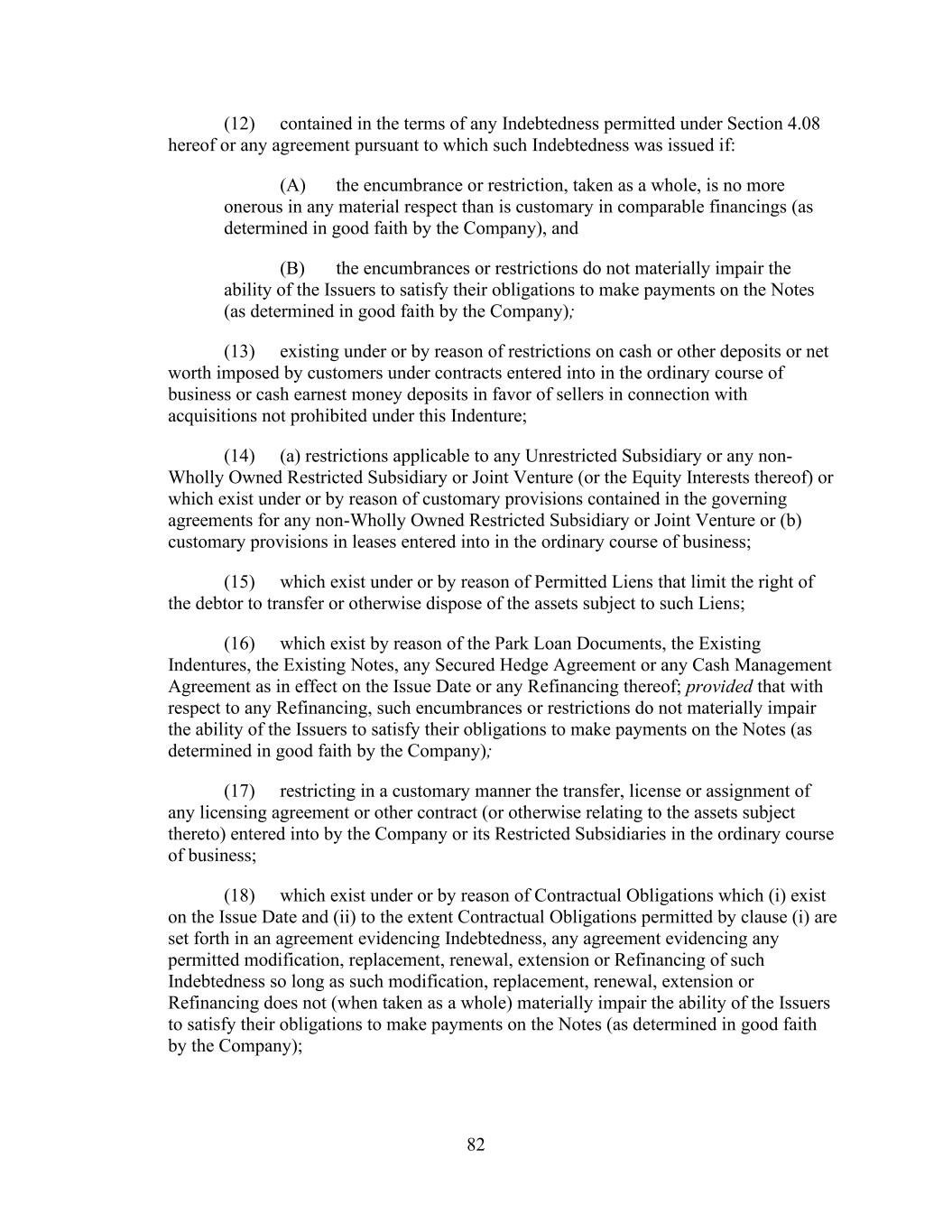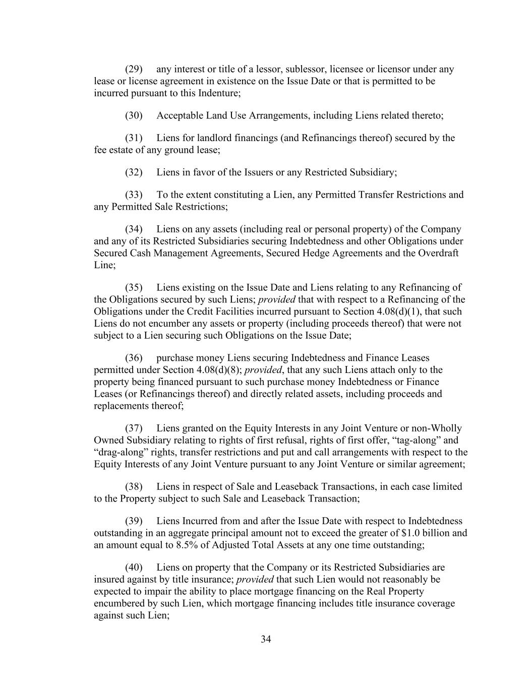 - 123 - Documents (as determined in good faith by the Company), (D) relating to Indebtedness secured by a Lien on assets that is not otherwise prohibited under Sections 9.2.(a), (c)(i) or (c)(ii); provided that the encumbrances and restrictions apply only to the Subsidiary or the assets that are the subject of such Lien, (E) contained in the organizational documents or other agreements binding on or applicable to any Excluded Subsidiary, Foreign Subsidiary or any Subsidiary that is not a Wholly Owned Subsidiary (but only to the extent such encumbrance or restriction covers any direct or indirect Equity Interest in such Subsidiary or the property or assets of such Subsidiary), (F) imposed by Applicable Law, (G) contained in an agreement that governs an Investment in, or other agreement binding on, an Unconsolidated Affiliate (but only to the extent such encumbrance or restriction applies to any direct or indirect Equity Interest in such Unconsolidated Affiliate), (H) other than in respect of any Eligible Property Subsidiary, Permitted JV/Mortgage Restrictions or (I) Permitted Transfer Restrictions, and (ii) with respect to clauses (a) and (d), customary provisions restricting assignment of any agreement, lease, license, permit or other contract entered into by the Company or any of their Subsidiaries in the ordinary course of business. Section 9.4. Merger, Consolidation, Sales of Assets and Other Arrangements. The Company shall not, and shall not permit any other Loan Party or any other Subsidiary to: (a) merge or consolidate; (b) liquidate, windup or dissolve itself (or suffer any liquidation or dissolution) or (c) convey, sell, lease, sublease, transfer or otherwise dispose of, in one transaction or a series of transactions and whether effected pursuant to a Division or otherwise, assets, or the capital stock of or other Equity Interests in any of its Subsidiaries having a fair market value in excess of a Substantial Amount, whether now owned or hereafter acquired; provided, however, that: (i) the Parent or any Subsidiary may enter into any transaction of merger or consolidation with or into any other Subsidiary or any other Person; provided, however, that: (A) (1) immediately prior to entering into such transaction no Default or Event of Default shall exist and (2) at the time of, and immediately thereafter and after giving effect to such transaction no Event of Default arising under Section 10.1.(a), (e) or (f) shall have occurred and be continuing, nor, as the result of the occurrence of any other Event of Default, have the Obligations been accelerated pursuant to Section 10.2.; (B) in the case of any merger or consolidation involving (1) any Borrower, such Borrower shall be the surviving entity; (2) the Parent (other than with any Borrower or any Subsidiary Guarantor), the Parent shall be the surviving entity; or (3) any Subsidiary Guarantor (other than with any Borrower), the surviving entity shall be a Guarantor or shall become a Guarantor in accordance with the applicable requirements of Section 7.13.; and (C) in the case of the entry into any transaction of merger or consolidation with a Person other than the Parent or a Subsidiary which transaction or series of related transactions shall have a fair market value in excess of a Substantial Amount, not later than the date on which such transaction is entered into: (1) the Company shall have given the Administrative Agent and the Lenders written notice of the entry into such transaction; and (2) the Company shall have delivered to the Administrative Agent a Compliance Certificate, calculated on a pro forma basis, evidencing the continued compliance by the Loan Parties with the financial covenants contained in Section 9.1., after giving effect to such transaction or series of transactions; provided, however, that in the event that the obligation of the Parent or any Subsidiary to consummate such transaction is subject to a financing condition or the obtaining of the requisite approval of the Lenders under this
