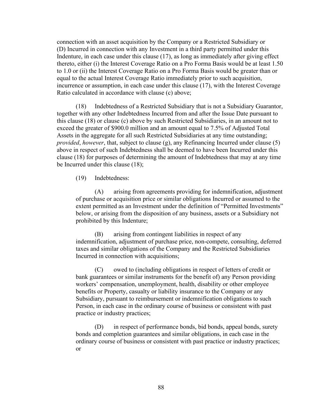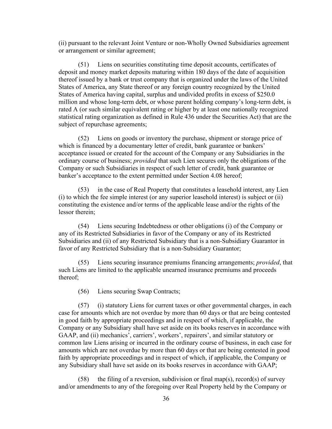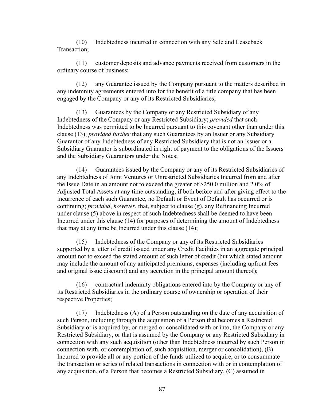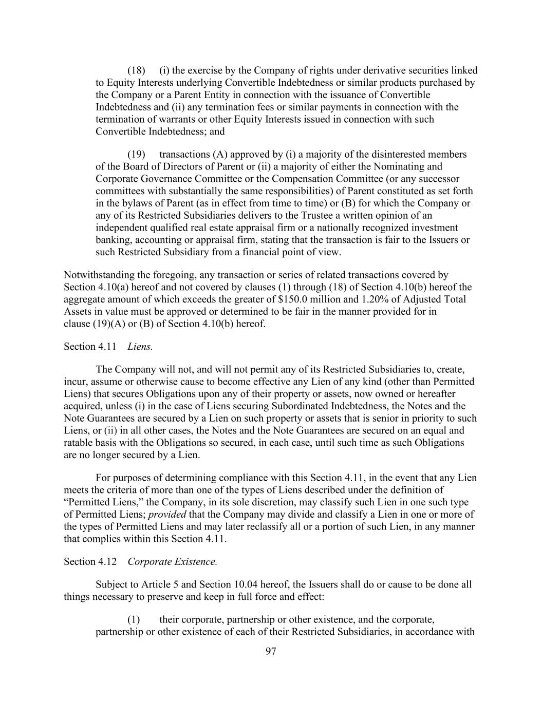 - 123 - Documents (as determined in good faith by the Company), (D) relating to Indebtedness secured by a Lien on assets that is not otherwise prohibited under Sections 9.2.(a), (c)(i) or (c)(ii); provided that the encumbrances and restrictions apply only to the Subsidiary or the assets that are the subject of such Lien, (E) contained in the organizational documents or other agreements binding on or applicable to any Excluded Subsidiary, Foreign Subsidiary or any Subsidiary that is not a Wholly Owned Subsidiary (but only to the extent such encumbrance or restriction covers any direct or indirect Equity Interest in such Subsidiary or the property or assets of such Subsidiary), (F) imposed by Applicable Law, (G) contained in an agreement that governs an Investment in, or other agreement binding on, an Unconsolidated Affiliate (but only to the extent such encumbrance or restriction applies to any direct or indirect Equity Interest in such Unconsolidated Affiliate), (H) other than in respect of any Eligible Property Subsidiary, Permitted JV/Mortgage Restrictions or (I) Permitted Transfer Restrictions, and (ii) with respect to clauses (a) and (d), customary provisions restricting assignment of any agreement, lease, license, permit or other contract entered into by the Company or any of their Subsidiaries in the ordinary course of business. Section 9.4. Merger, Consolidation, Sales of Assets and Other Arrangements. The Company shall not, and shall not permit any other Loan Party or any other Subsidiary to: (a) merge or consolidate; (b) liquidate, windup or dissolve itself (or suffer any liquidation or dissolution) or (c) convey, sell, lease, sublease, transfer or otherwise dispose of, in one transaction or a series of transactions and whether effected pursuant to a Division or otherwise, assets, or the capital stock of or other Equity Interests in any of its Subsidiaries having a fair market value in excess of a Substantial Amount, whether now owned or hereafter acquired; provided, however, that: (i) the Parent or any Subsidiary may enter into any transaction of merger or consolidation with or into any other Subsidiary or any other Person; provided, however, that: (A) (1) immediately prior to entering into such transaction no Default or Event of Default shall exist and (2) at the time of, and immediately thereafter and after giving effect to such transaction no Event of Default arising under Section 10.1.(a), (e) or (f) shall have occurred and be continuing, nor, as the result of the occurrence of any other Event of Default, have the Obligations been accelerated pursuant to Section 10.2.; (B) in the case of any merger or consolidation involving (1) any Borrower, such Borrower shall be the surviving entity; (2) the Parent (other than with any Borrower or any Subsidiary Guarantor), the Parent shall be the surviving entity; or (3) any Subsidiary Guarantor (other than with any Borrower), the surviving entity shall be a Guarantor or shall become a Guarantor in accordance with the applicable requirements of Section 7.13.; and (C) in the case of the entry into any transaction of merger or consolidation with a Person other than the Parent or a Subsidiary which transaction or series of related transactions shall have a fair market value in excess of a Substantial Amount, not later than the date on which such transaction is entered into: (1) the Company shall have given the Administrative Agent and the Lenders written notice of the entry into such transaction; and (2) the Company shall have delivered to the Administrative Agent a Compliance Certificate, calculated on a pro forma basis, evidencing the continued compliance by the Loan Parties with the financial covenants contained in Section 9.1., after giving effect to such transaction or series of transactions; provided, however, that in the event that the obligation of the Parent or any Subsidiary to consummate such transaction is subject to a financing condition or the obtaining of the requisite approval of the Lenders under this