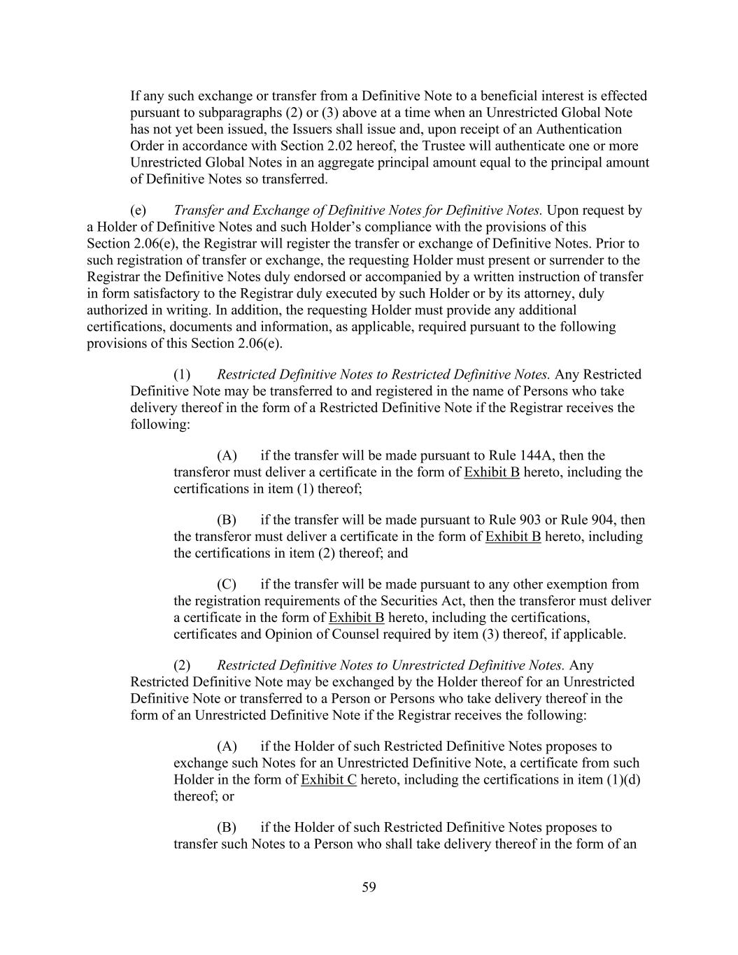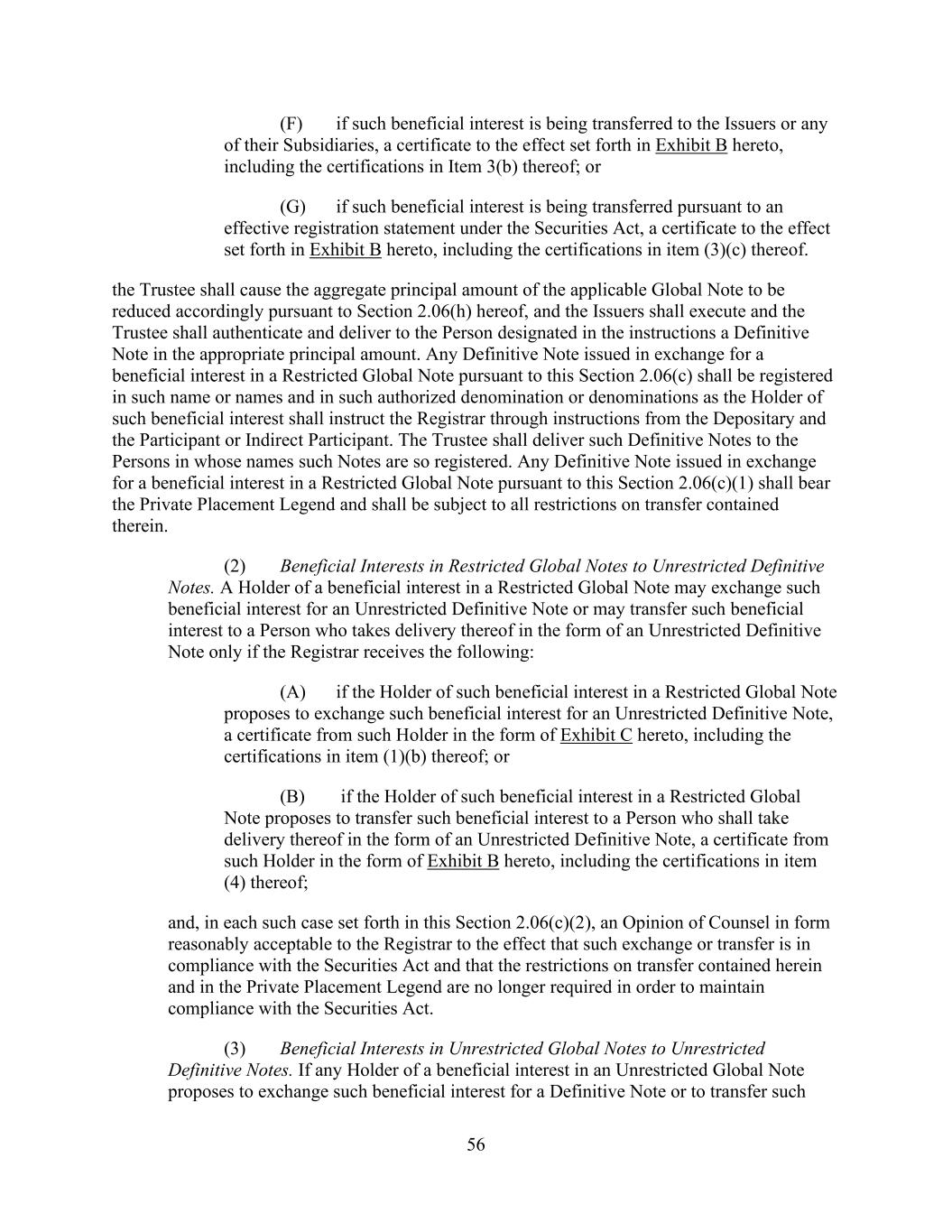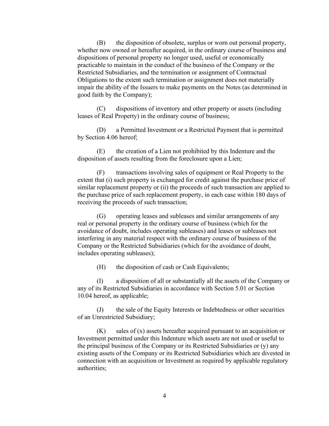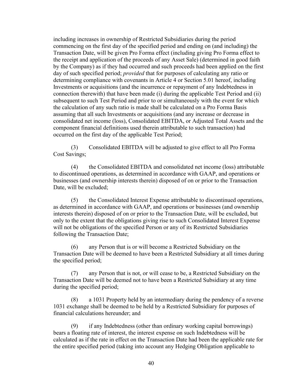 - 123 - Documents (as determined in good faith by the Company), (D) relating to Indebtedness secured by a Lien on assets that is not otherwise prohibited under Sections 9.2.(a), (c)(i) or (c)(ii); provided that the encumbrances and restrictions apply only to the Subsidiary or the assets that are the subject of such Lien, (E) contained in the organizational documents or other agreements binding on or applicable to any Excluded Subsidiary, Foreign Subsidiary or any Subsidiary that is not a Wholly Owned Subsidiary (but only to the extent such encumbrance or restriction covers any direct or indirect Equity Interest in such Subsidiary or the property or assets of such Subsidiary), (F) imposed by Applicable Law, (G) contained in an agreement that governs an Investment in, or other agreement binding on, an Unconsolidated Affiliate (but only to the extent such encumbrance or restriction applies to any direct or indirect Equity Interest in such Unconsolidated Affiliate), (H) other than in respect of any Eligible Property Subsidiary, Permitted JV/Mortgage Restrictions or (I) Permitted Transfer Restrictions, and (ii) with respect to clauses (a) and (d), customary provisions restricting assignment of any agreement, lease, license, permit or other contract entered into by the Company or any of their Subsidiaries in the ordinary course of business. Section 9.4. Merger, Consolidation, Sales of Assets and Other Arrangements. The Company shall not, and shall not permit any other Loan Party or any other Subsidiary to: (a) merge or consolidate; (b) liquidate, windup or dissolve itself (or suffer any liquidation or dissolution) or (c) convey, sell, lease, sublease, transfer or otherwise dispose of, in one transaction or a series of transactions and whether effected pursuant to a Division or otherwise, assets, or the capital stock of or other Equity Interests in any of its Subsidiaries having a fair market value in excess of a Substantial Amount, whether now owned or hereafter acquired; provided, however, that: (i) the Parent or any Subsidiary may enter into any transaction of merger or consolidation with or into any other Subsidiary or any other Person; provided, however, that: (A) (1) immediately prior to entering into such transaction no Default or Event of Default shall exist and (2) at the time of, and immediately thereafter and after giving effect to such transaction no Event of Default arising under Section 10.1.(a), (e) or (f) shall have occurred and be continuing, nor, as the result of the occurrence of any other Event of Default, have the Obligations been accelerated pursuant to Section 10.2.; (B) in the case of any merger or consolidation involving (1) any Borrower, such Borrower shall be the surviving entity; (2) the Parent (other than with any Borrower or any Subsidiary Guarantor), the Parent shall be the surviving entity; or (3) any Subsidiary Guarantor (other than with any Borrower), the surviving entity shall be a Guarantor or shall become a Guarantor in accordance with the applicable requirements of Section 7.13.; and (C) in the case of the entry into any transaction of merger or consolidation with a Person other than the Parent or a Subsidiary which transaction or series of related transactions shall have a fair market value in excess of a Substantial Amount, not later than the date on which such transaction is entered into: (1) the Company shall have given the Administrative Agent and the Lenders written notice of the entry into such transaction; and (2) the Company shall have delivered to the Administrative Agent a Compliance Certificate, calculated on a pro forma basis, evidencing the continued compliance by the Loan Parties with the financial covenants contained in Section 9.1., after giving effect to such transaction or series of transactions; provided, however, that in the event that the obligation of the Parent or any Subsidiary to consummate such transaction is subject to a financing condition or the obtaining of the requisite approval of the Lenders under this