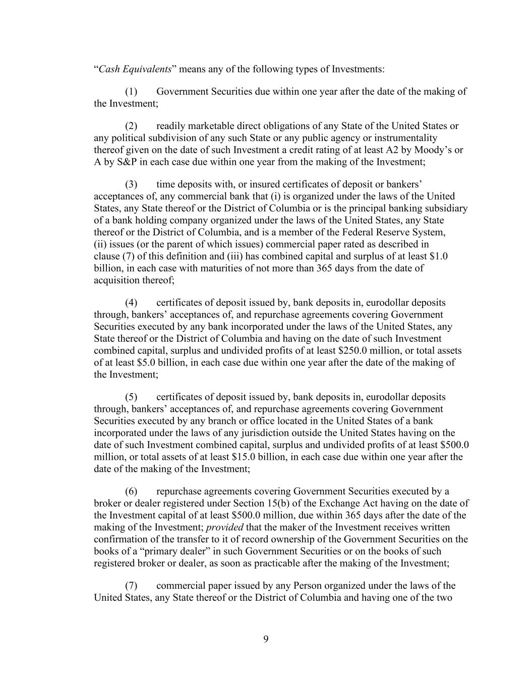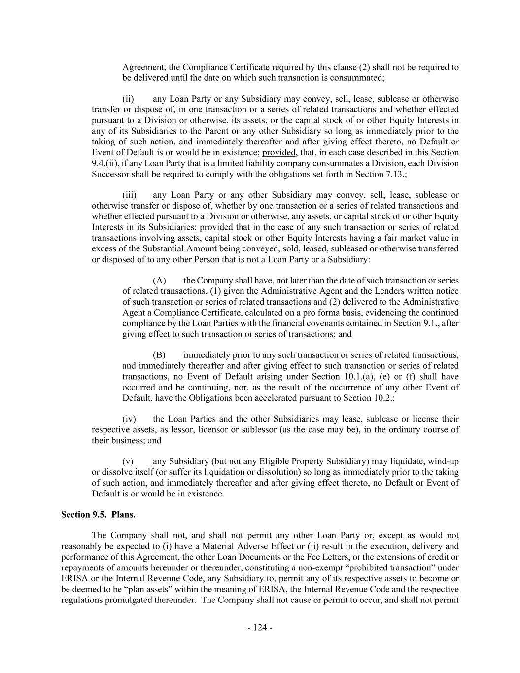 - 124 - Agreement, the Compliance Certificate required by this clause (2) shall not be required to be delivered until the date on which such transaction is consummated; (ii) any Loan Party or any Subsidiary may convey, sell, lease, sublease or otherwise transfer or dispose of, in one transaction or a series of related transactions and whether effected pursuant to a Division or otherwise, its assets, or the capital stock of or other Equity Interests in any of its Subsidiaries to the Parent or any other Subsidiary so long as immediately prior to the taking of such action, and immediately thereafter and after giving effect thereto, no Default or Event of Default is or would be in existence; provided, that, in each case described in this Section 9.4.(ii), if any Loan Party that is a limited liability company consummates a Division, each Division Successor shall be required to comply with the obligations set forth in Section 7.13.; (iii) any Loan Party or any other Subsidiary may convey, sell, lease, sublease or otherwise transfer or dispose of, whether by one transaction or a series of related transactions and whether effected pursuant to a Division or otherwise, any assets, or capital stock of or other Equity Interests in its Subsidiaries; provided that in the case of any such transaction or series of related transactions involving assets, capital stock or other Equity Interests having a fair market value in excess of the Substantial Amount being conveyed, sold, leased, subleased or otherwise transferred or disposed of to any other Person that is not a Loan Party or a Subsidiary: (A) the Company shall have, not later than the date of such transaction or series of related transactions, (1) given the Administrative Agent and the Lenders written notice of such transaction or series of related transactions and (2) delivered to the Administrative Agent a Compliance Certificate, calculated on a pro forma basis, evidencing the continued compliance by the Loan Parties with the financial covenants contained in Section 9.1., after giving effect to such transaction or series of transactions; and (B) immediately prior to any such transaction or series of related transactions, and immediately thereafter and after giving effect to such transaction or series of related transactions, no Event of Default arising under Section 10.1.(a), (e) or (f) shall have occurred and be continuing, nor, as the result of the occurrence of any other Event of Default, have the Obligations been accelerated pursuant to Section 10.2.; (iv) the Loan Parties and the other Subsidiaries may lease, sublease or license their respective assets, as lessor, licensor or sublessor (as the case may be), in the ordinary course of their business; and (v) any Subsidiary (but not any Eligible Property Subsidiary) may liquidate, wind-up or dissolve itself (or suffer its liquidation or dissolution) so long as immediately prior to the taking of such action, and immediately thereafter and after giving effect thereto, no Default or Event of Default is or would be in existence. Section 9.5. Plans. The Company shall not, and shall not permit any other Loan Party or, except as would not reasonably be expected to (i) have a Material Adverse Effect or (ii) result in the execution, delivery and performance of this Agreement, the other Loan Documents or the Fee Letters, or the extensions of credit or repayments of amounts hereunder or thereunder, constituting a non-exempt “prohibited transaction” under ERISA or the Internal Revenue Code, any Subsidiary to, permit any of its respective assets to become or be deemed to be “plan assets” within the meaning of ERISA, the Internal Revenue Code and the respective regulations promulgated thereunder. The Company shall not cause or permit to occur, and shall not permit